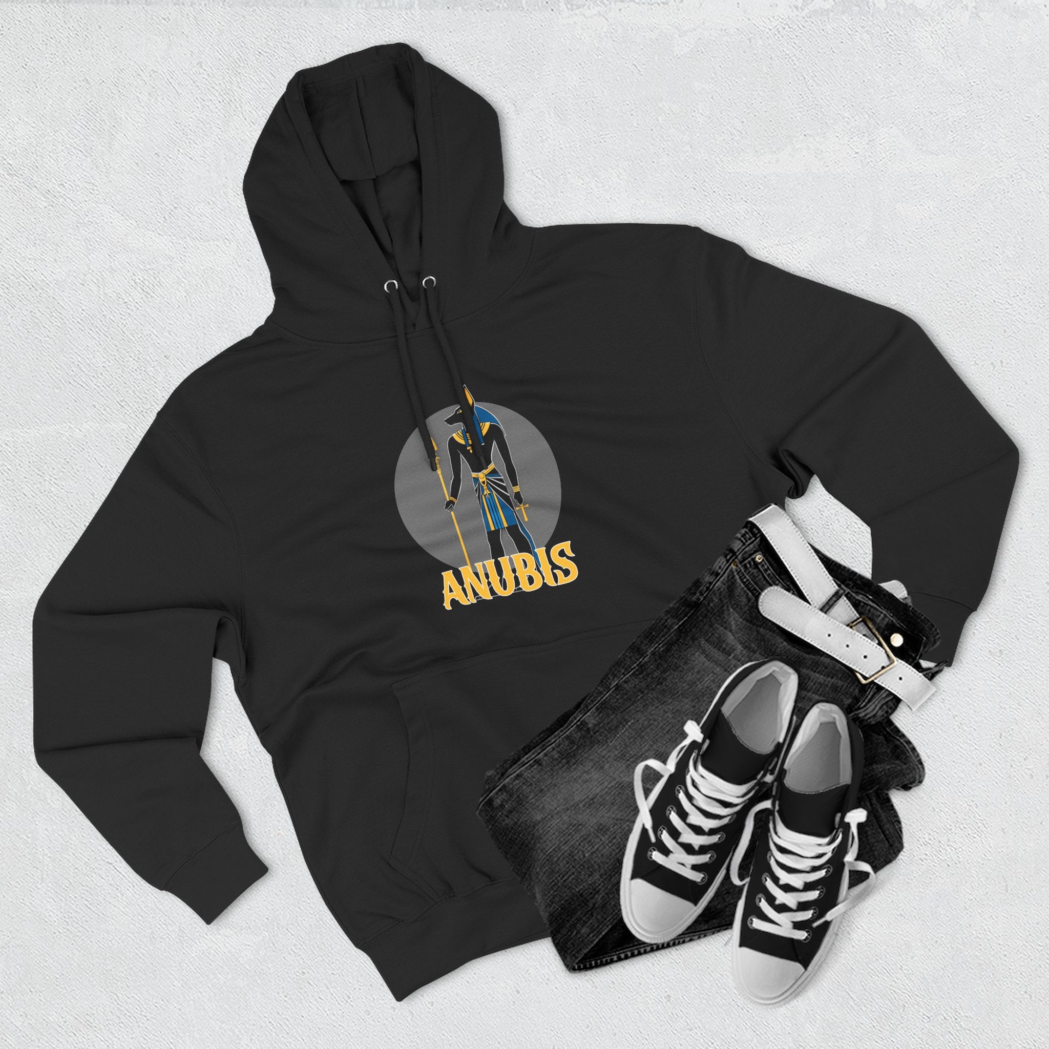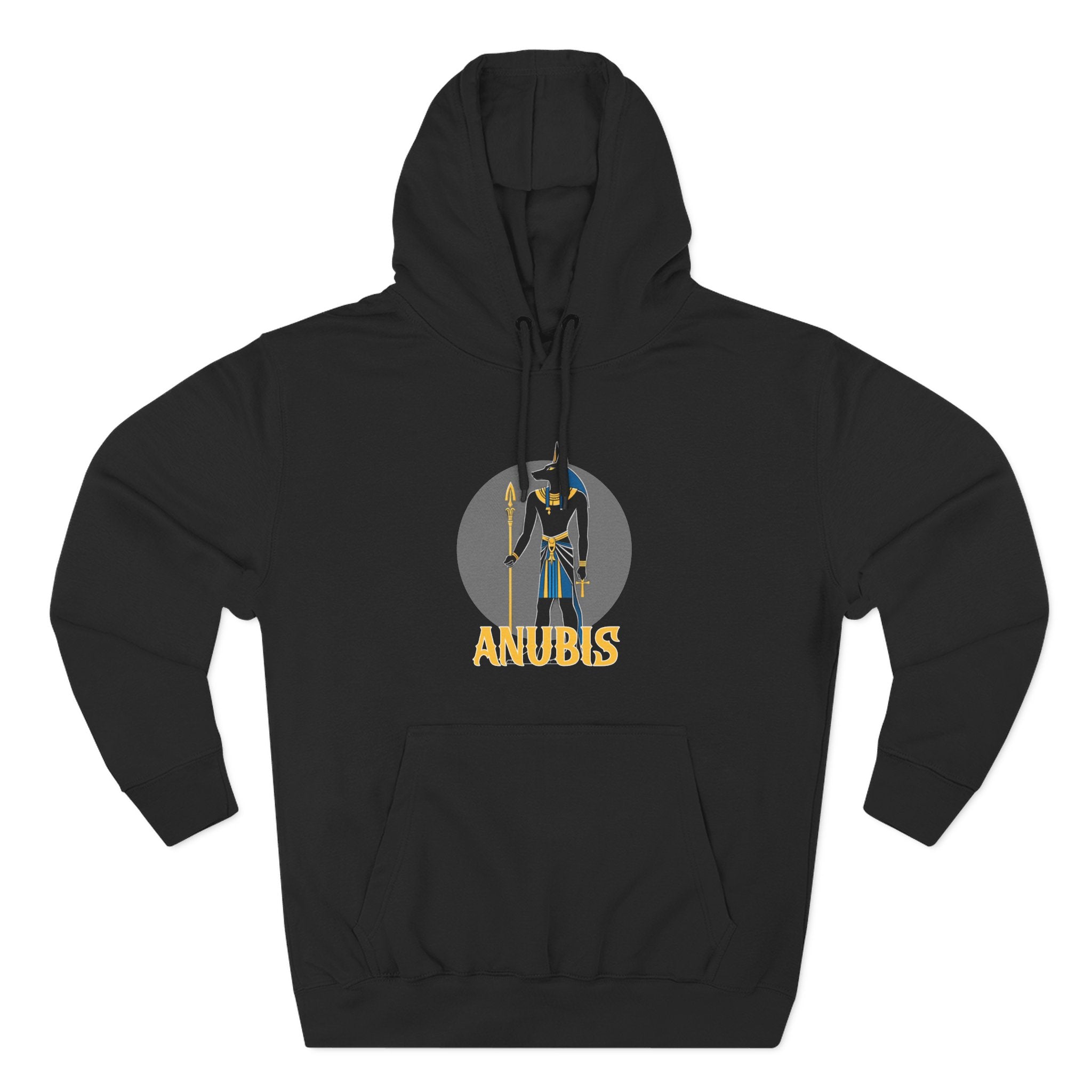 This striking hoodie features a detailed graphic of Anubis, the iconic ancient Egyptian god of mummification and the afterlife. Depicted with his distinctive jackal head, powerful human body, and traditional regalia, Anubis holds the powerful Was-scepter and the Ankh, symbols of dominion and eternal life. Set against a circular backdrop and adorned with bold "ANUBIS" lettering, this design is a tribute to one of Egypt's most mysterious and revered deities. Perfect for those who are drawn to ancient mythology, spiritual journeys, and a unique, culturally rich aesthetic. The design is powerful and eye-catching, making it a standout piece for any wardrobe.