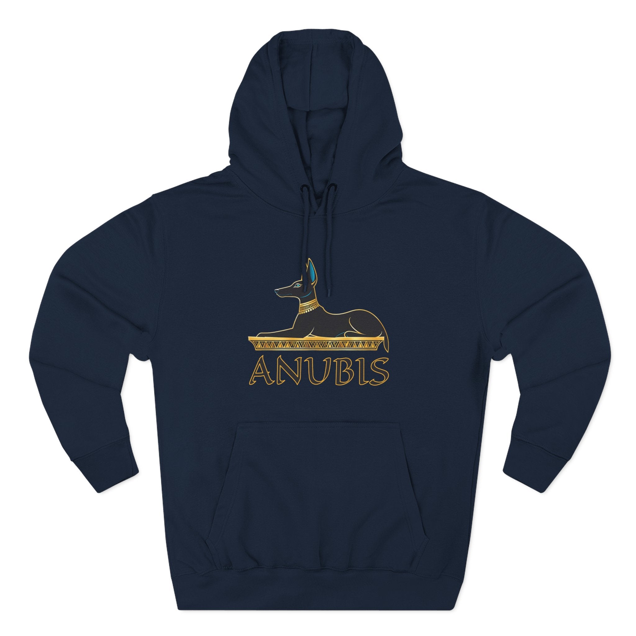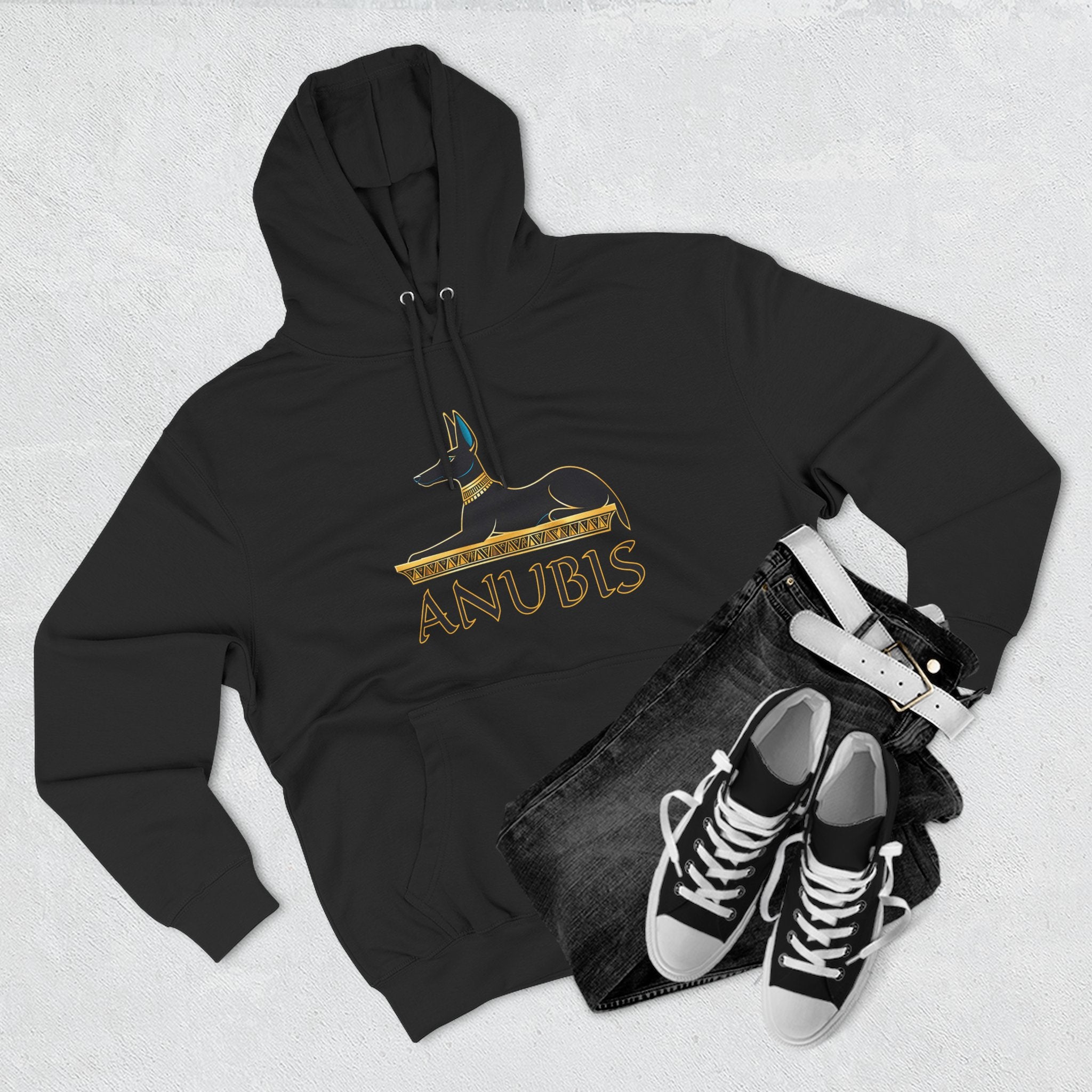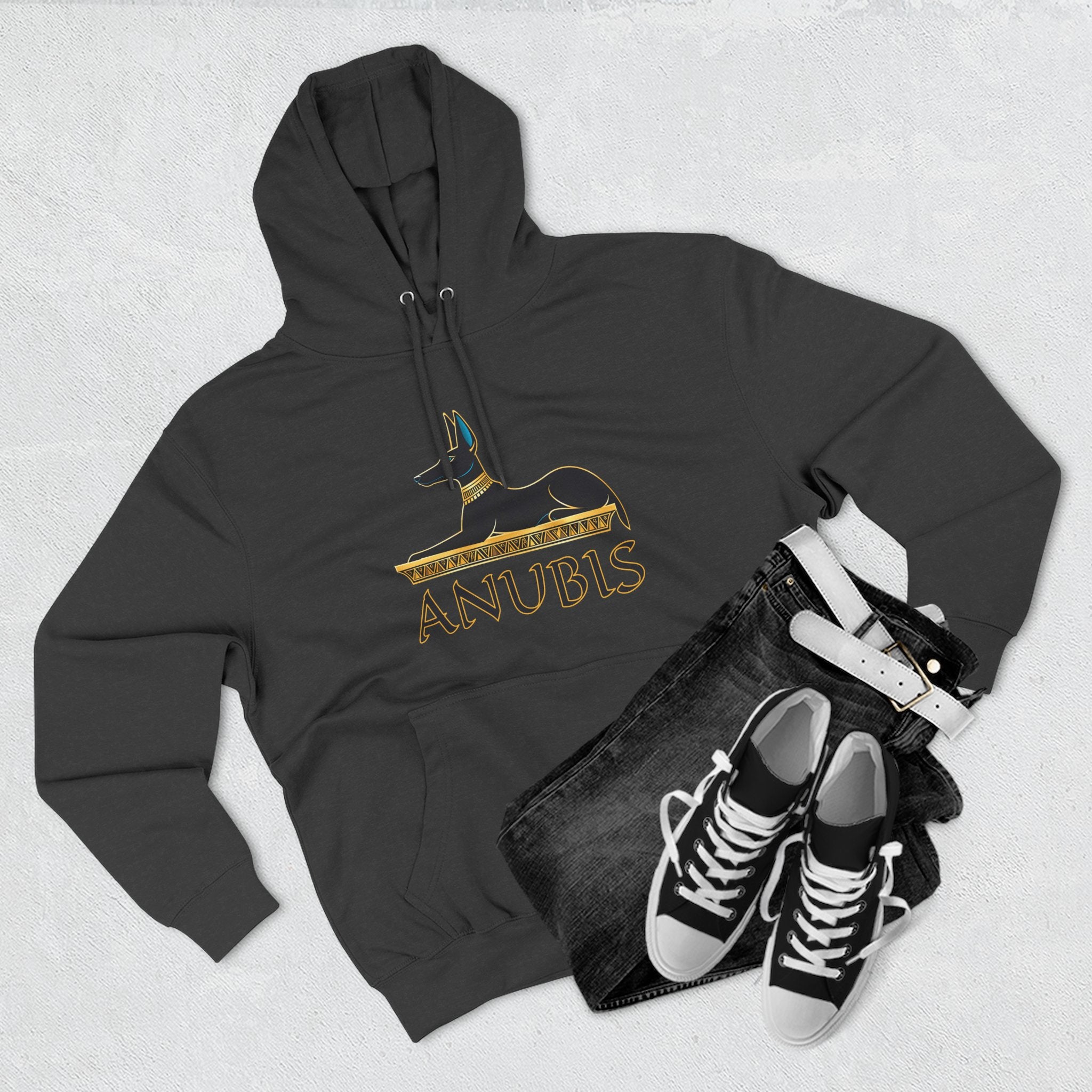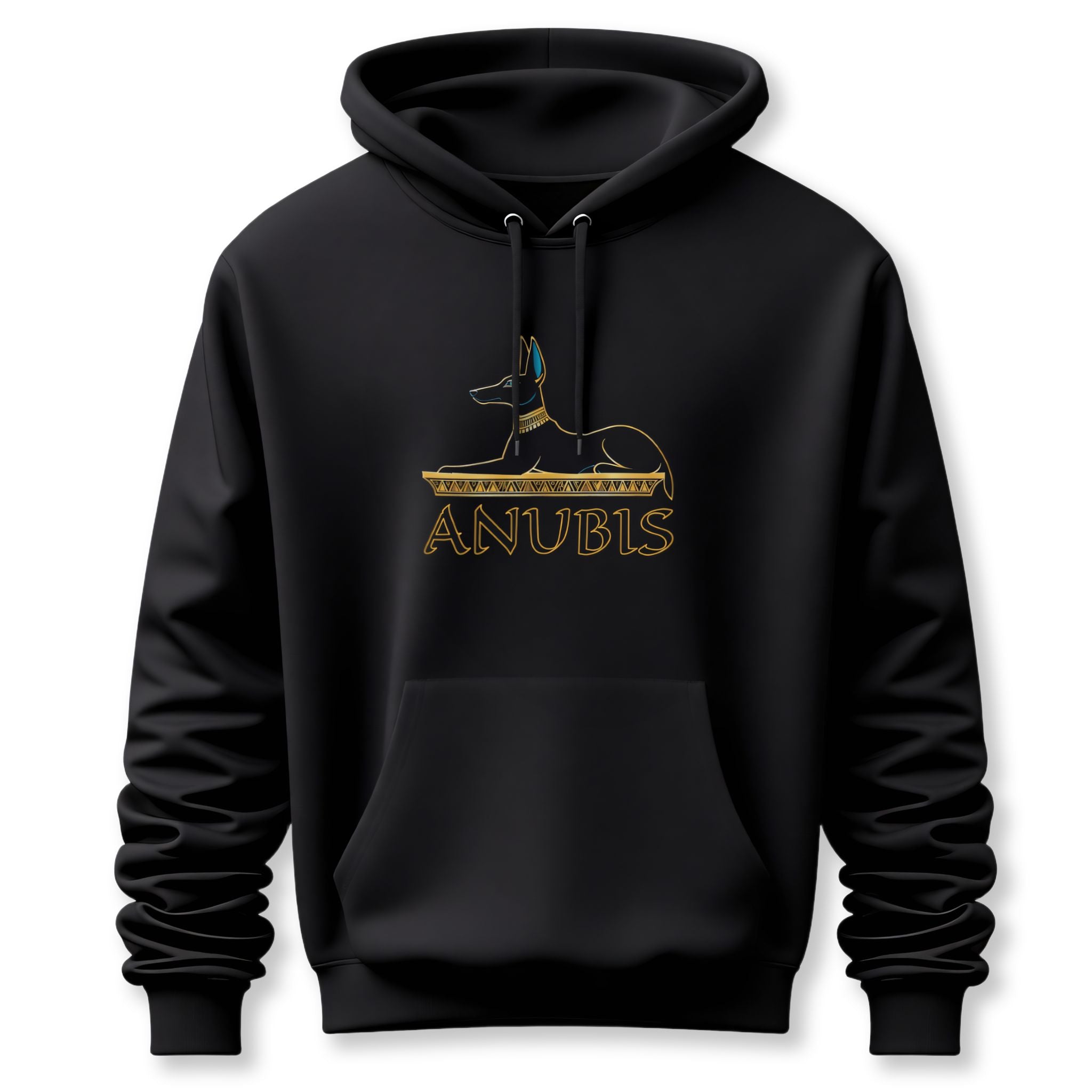 This hoodie features an elegant and stylized depiction of Anubis, the revered ancient Egyptian god of mummification and the afterlife. The jackal-headed deity is rendered in a regal black and gold outline, resting atop a hieroglyphic-inspired base, with his name 'ANUBIS' boldly displayed below in a classic Egyptian script. Anubis symbolizes guidance, protection in the spiritual journey, and the profound mysteries of the underworld, serving as a powerful guardian and a link to ancient wisdom. This unique graphic is perfect for those who are captivated by Egyptian mythology, powerful cultural symbolism, and a touch of ancient mystique. The design is both striking and culturally rich, making it a compelling statement piece for any wardrobe.