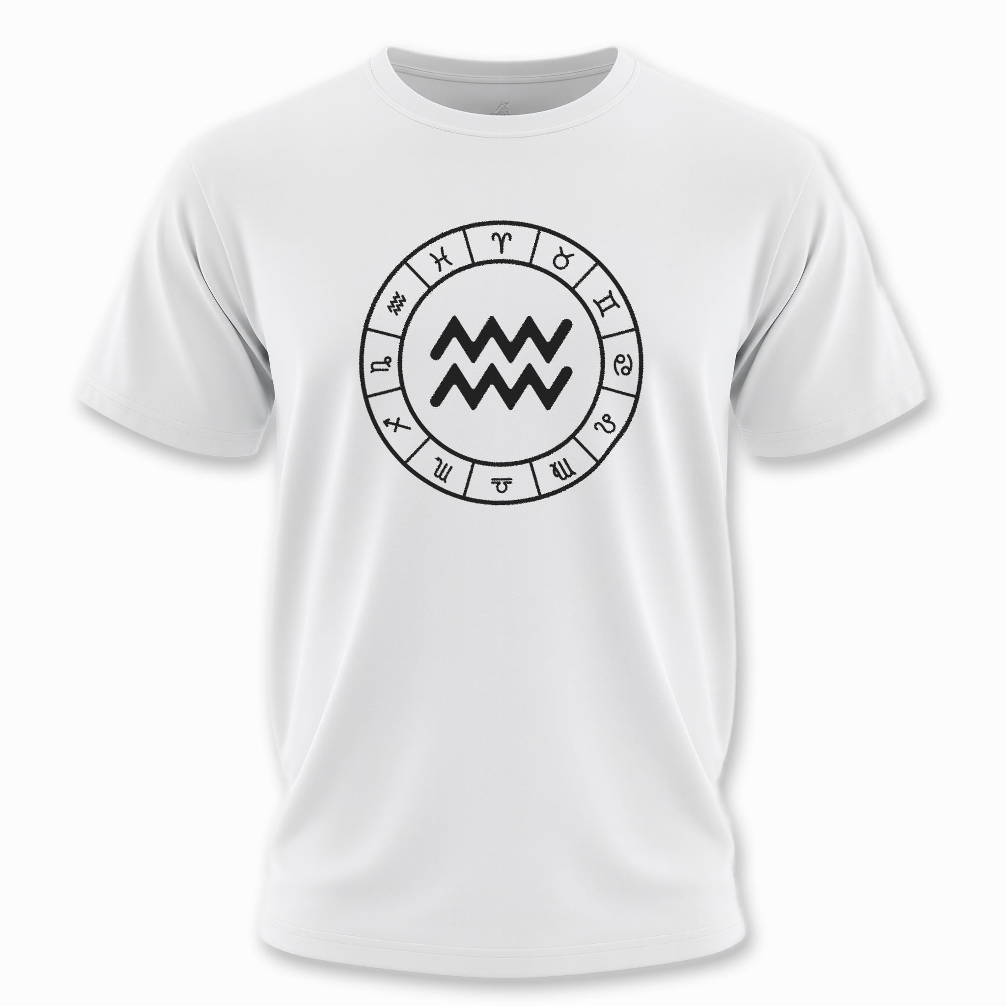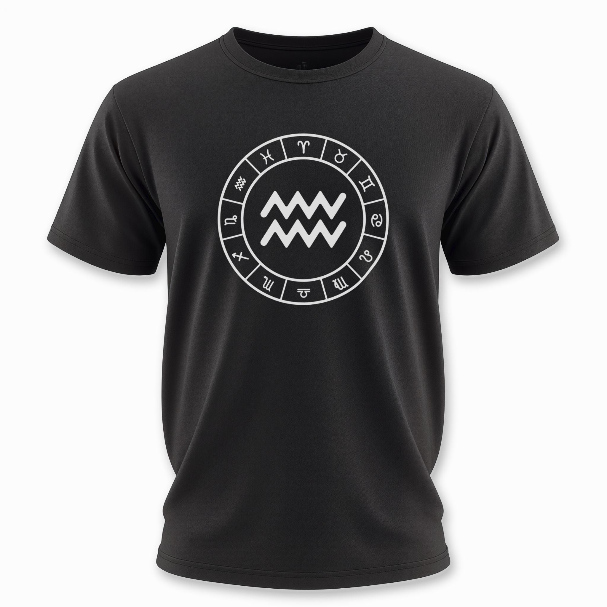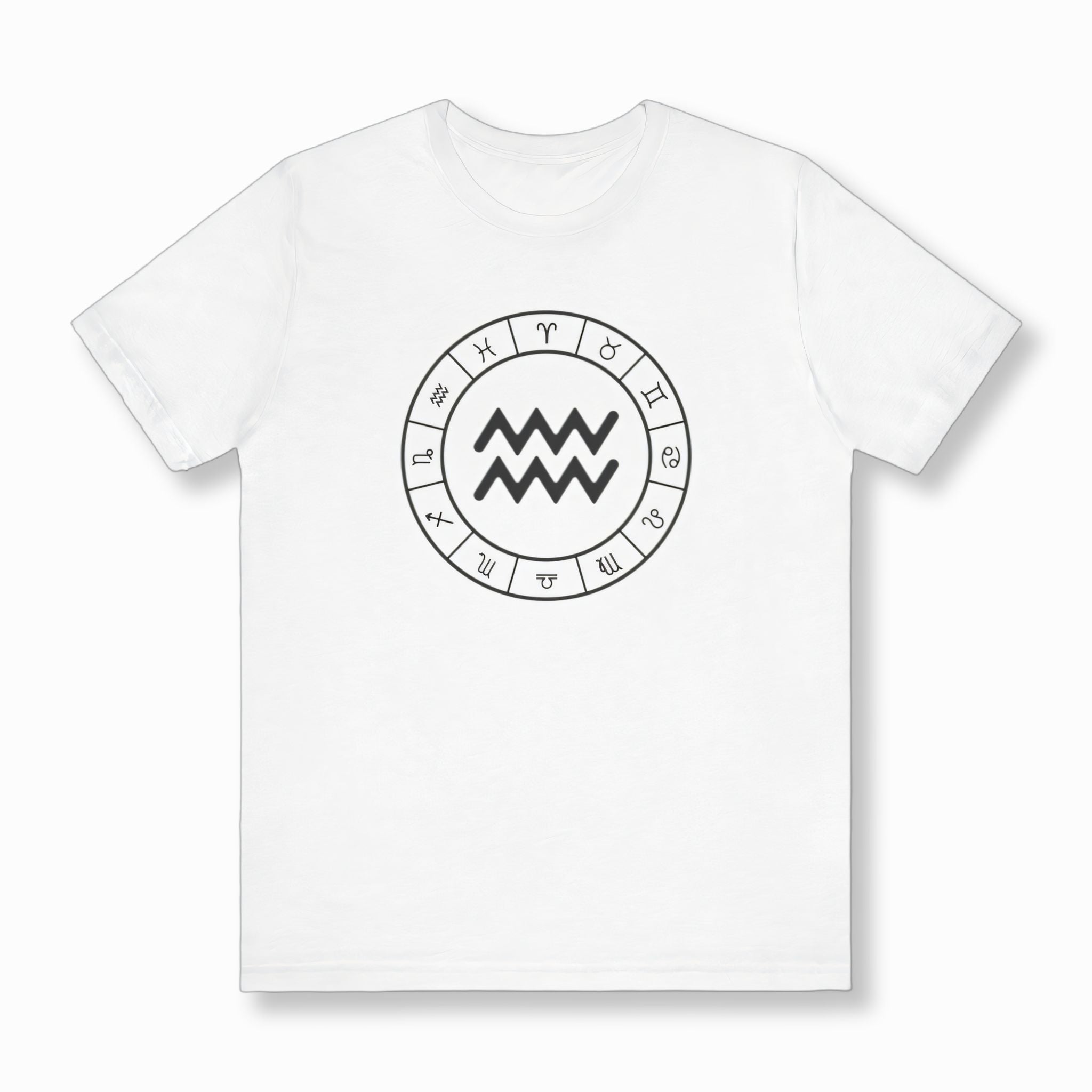 This t-shirt features a striking white graphic prominently displaying the Aquarius zodiac symbol, beautifully encircled by all twelve signs of the zodiac, all set against a classic black background. The central Aquarius symbol, representing the Water Bearer, embodies independence, innovation, and a humanitarian spirit, aligning with the forward-thinking and intellectual traits of the air sign. The surrounding zodiac wheel signifies cosmic harmony and the interconnectedness of all astrological influences. This elegant and meaningful design is perfect for those who connect with their astrological sign or appreciate celestial symbolism.