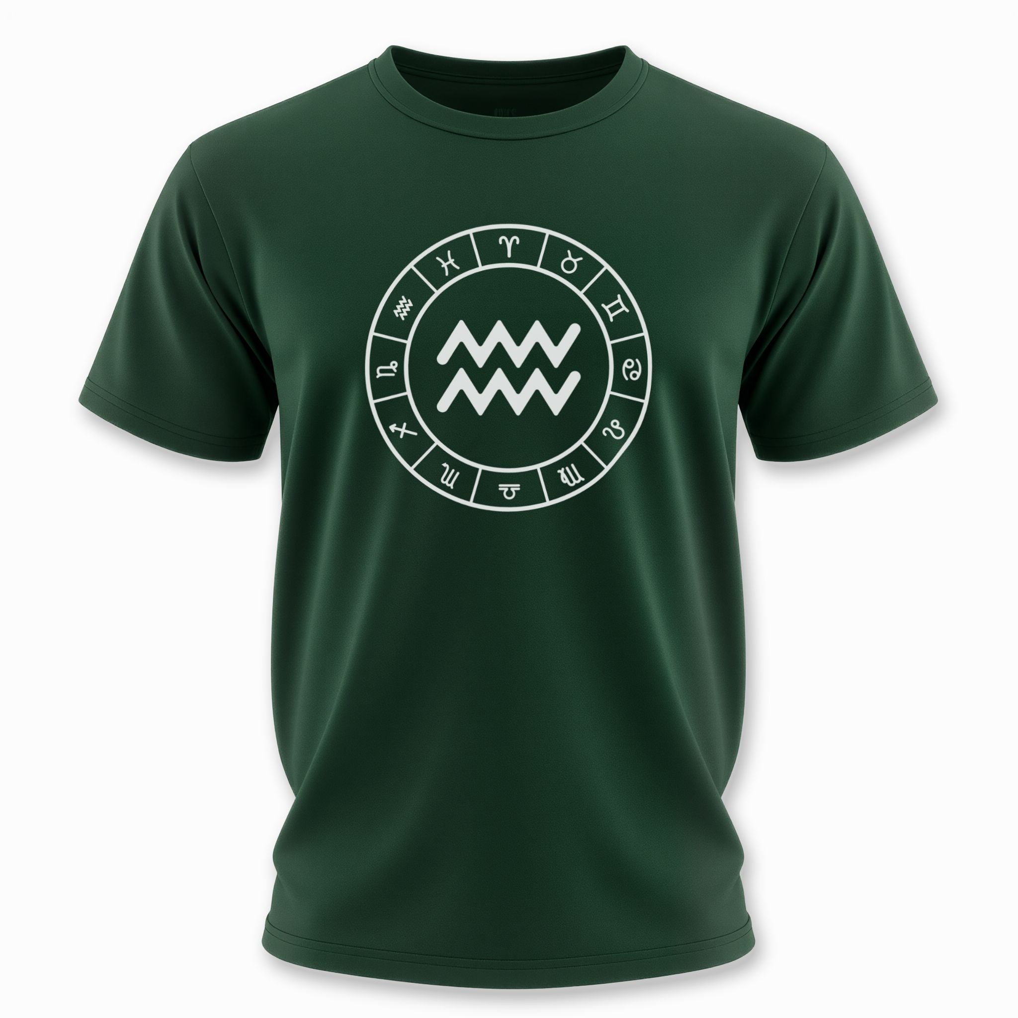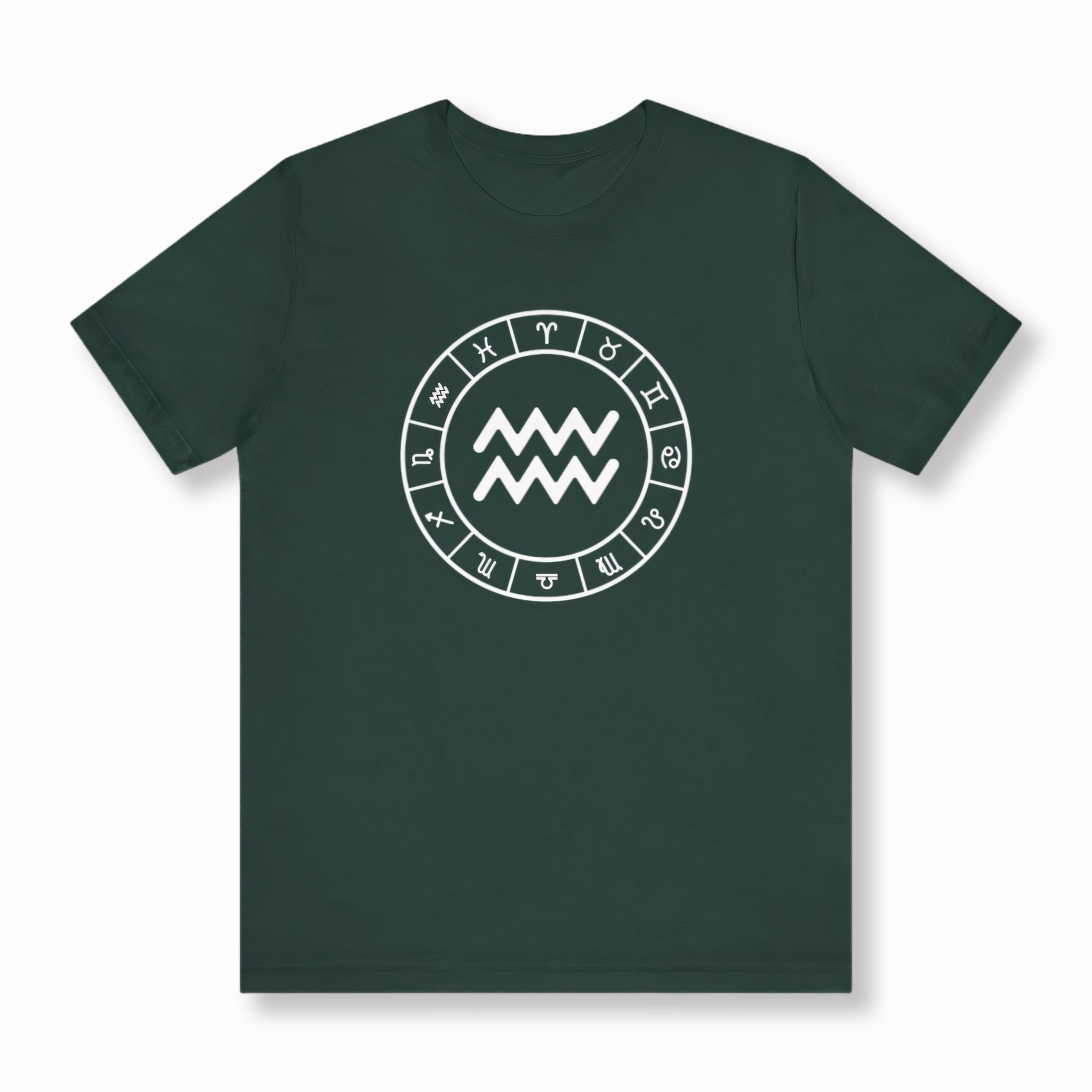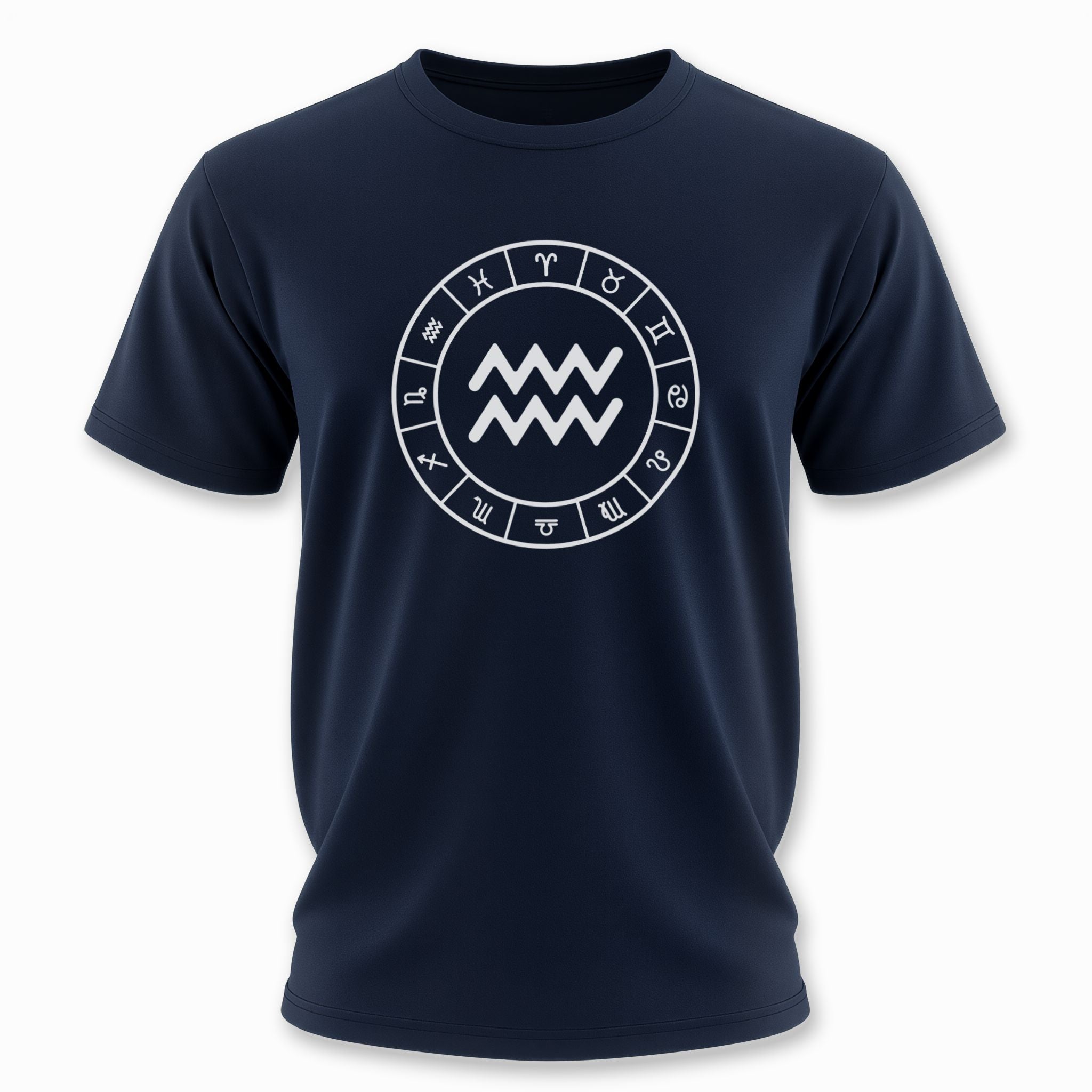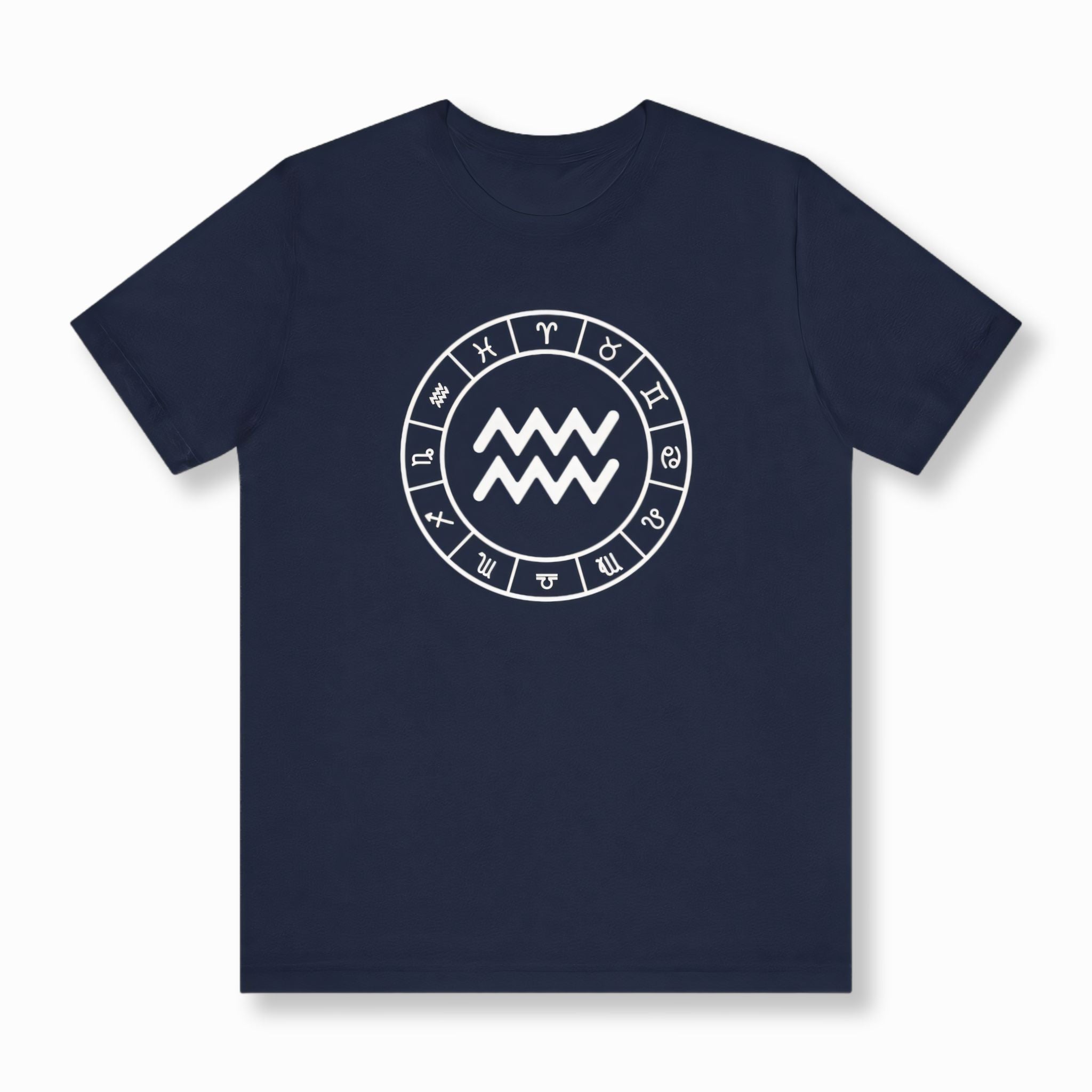 This t-shirt features a striking white graphic prominently displaying the Aquarius zodiac symbol, beautifully encircled by all twelve signs of the zodiac, all set against a classic black background. The central Aquarius symbol, representing the Water Bearer, embodies independence, innovation, and a humanitarian spirit, aligning with the forward-thinking and intellectual traits of the air sign. The surrounding zodiac wheel signifies cosmic harmony and the interconnectedness of all astrological influences. This elegant and meaningful design is perfect for those who connect with their astrological sign or appreciate celestial symbolism.
