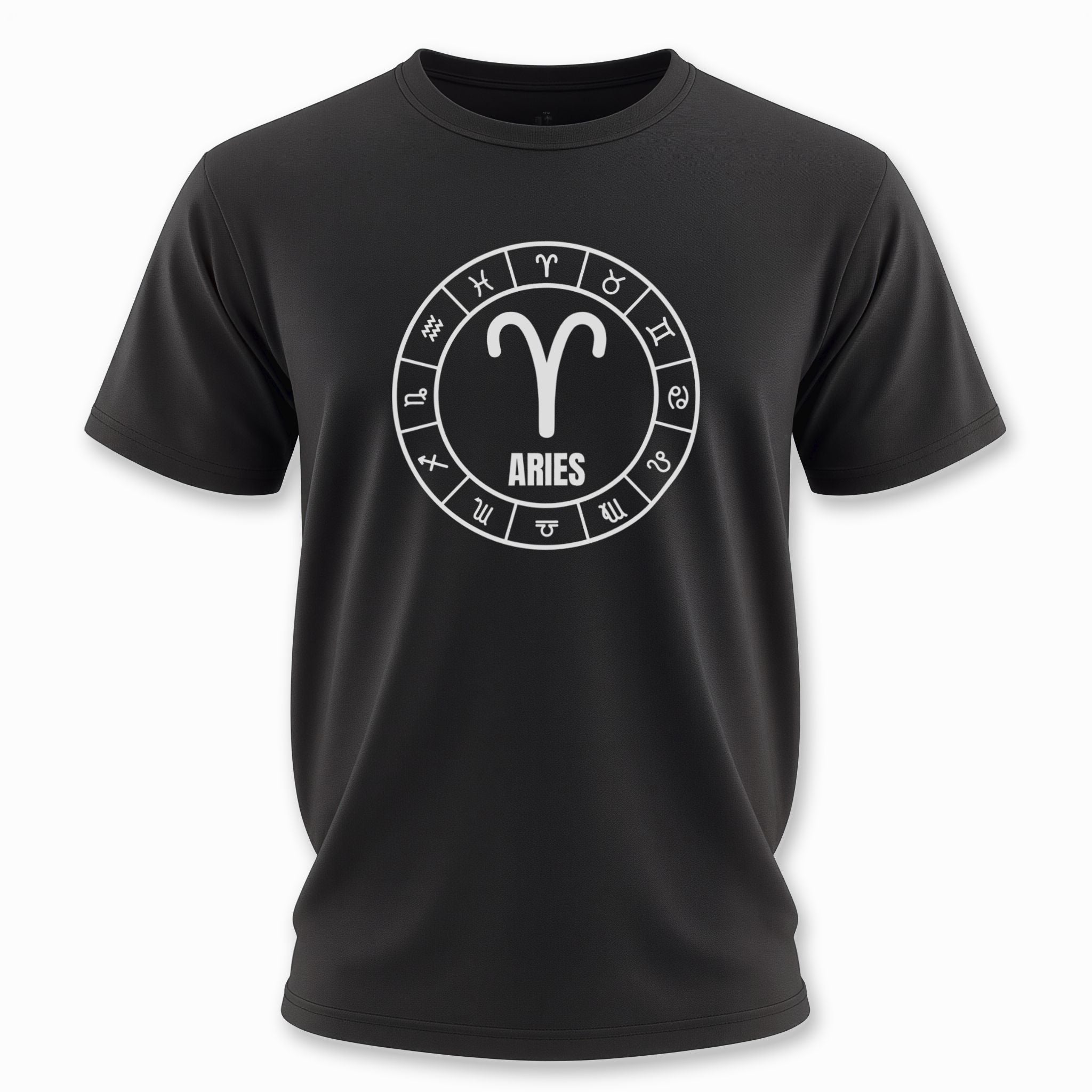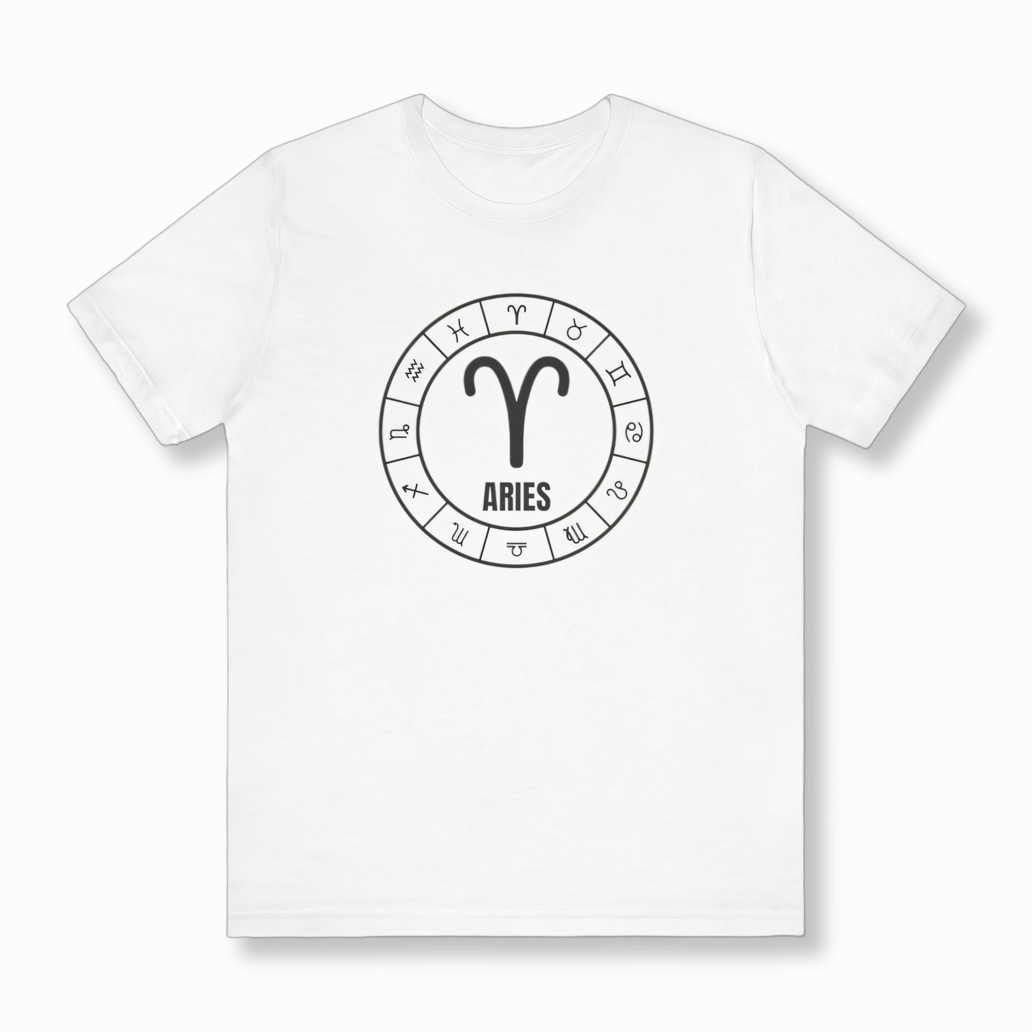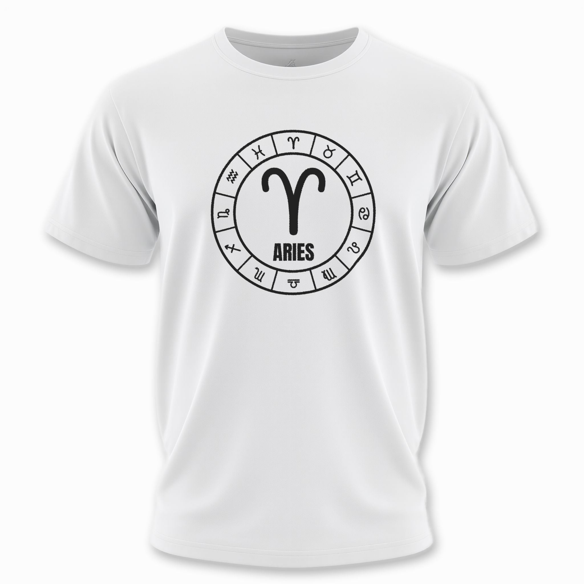 This t-shirt features a striking white graphic of the Aries zodiac symbol prominently centered within a complete wheel of all twelve astrological signs. The word 'ARIES' is boldly displayed beneath the central icon. The Aries symbol, representing the pioneering Ram, signifies courage, passion, and a fearless spirit. Encircling it, the full zodiac wheel speaks to the interconnectedness of the cosmos and the unique journey of each individual. Its clean lines and symbolic depth make it a unique and eye-catching statement piece for anyone who embraces their astrological roots or simply appreciates mystical designs.