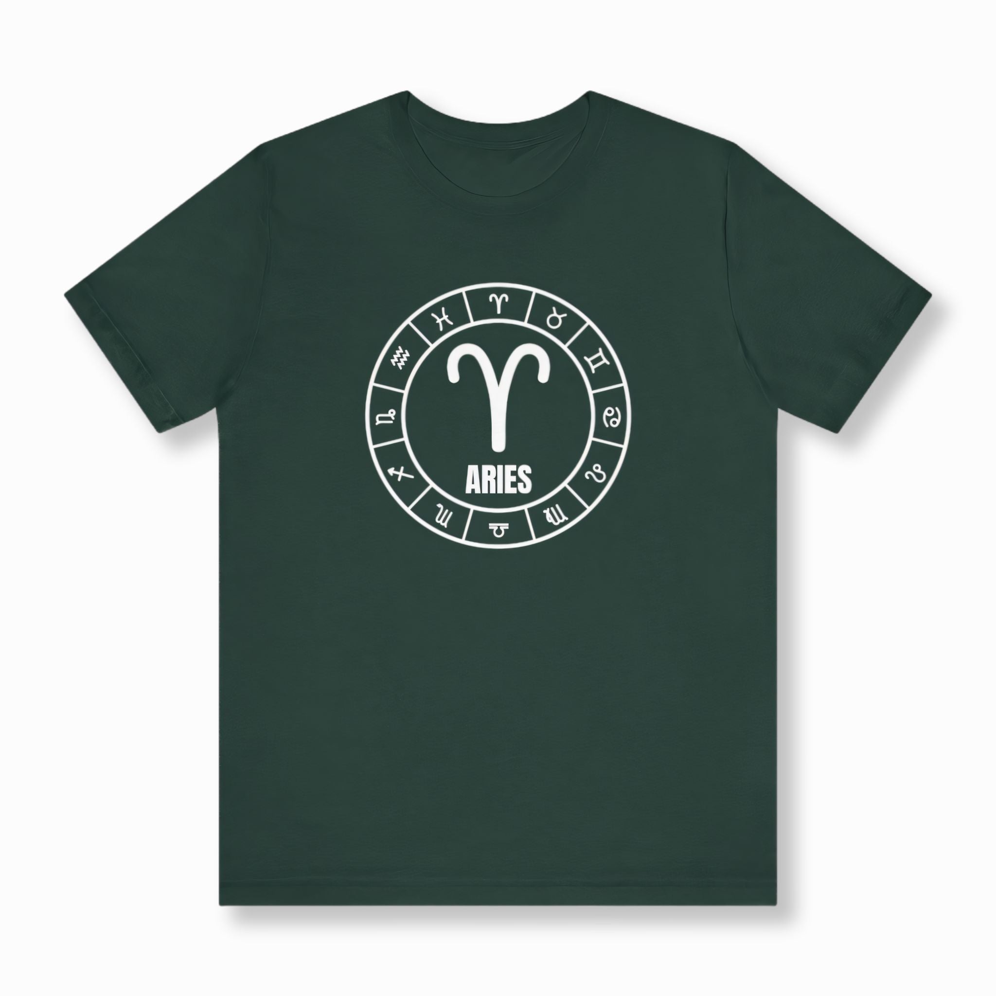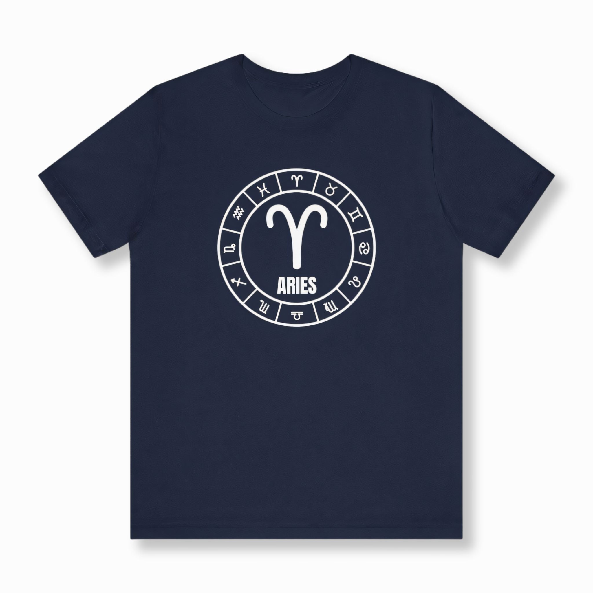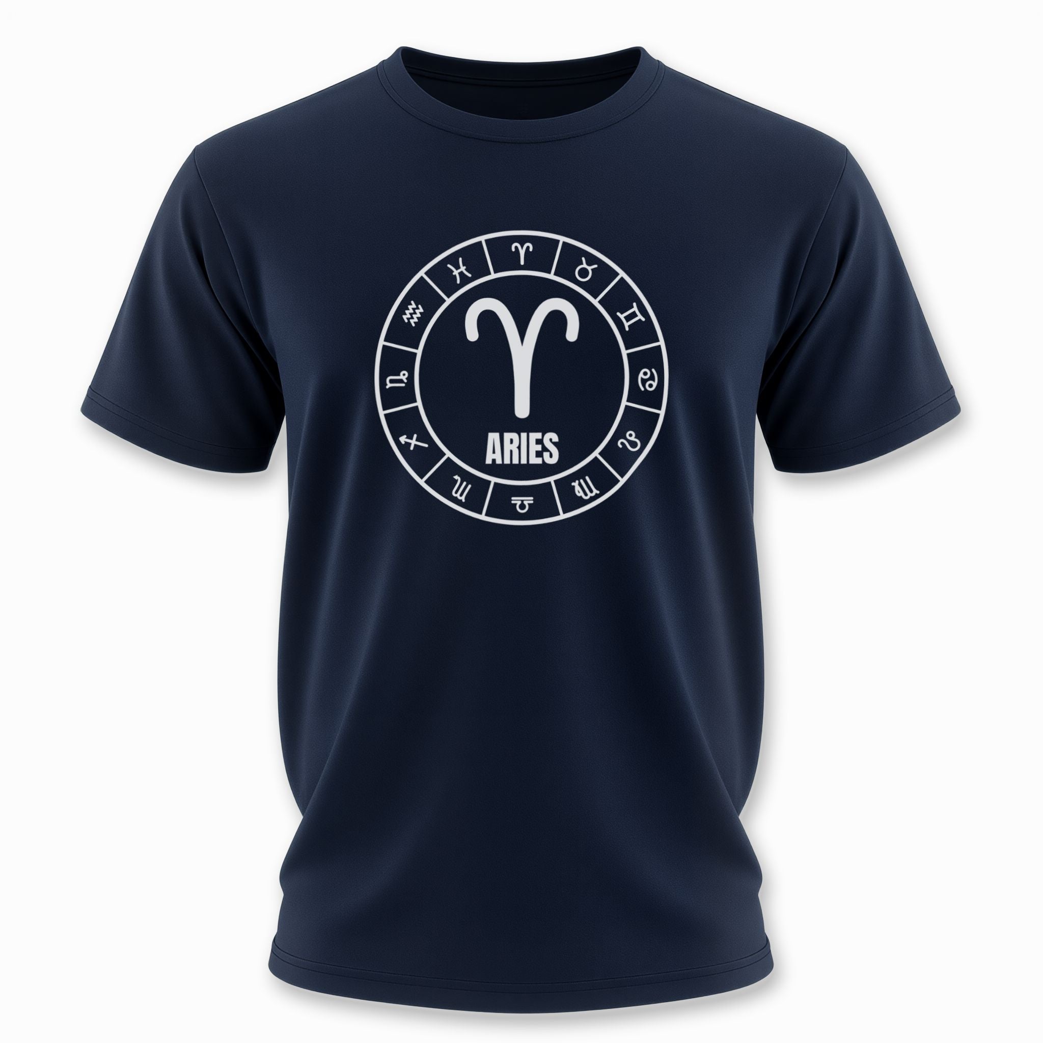 This t-shirt features a striking white graphic of the Aries zodiac symbol prominently centered within a complete wheel of all twelve astrological signs. The word 'ARIES' is boldly displayed beneath the central icon. The Aries symbol, representing the pioneering Ram, signifies courage, passion, and a fearless spirit. Encircling it, the full zodiac wheel speaks to the interconnectedness of the cosmos and the unique journey of each individual. Its clean lines and symbolic depth make it a unique and eye-catching statement piece for anyone who embraces their astrological roots or simply appreciates mystical designs.