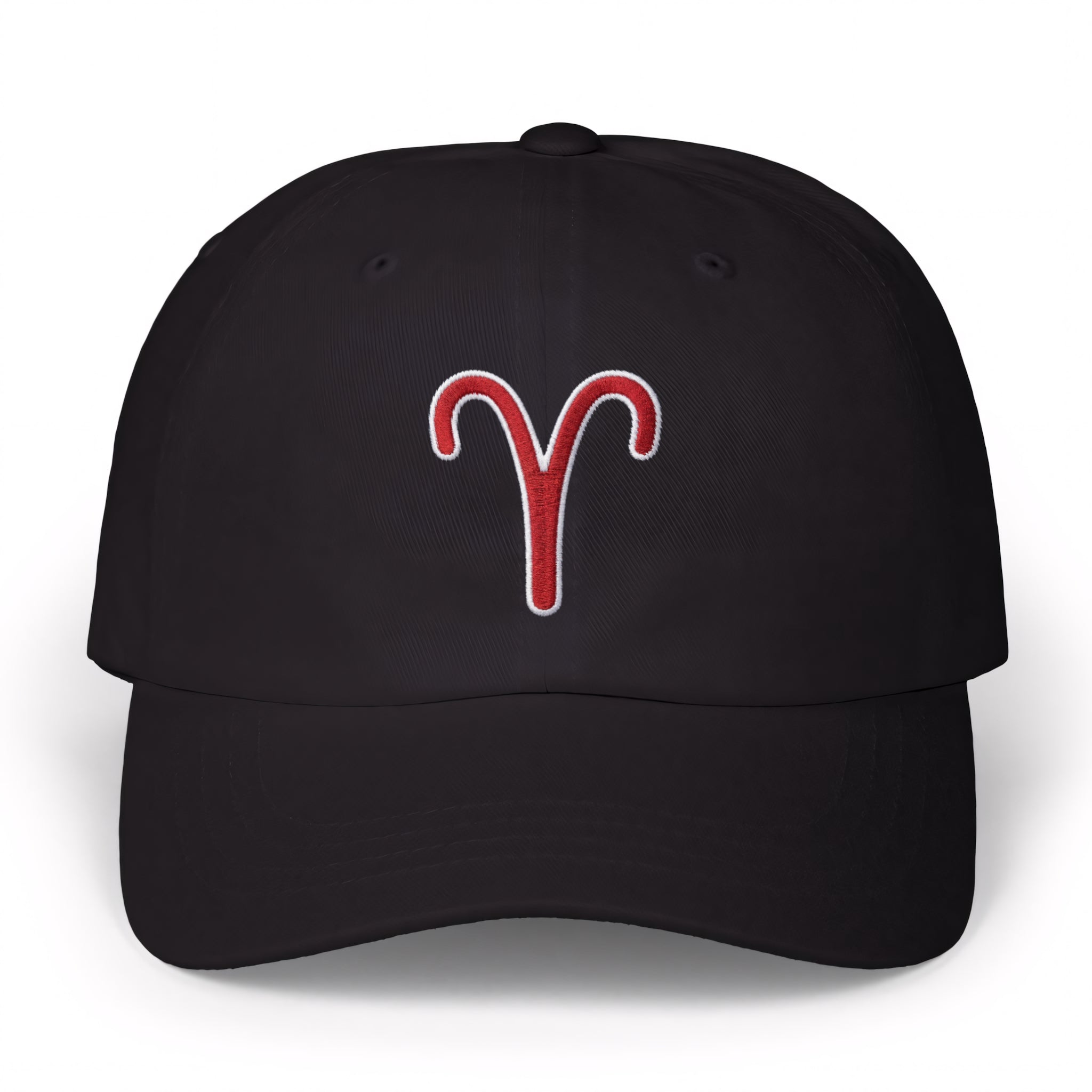 This hat features the iconic Aries zodiac symbol, boldly embroidered in vibrant red with a crisp white outline on a classic black cap. Aries, the first sign of the zodiac (March 21 - April 19), is represented by The Ram and embodies qualities like courage, ambition, passion, and a pioneering spirit. Ruled by Mars, this fire sign is known for its dynamic and confident energy. It's a powerful statement piece for those who resonate with the bold spirit of Aries or appreciate astrological symbolism, making it a unique and eye-catching addition to any wardrobe.