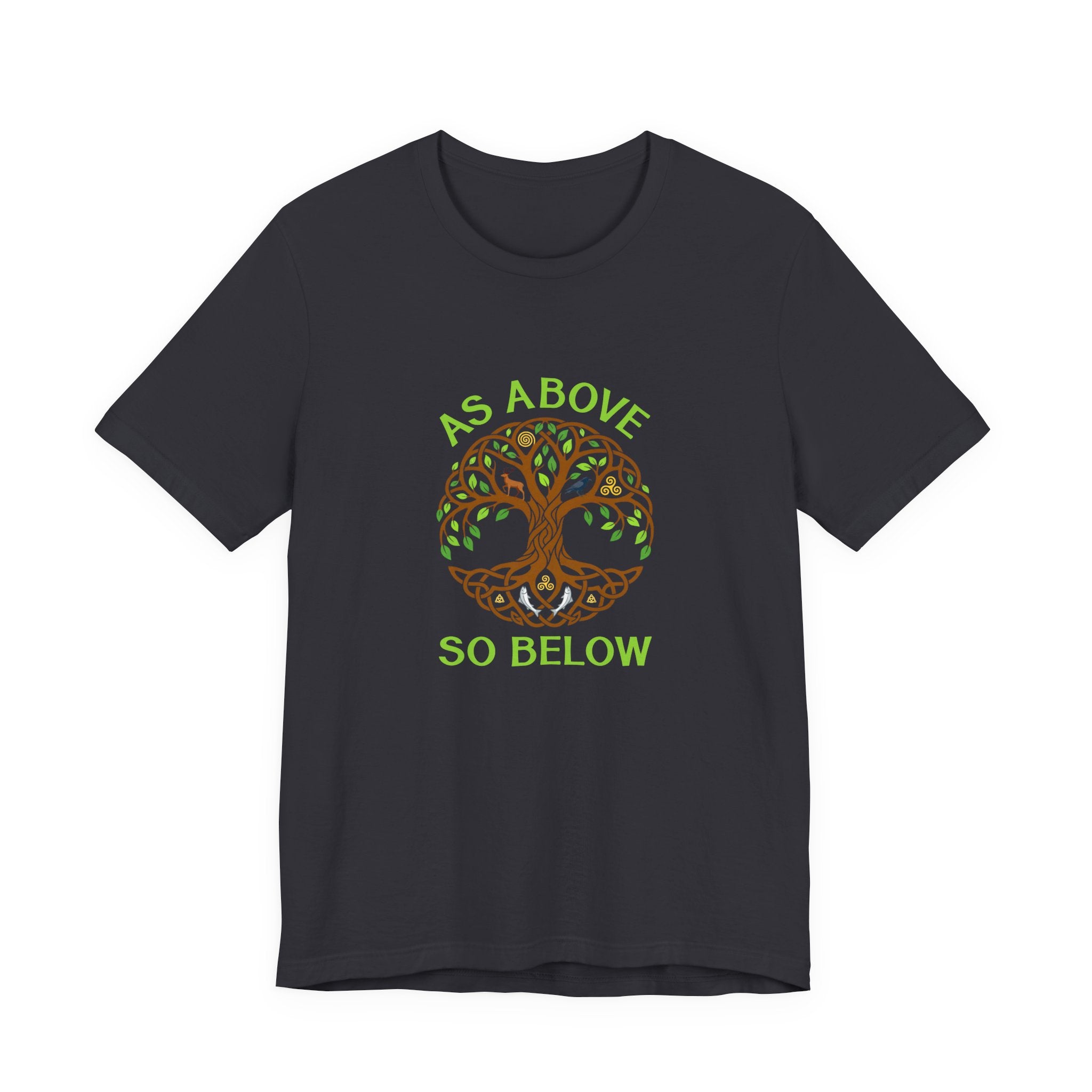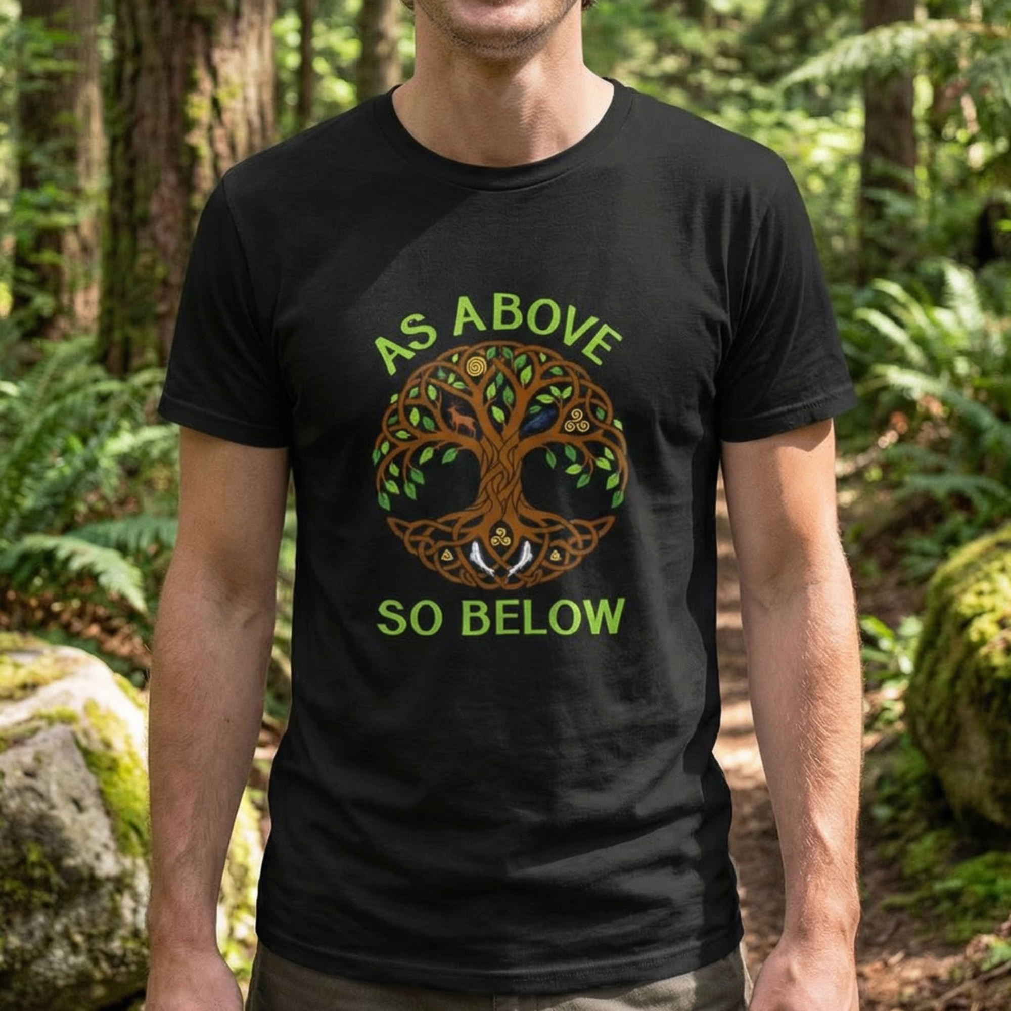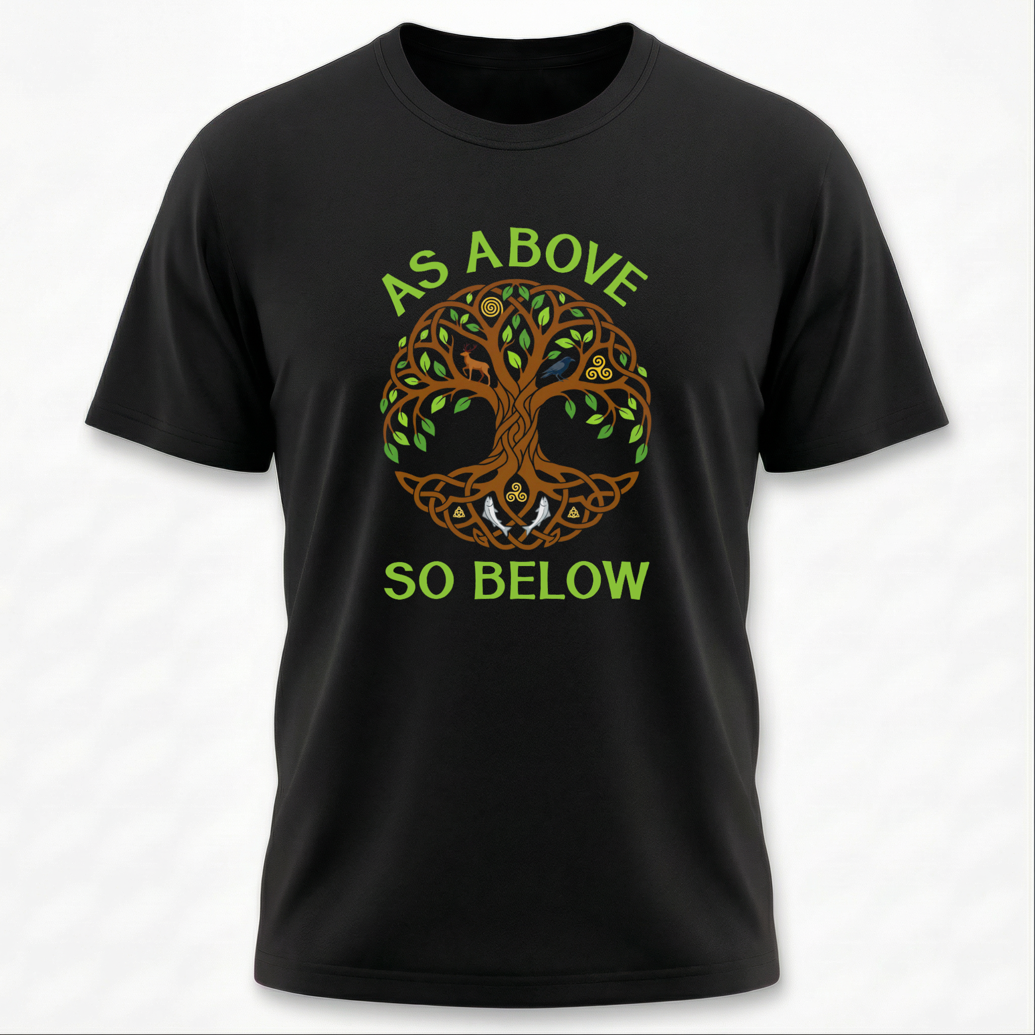 This intricate t-shirt design features a beautifully rendered Tree of Life, framed by the profound phrase "As Above, So Below." The Tree of Life, with its Celtic knot-inspired roots and branches, symbolizes the deep interconnectedness of all existence, bridging the earthly and spiritual realms. Animals like the deer, owl, and raven, along with celestial and spiritual symbols nestled within its canopy and roots, further emphasize harmony, wisdom, and the mirroring of cosmic and earthly energies. This unique graphic is a powerful statement piece for those who resonate with spiritual wisdom, natural balance, and the profound mystery of the universe. Its detailed artwork and symbolic depth make it a truly meaningful addition to any wardrobe.