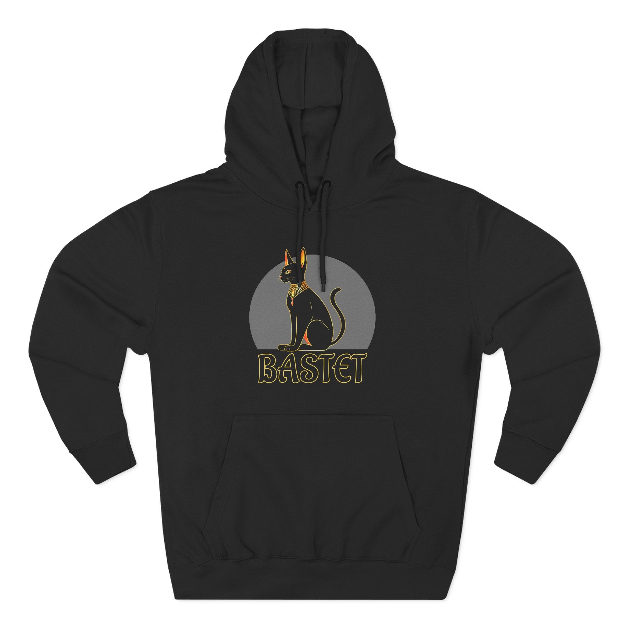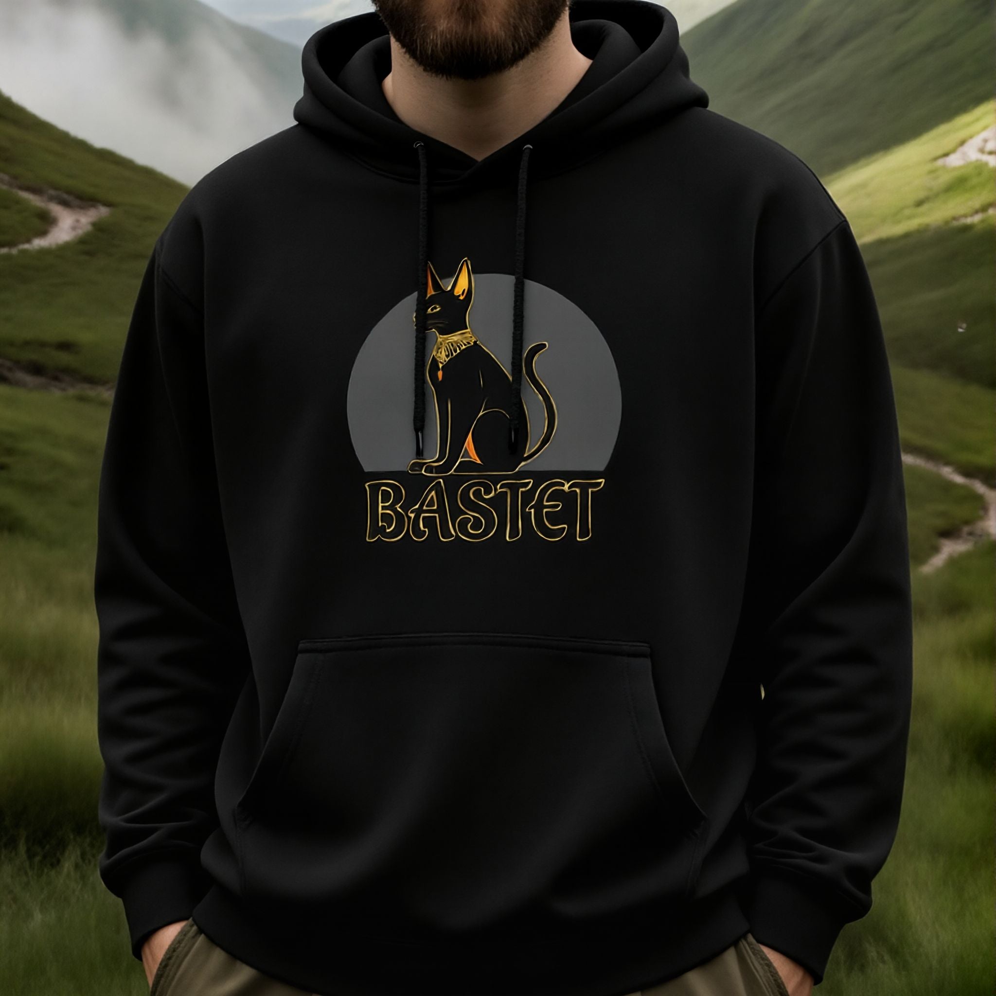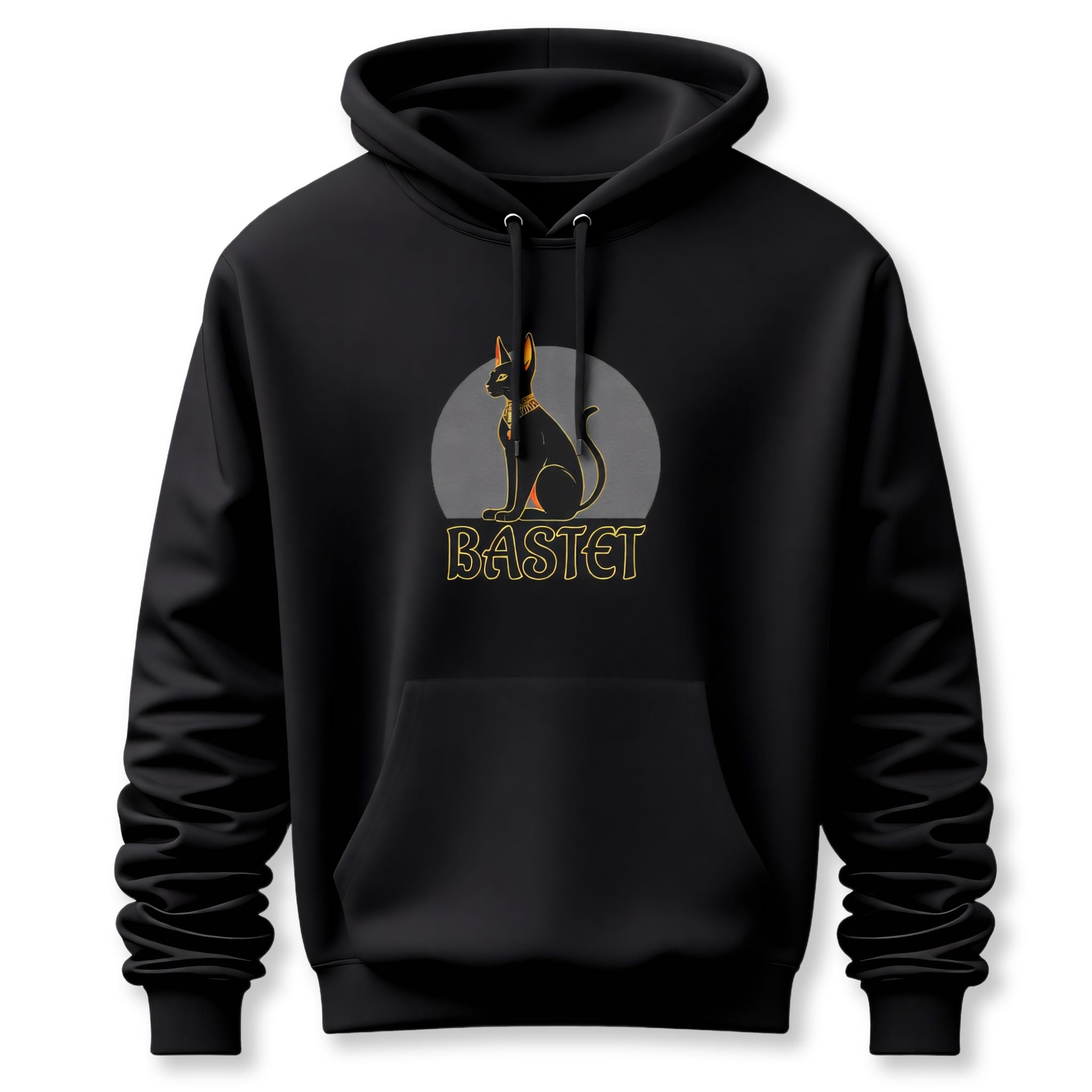 This hoodie features a majestic depiction of Bastet, the ancient Egyptian goddess, gracefully rendered as a sleek black cat with elegant golden accents on her ears and a regal golden collar. Revered as the goddess of home, fertility, protection, joy, and felines, Bastet embodies both fierce guardianship and gentle grace. The stylized art, rich black and gold palette, and the very presence of the word "BASTET" evoke the profound mystique and cultural significance of ancient Egypt. This unique graphic is a celebration of powerful female deities and the sacred, timeless allure of cats.