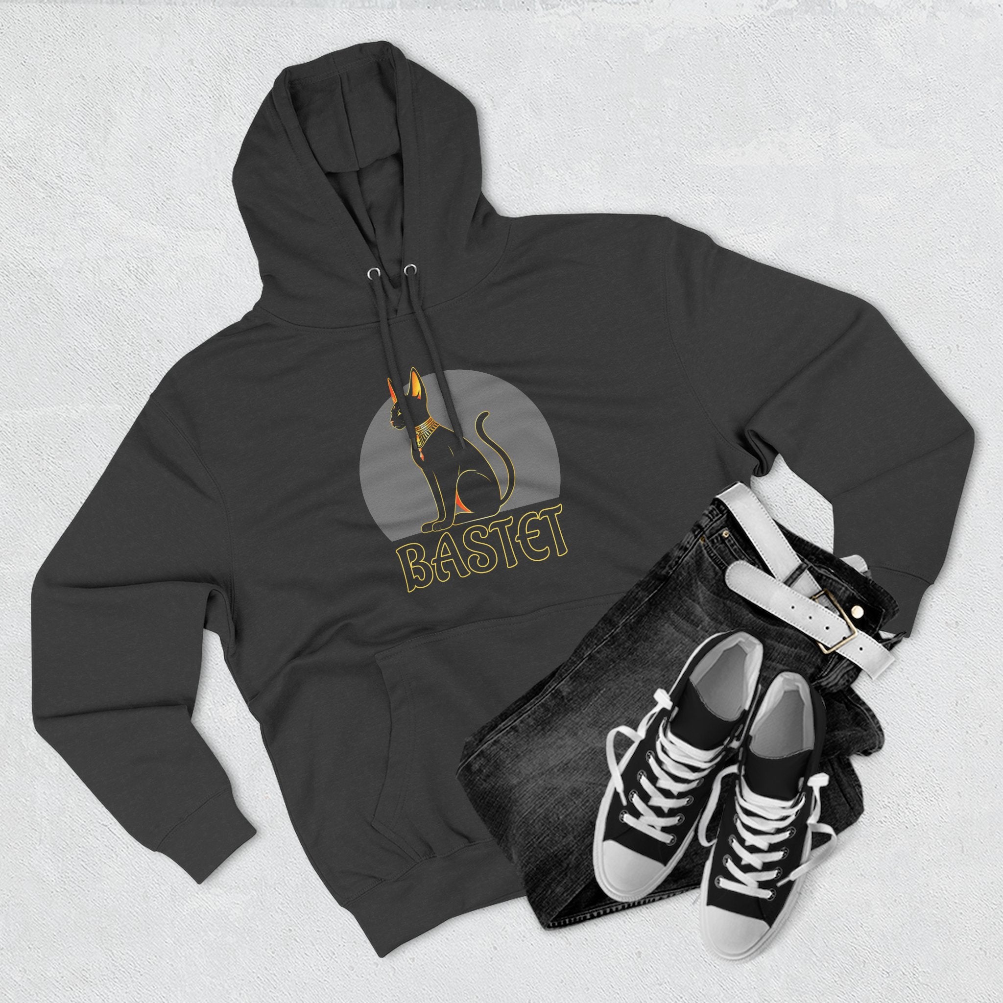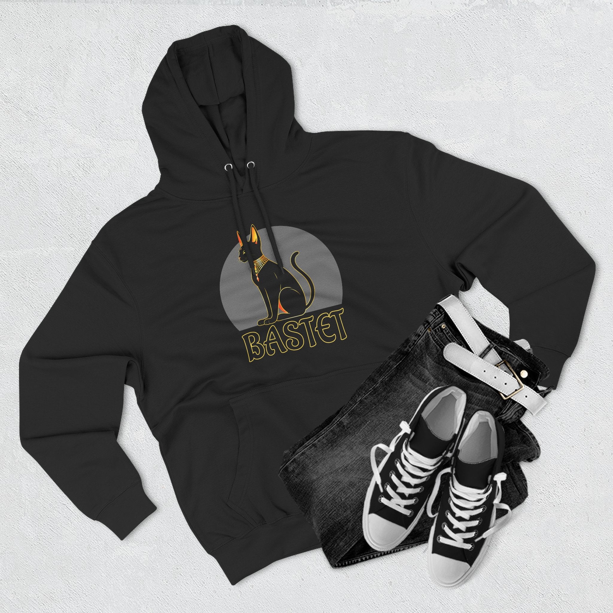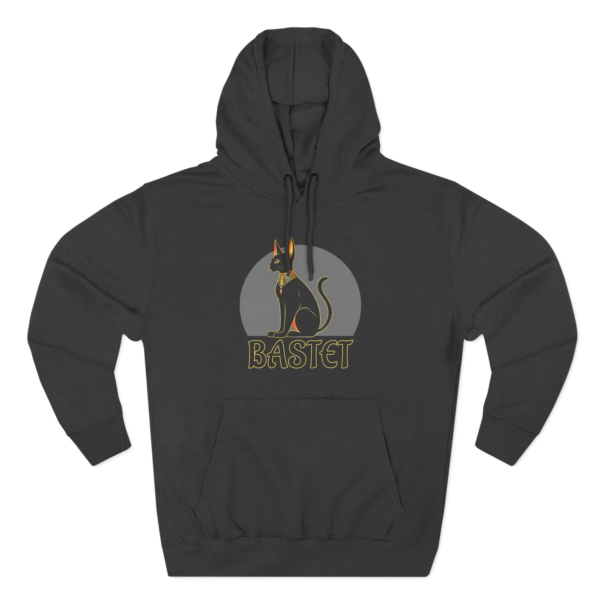 This hoodie features a majestic depiction of Bastet, the ancient Egyptian goddess, gracefully rendered as a sleek black cat with elegant golden accents on her ears and a regal golden collar. Revered as the goddess of home, fertility, protection, joy, and felines, Bastet embodies both fierce guardianship and gentle grace. The stylized art, rich black and gold palette, and the very presence of the word "BASTET" evoke the profound mystique and cultural significance of ancient Egypt. This unique graphic is a celebration of powerful female deities and the sacred, timeless allure of cats.