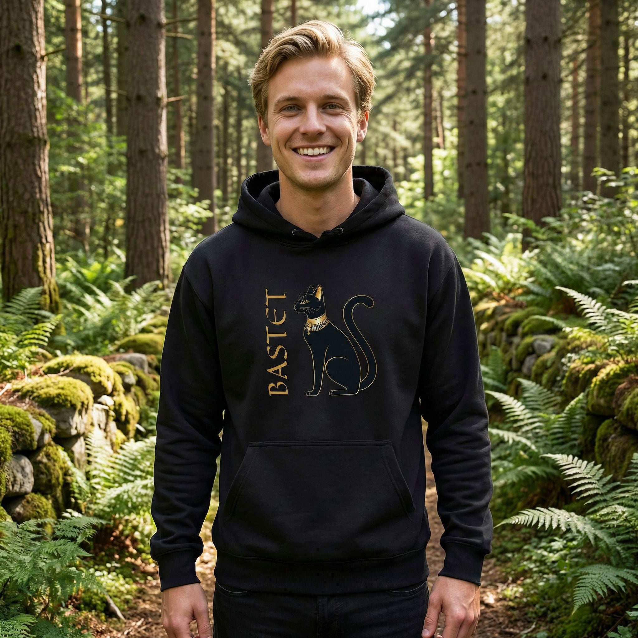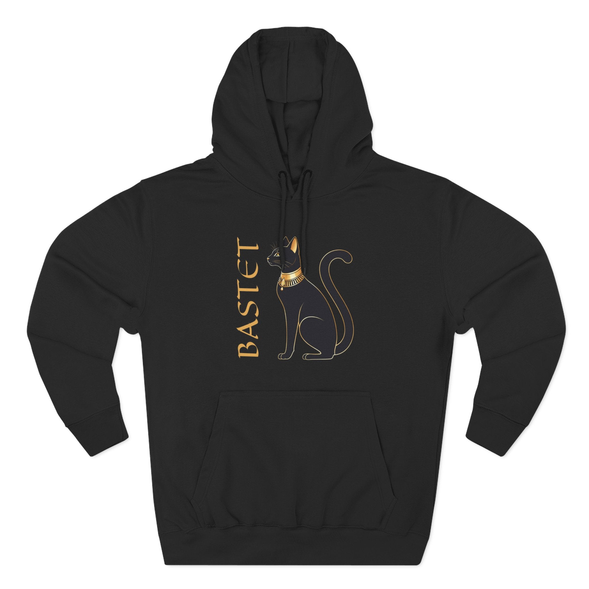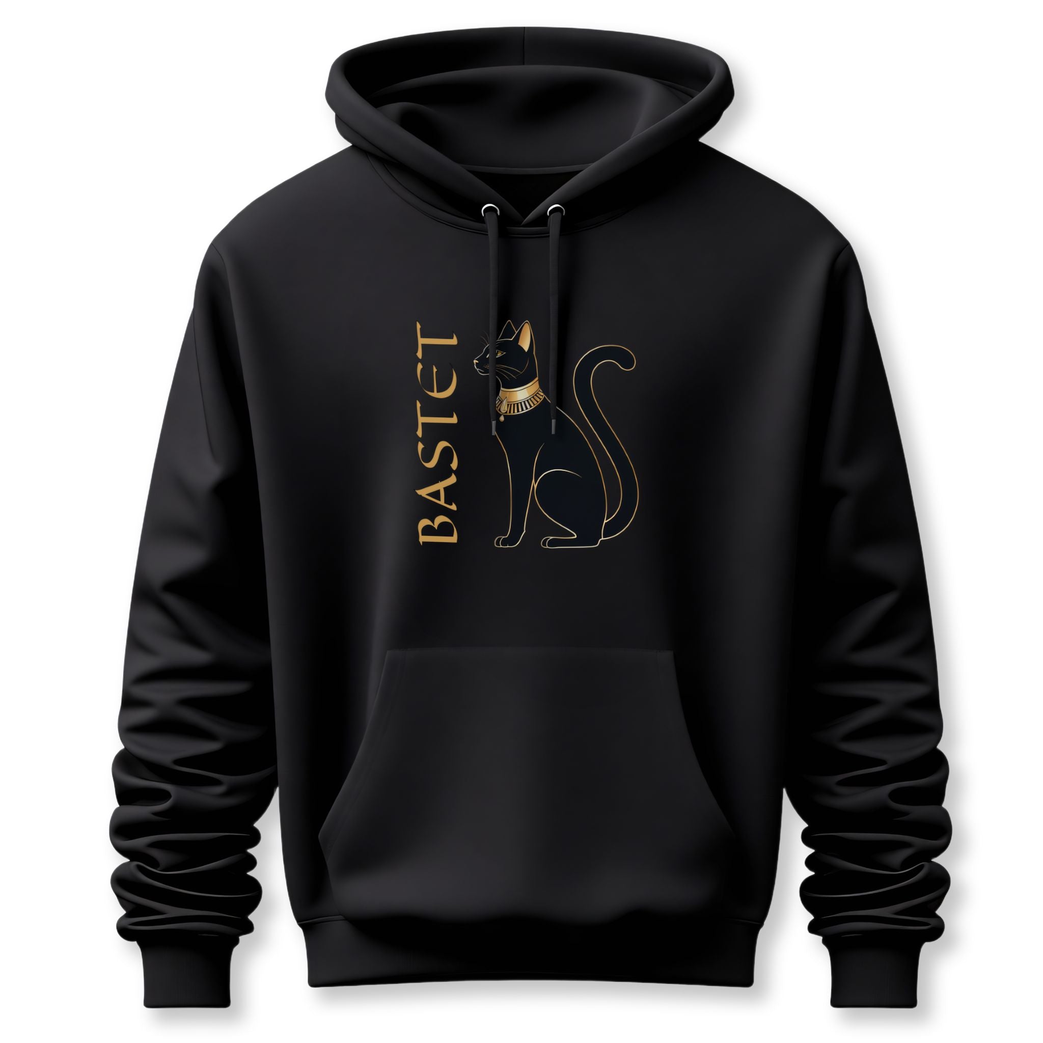 This hoodie features an elegant golden outline of a majestic black cat, adorned with a regal golden collar, alongside the vertically inscribed name 'BASTET' in matching gold. Inspired by Bastet, the revered ancient Egyptian goddess often depicted as a cat, this design embodies protection, fertility, and the serene grace of feline divinity. Cats were considered sacred in ancient Egypt, embodying guardianship and domestic bliss. It's a sophisticated tribute to ancient mythology and the timeless allure of cats, making it a powerful and stylish statement piece for any wardrobe.