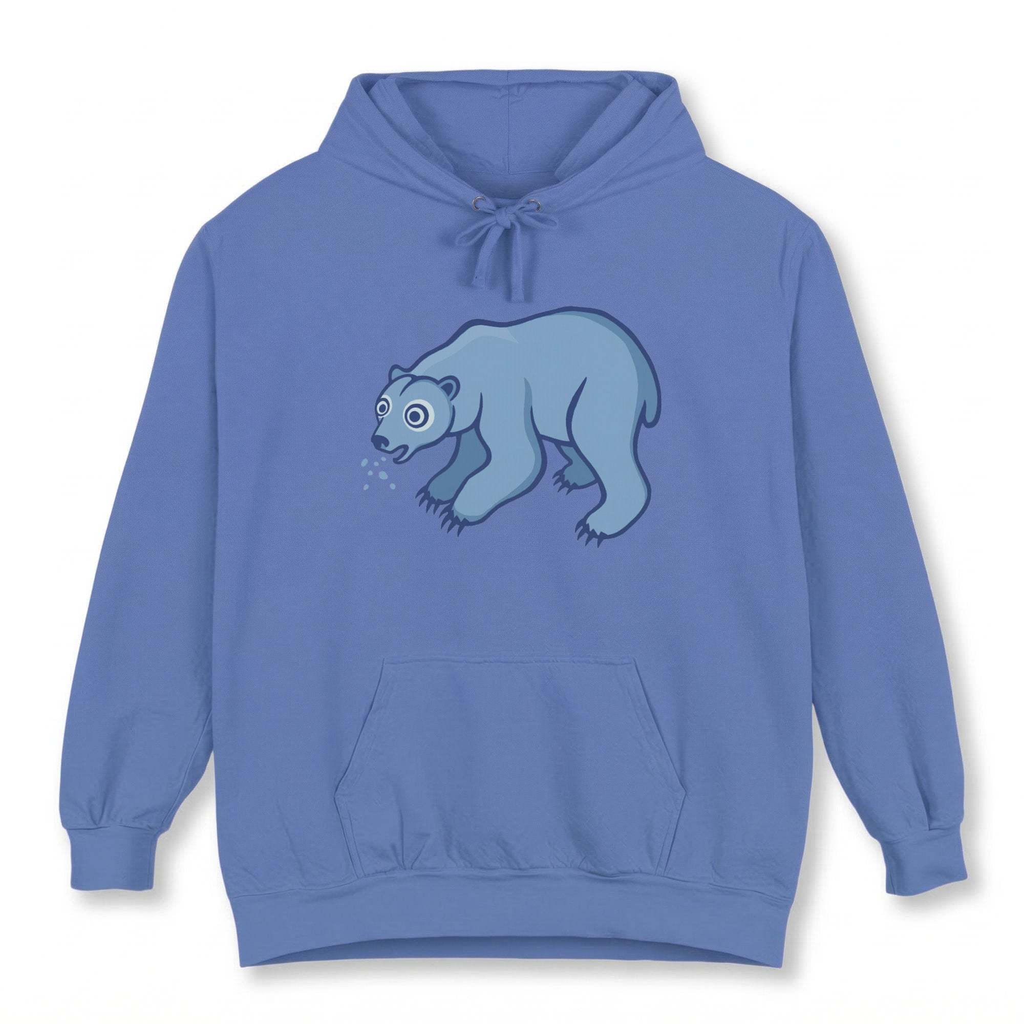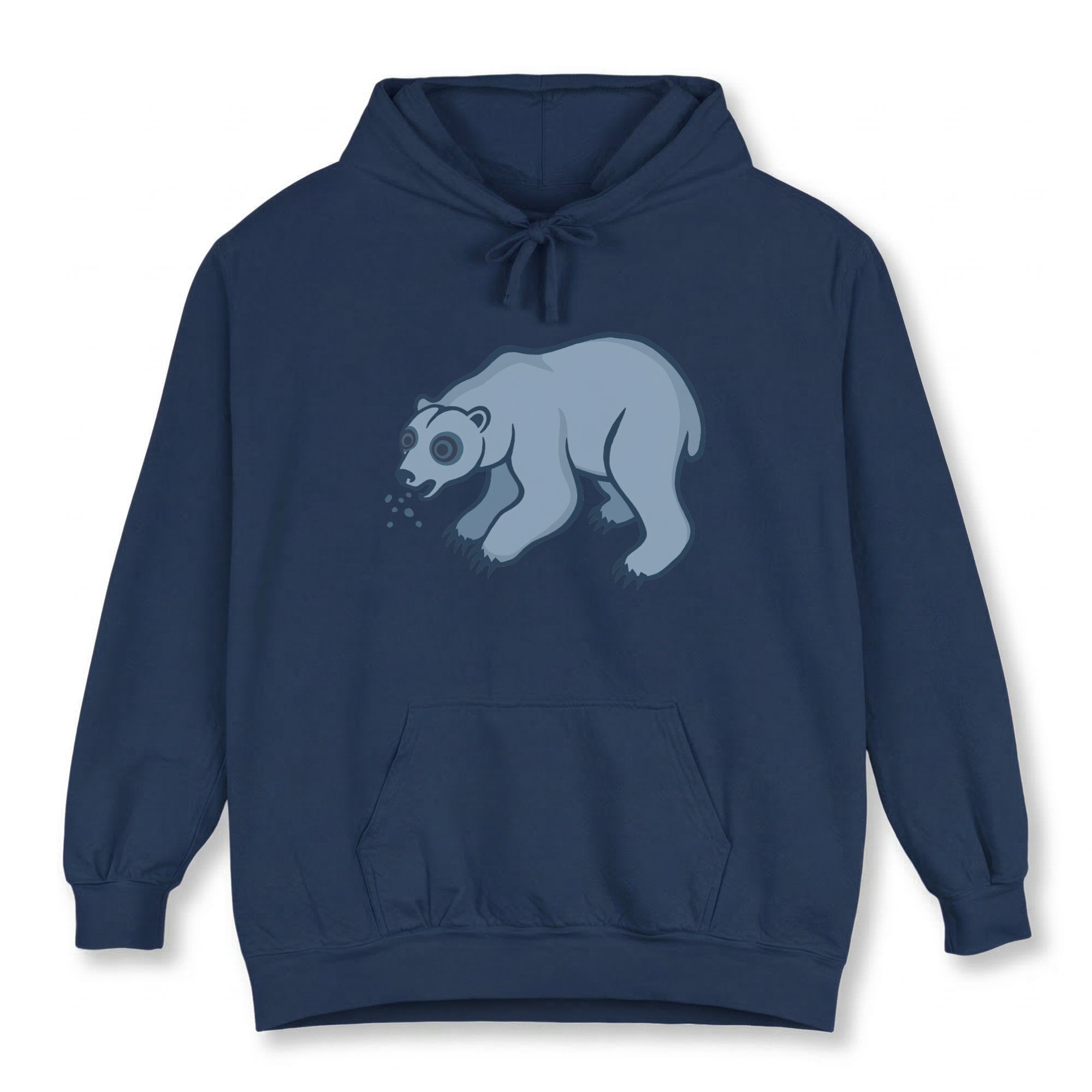 This hoodie features a unique, Inuit-inspired graphic of an off-white bear with striking wide eyes and hints of droplets around its mouth, giving it a feral look. It reimagines the familiar arctic creature with a mysterious twist, perfect for those who are drawn to unconventional and edgy designs. The artwork combines a playful style with a touch of the whimsical, creating a captivating and intriguing image. This design is bold and eye-catching, sure to spark conversations and make a unique statement.