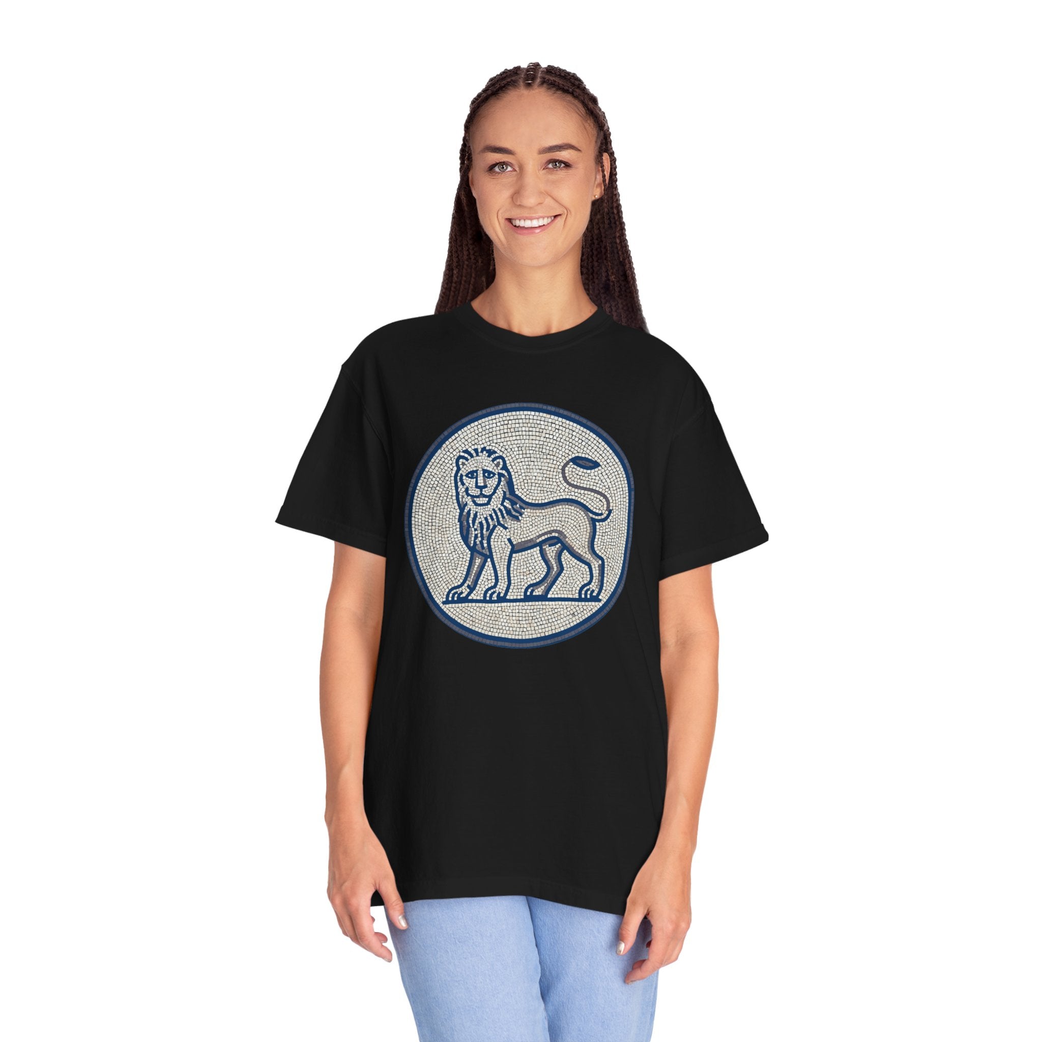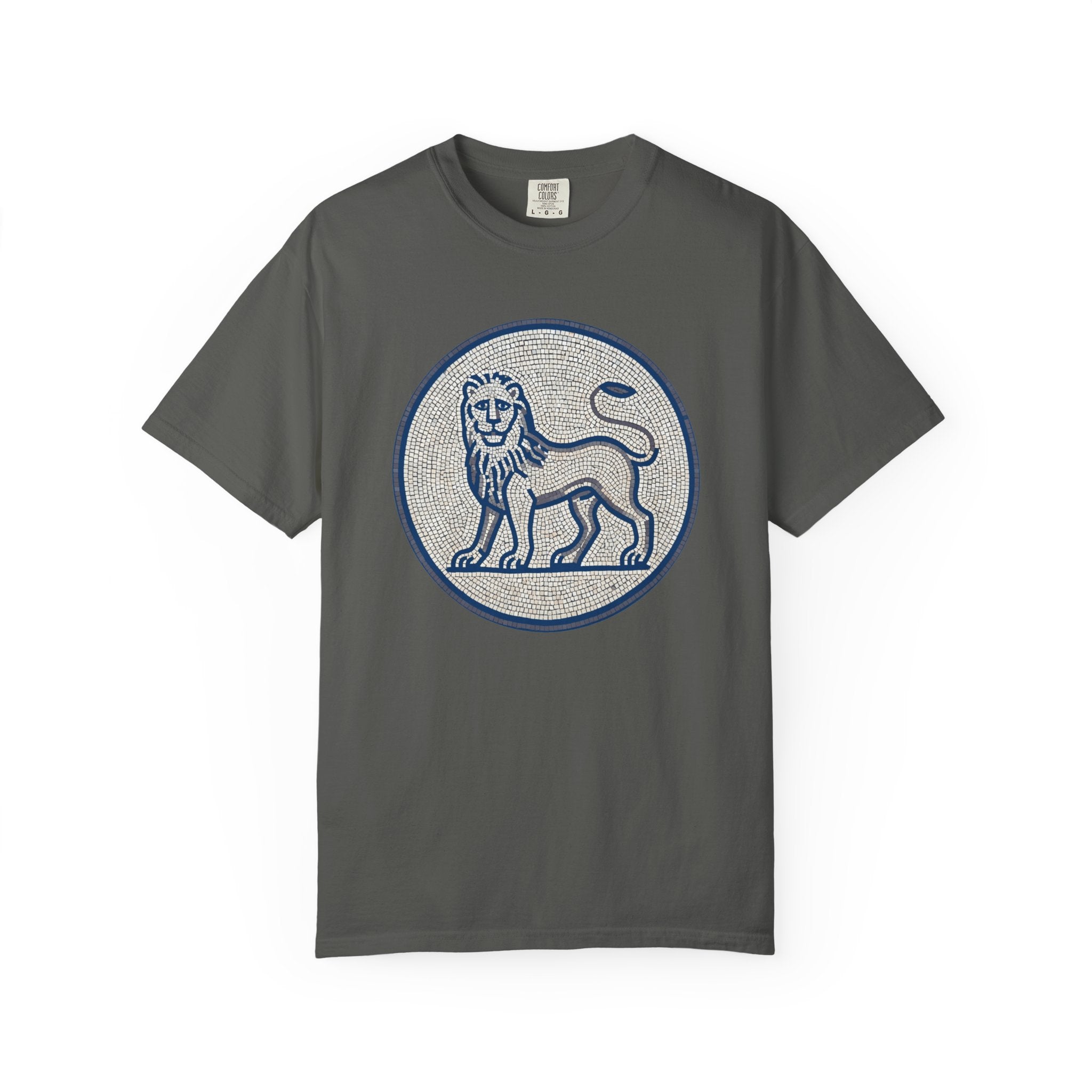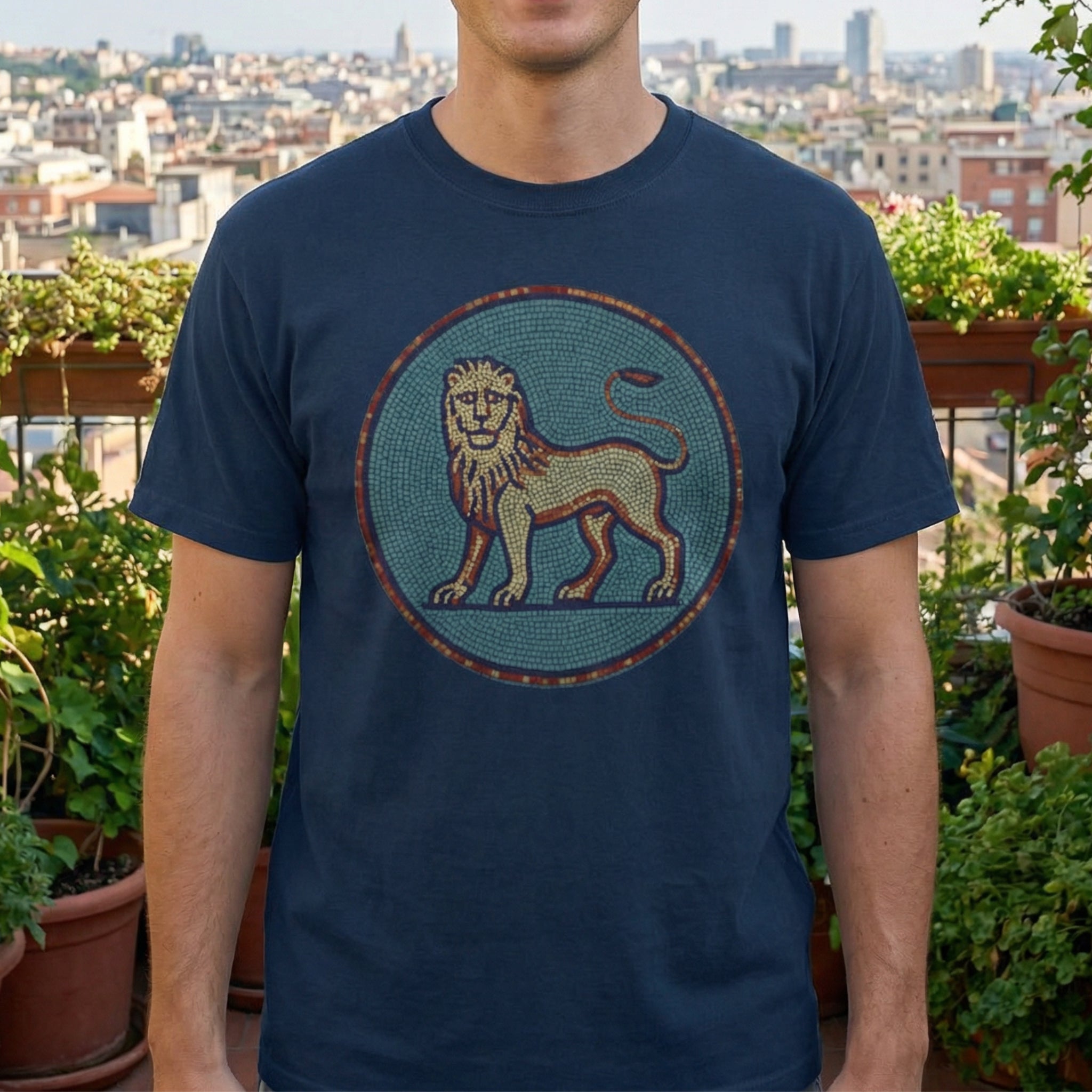 This t-shirt showcases a majestic lion crafted in a beautiful mosaic style, encircled by a classic border. Lions symbolize strength, courage, and royalty, a revered motif throughout ancient civilizations, often depicted in grand mosaic artworks. This unique graphic art piece blends historical artistry with contemporary fashion, perfect for those who appreciate cultural depth and powerful symbolism.