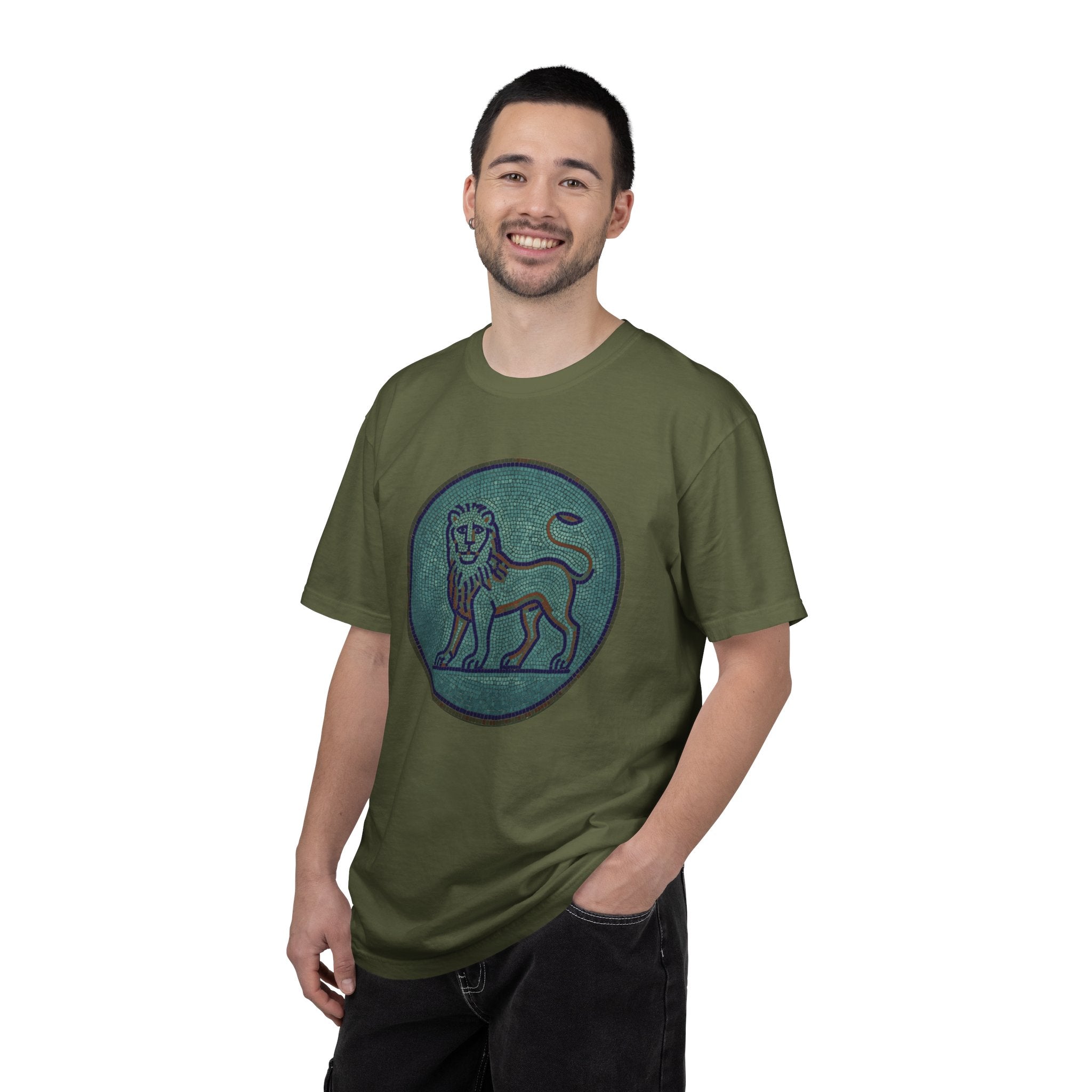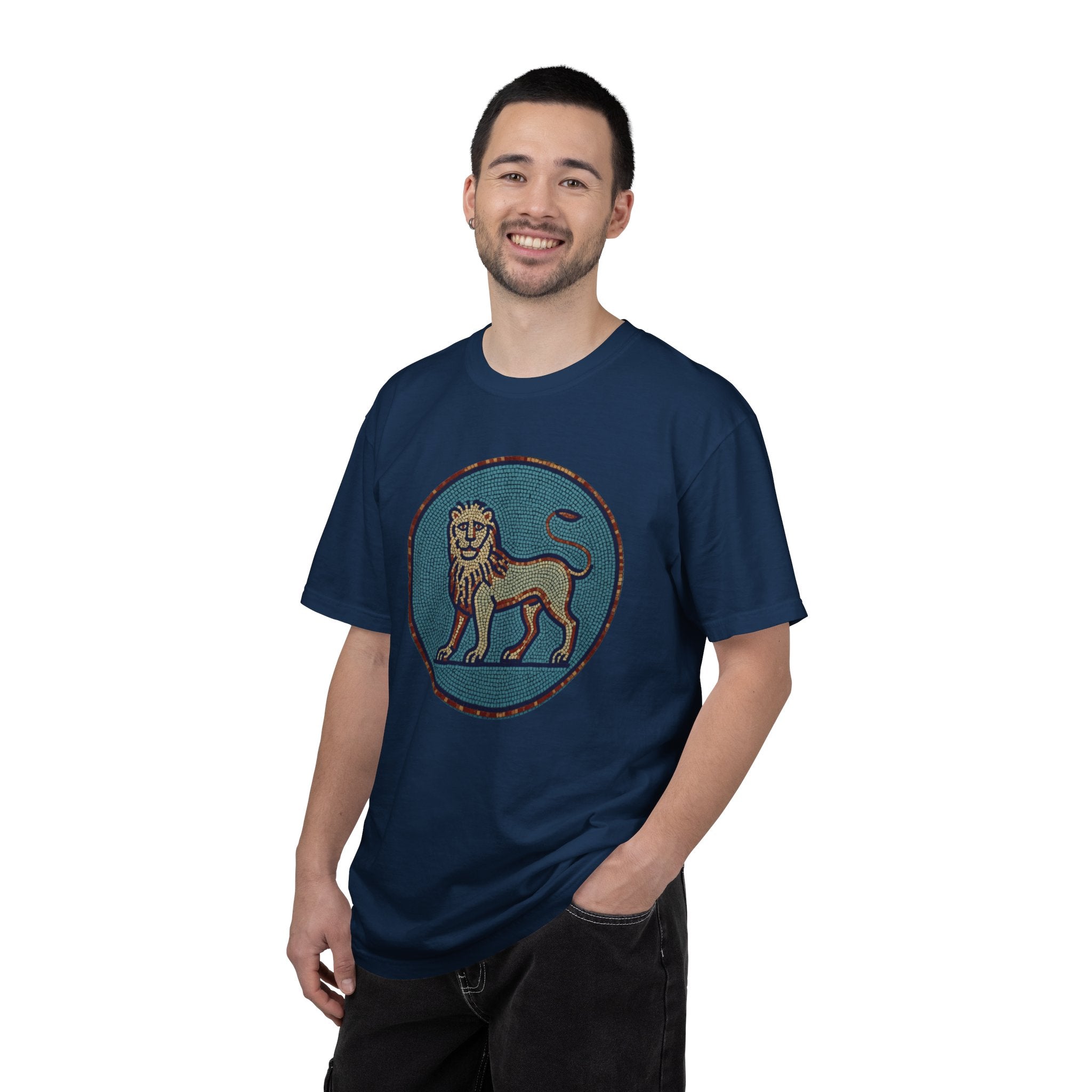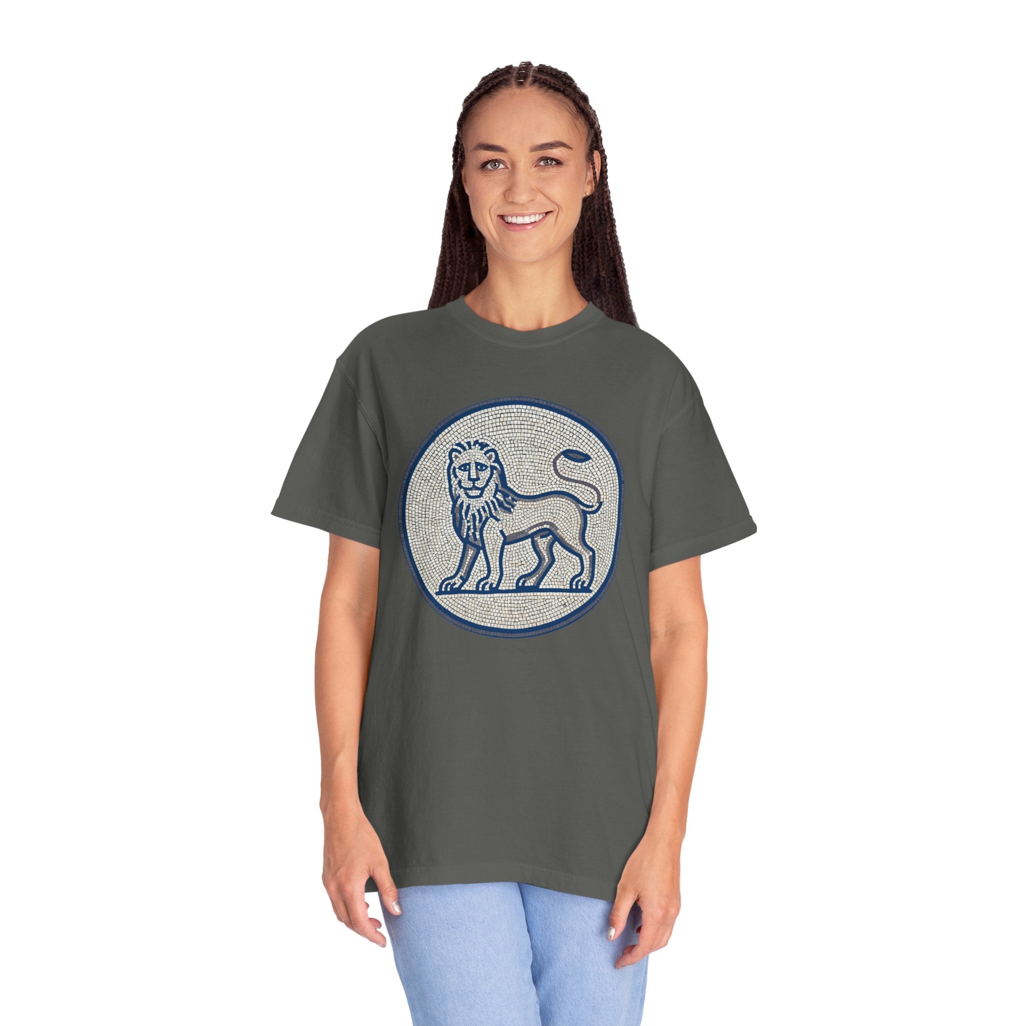 This t-shirt showcases a majestic lion crafted in a beautiful mosaic style, encircled by a classic border. Lions symbolize strength, courage, and royalty, a revered motif throughout ancient civilizations, often depicted in grand mosaic artworks. This unique graphic art piece blends historical artistry with contemporary fashion, perfect for those who appreciate cultural depth and powerful symbolism.