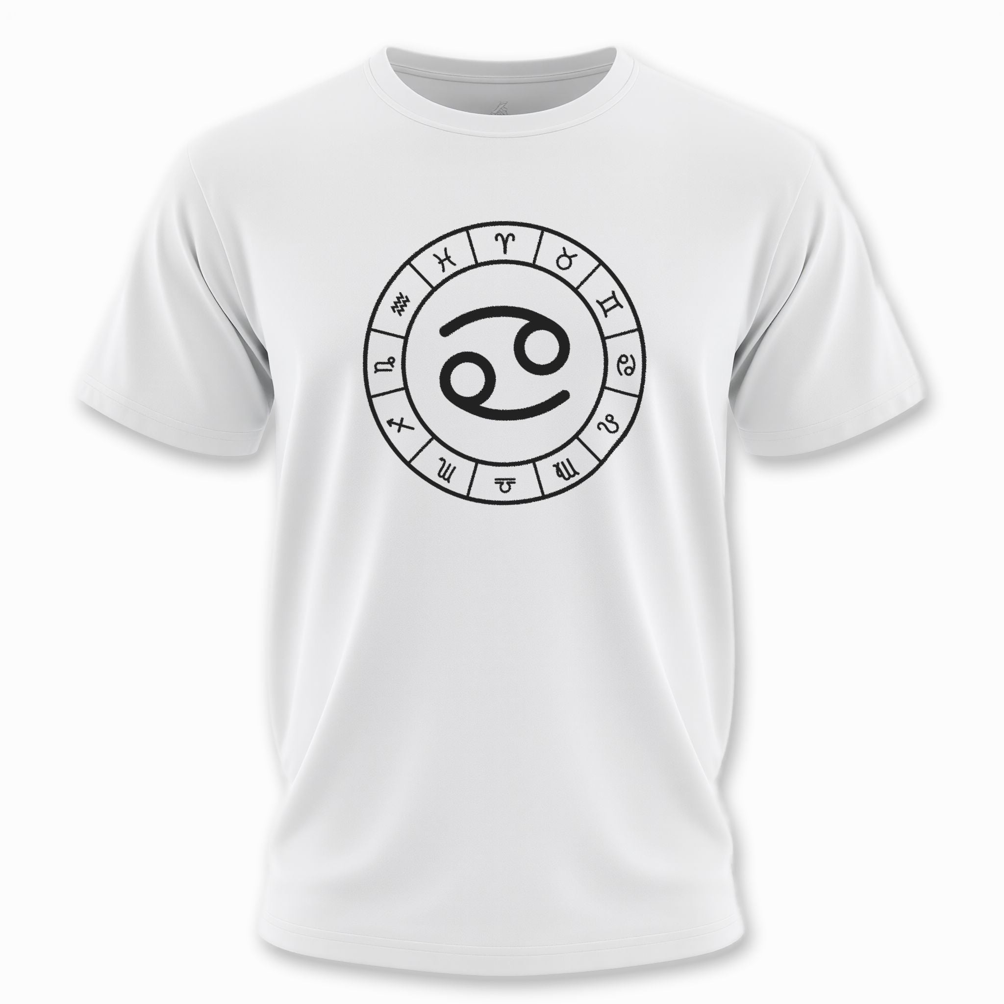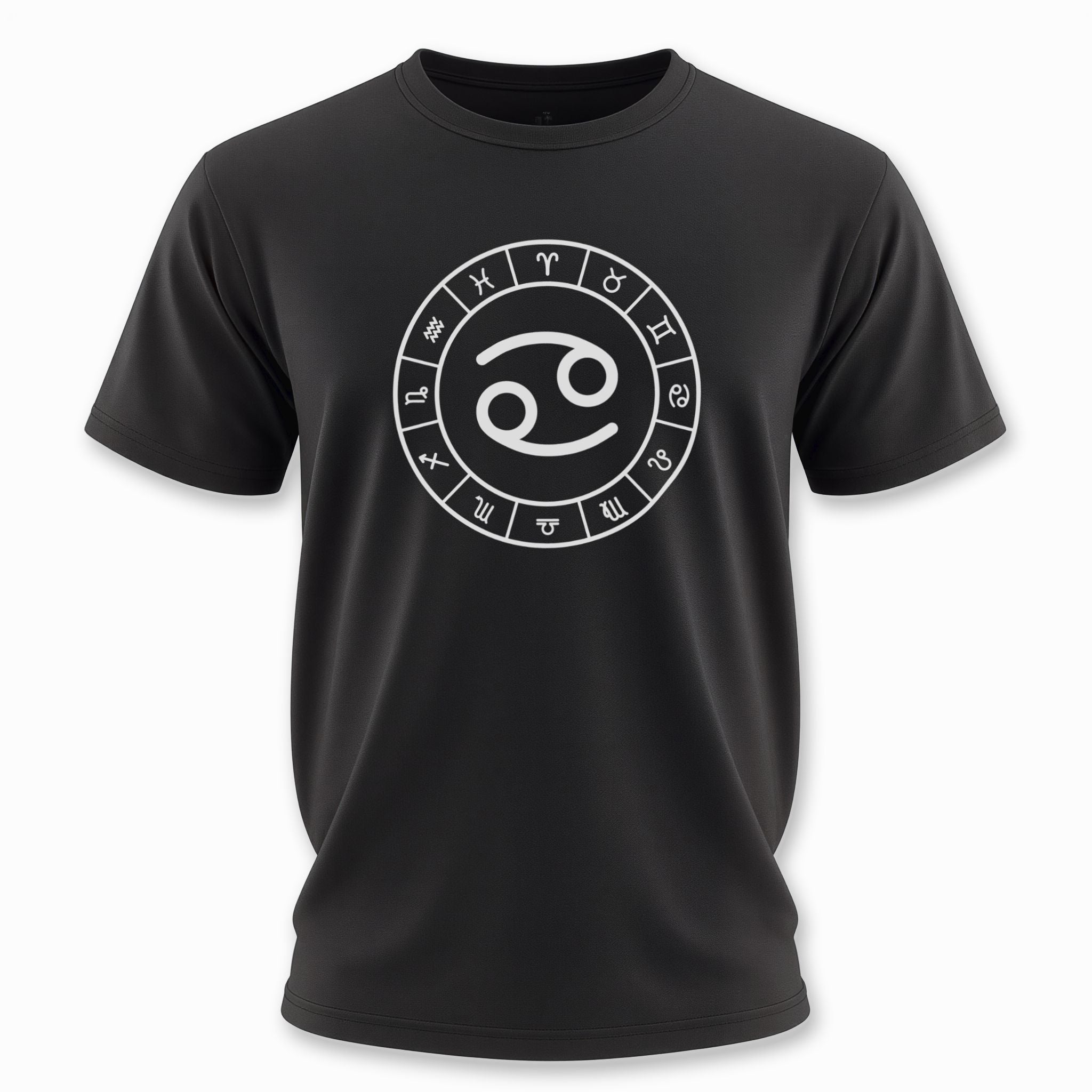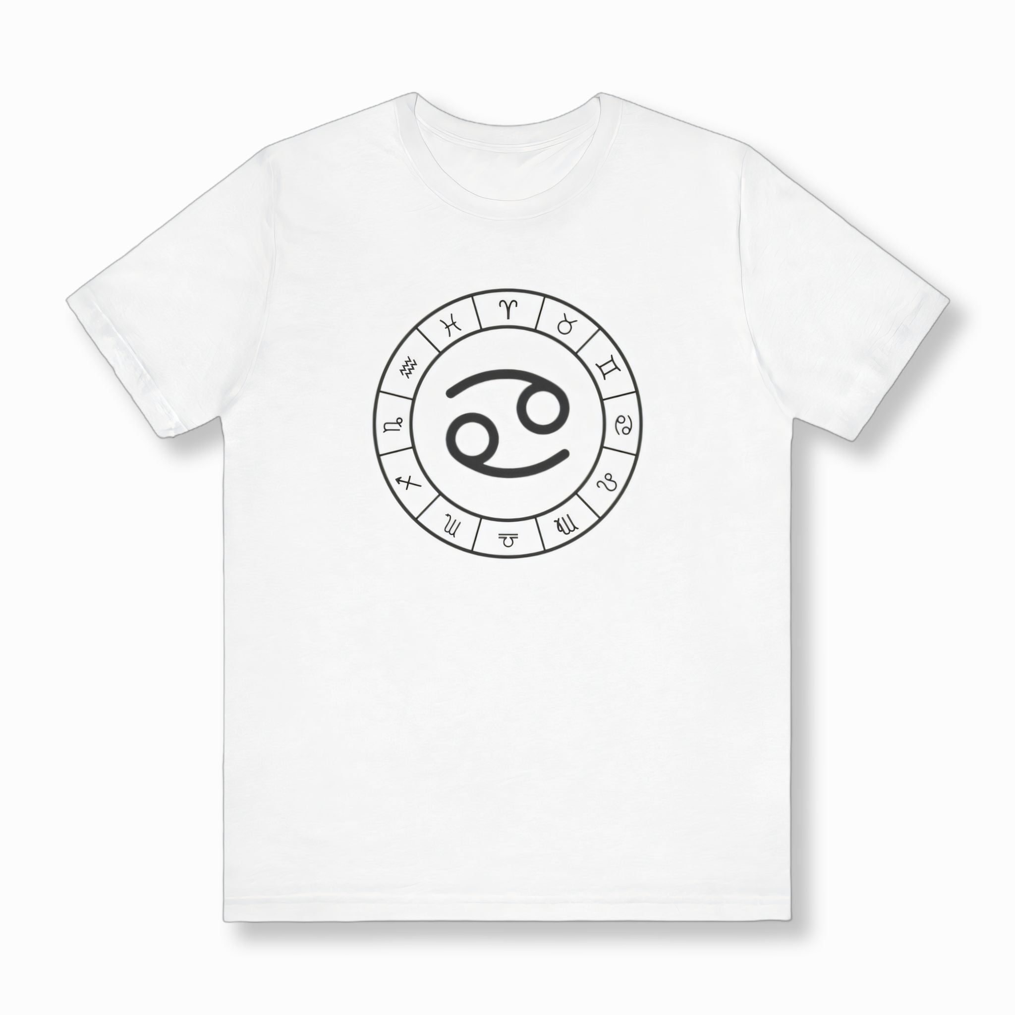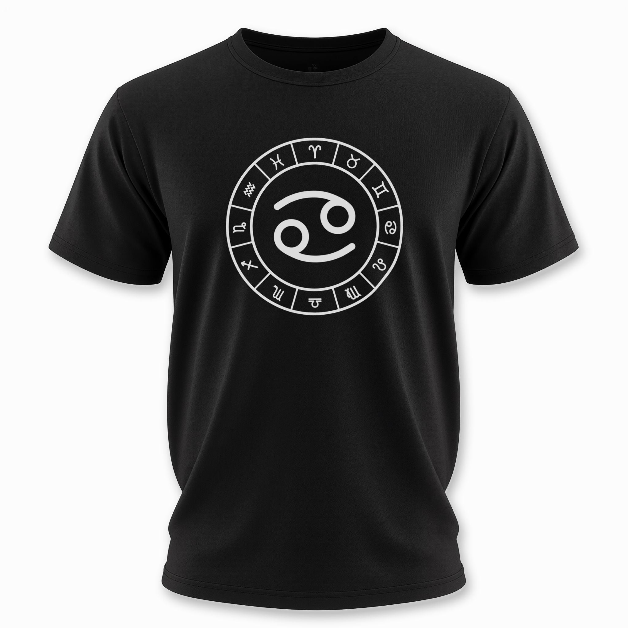 This t-shirt features a striking white graphic of the Cancer zodiac symbol prominently centered within a complete wheel showcasing all twelve astrological signs, set against a classic black background. The Cancer symbol, often resembling the embrace of a crab's claws or a nurturing maternal figure, signifies intuition, emotional depth, and loyalty. This unique graphic is perfect for those who resonate with the compassionate and protective spirit of Cancer, or anyone who appreciates the profound wisdom of astrology. It's a sophisticated and meaningful statement piece that celebrates your cosmic identity.