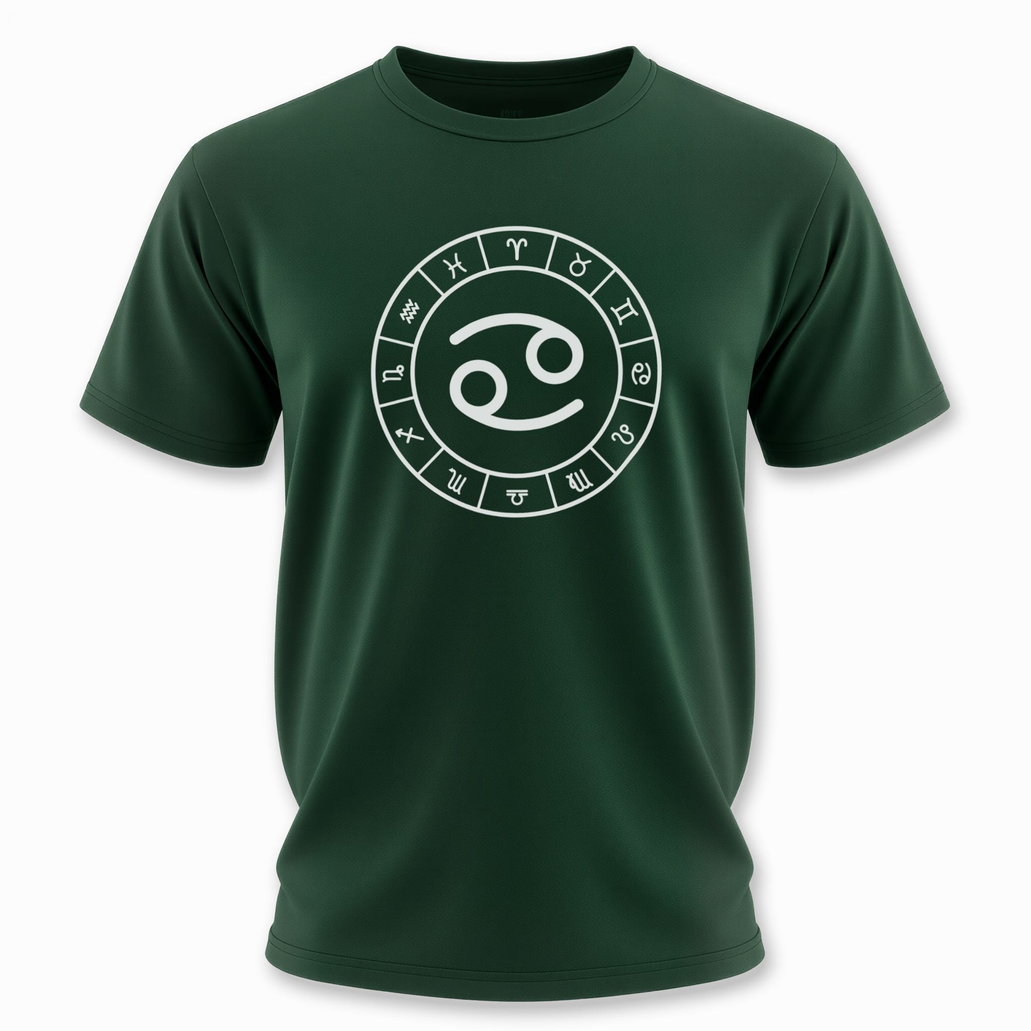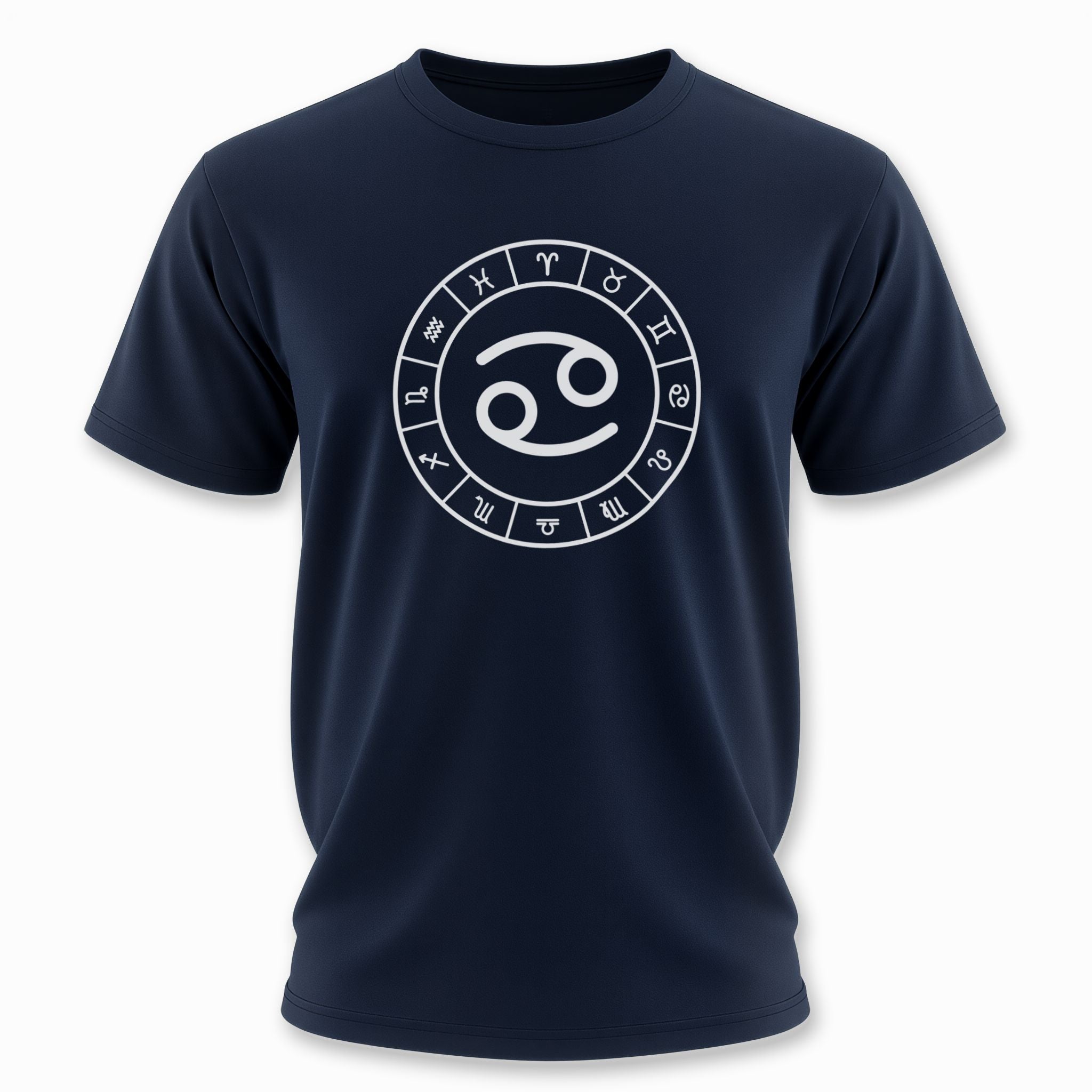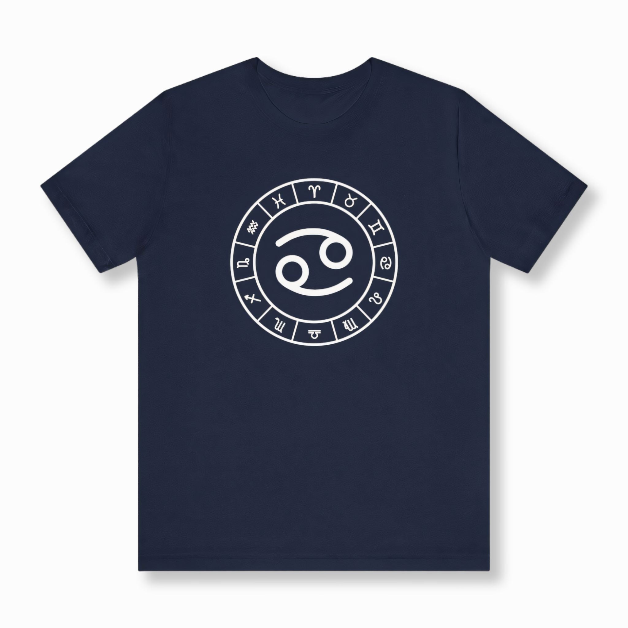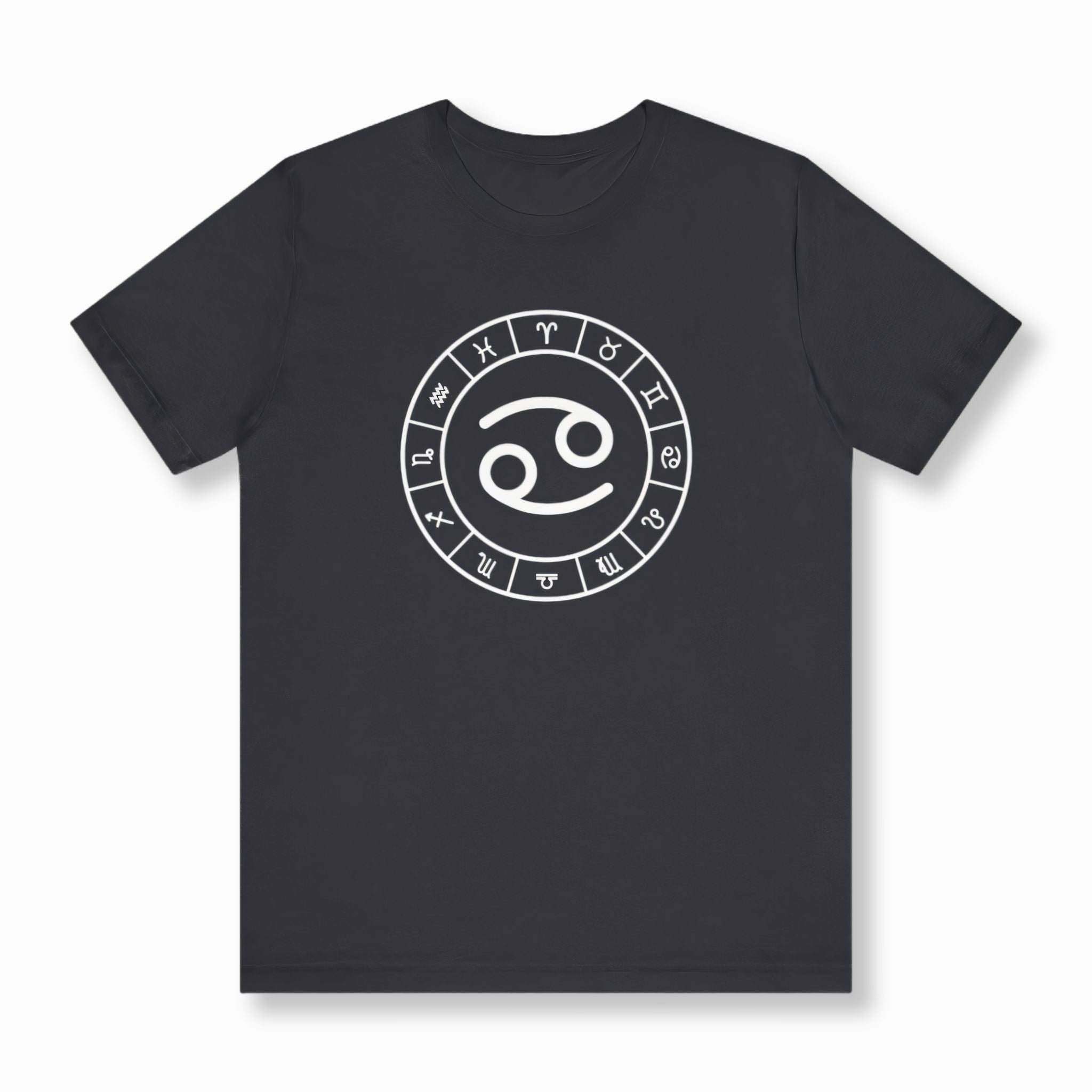 This t-shirt features a striking white graphic of the Cancer zodiac symbol prominently centered within a complete wheel showcasing all twelve astrological signs, set against a classic black background. The Cancer symbol, often resembling the embrace of a crab's claws or a nurturing maternal figure, signifies intuition, emotional depth, and loyalty. This unique graphic is perfect for those who resonate with the compassionate and protective spirit of Cancer, or anyone who appreciates the profound wisdom of astrology. It's a sophisticated and meaningful statement piece that celebrates your cosmic identity.
