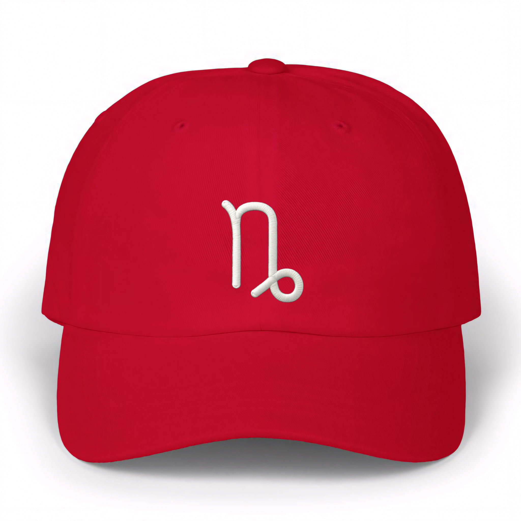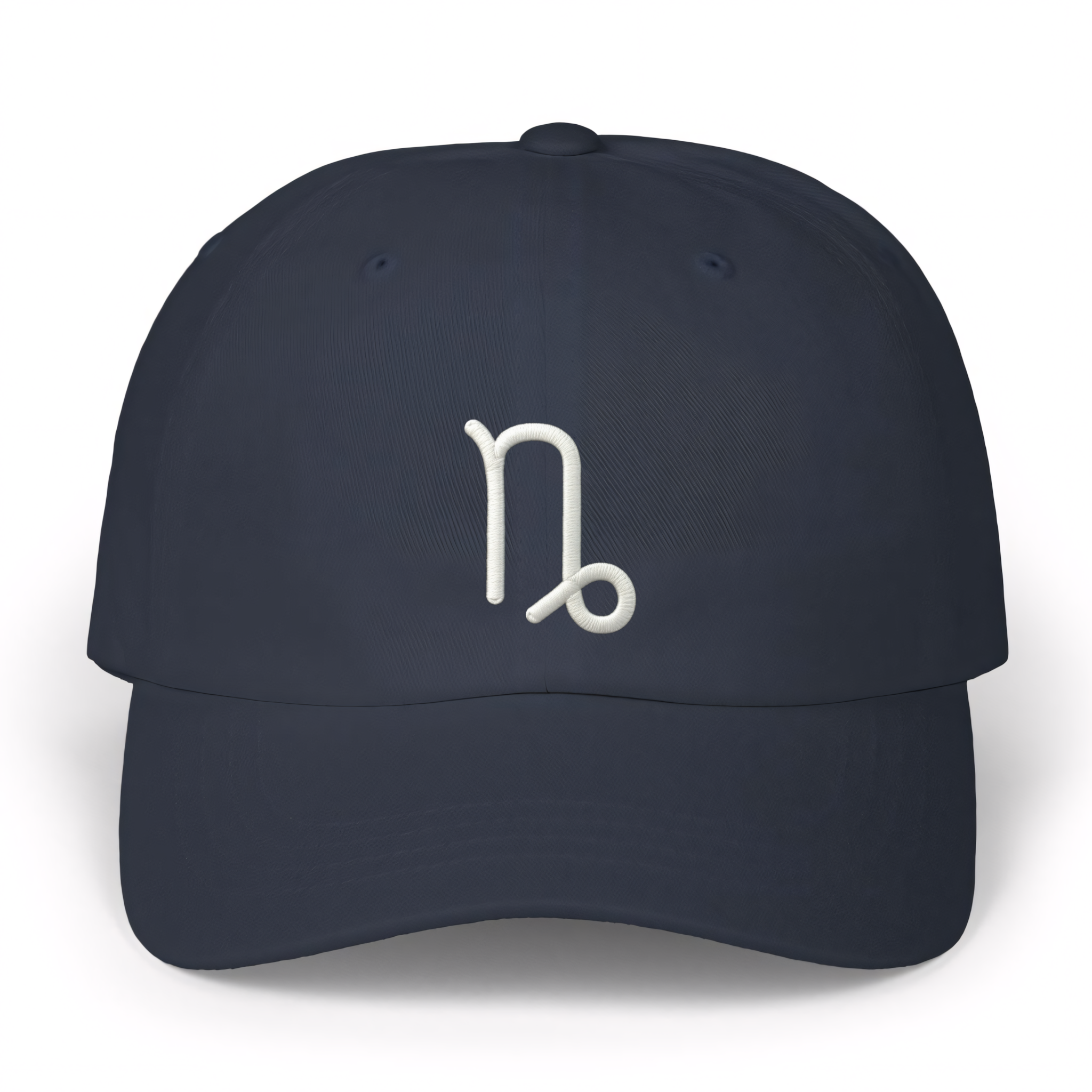 This hat features a sleek, minimalist white embroidery of the Capricorn zodiac symbol on a classic dad cap. The Capricorn symbol, representing those born between December 22 and January 19, embodies ambition, discipline, and practicality. It's a subtle yet powerful way to showcase your astrological identity or appreciation for earth signs. The clean design makes it a sophisticated statement piece for any wardrobe.