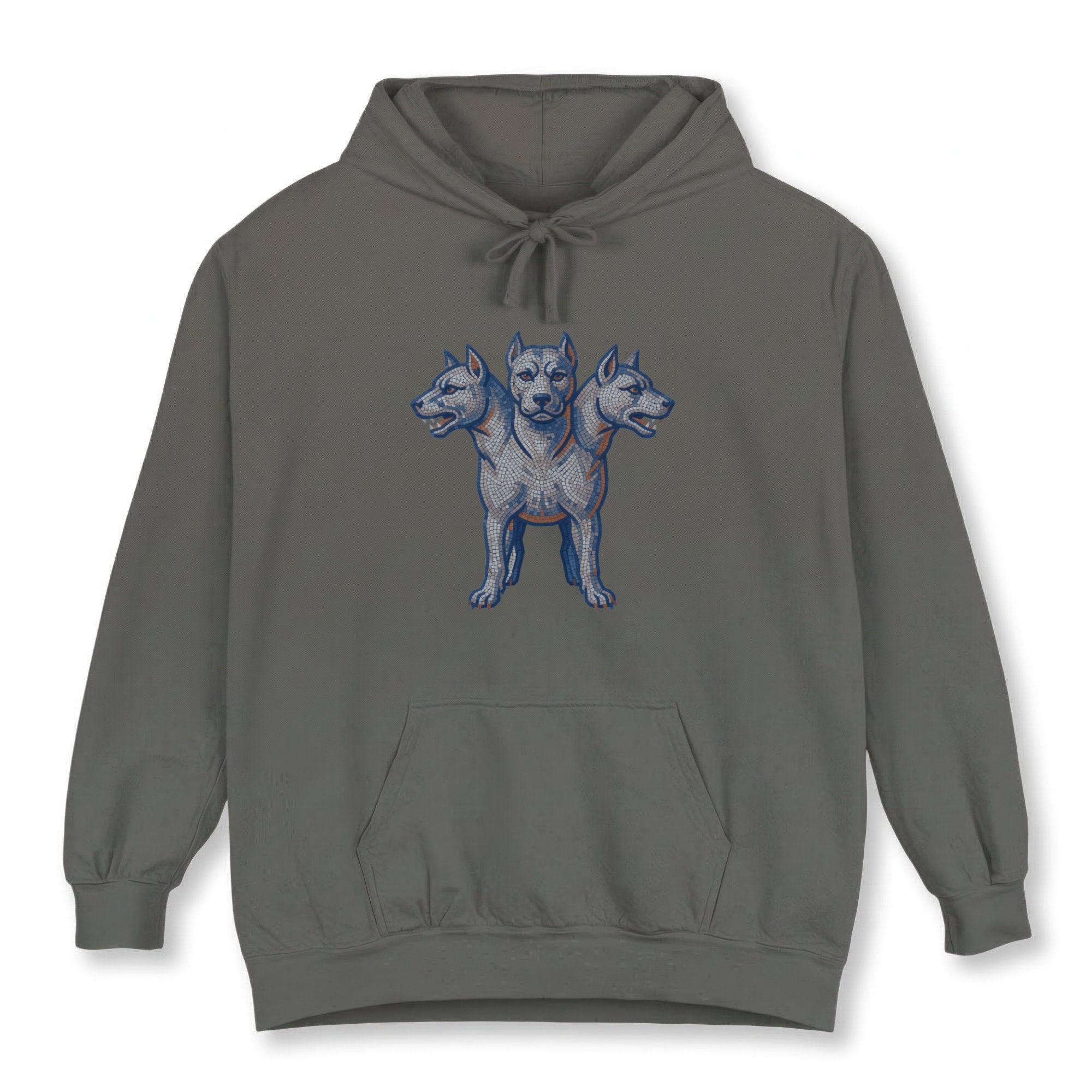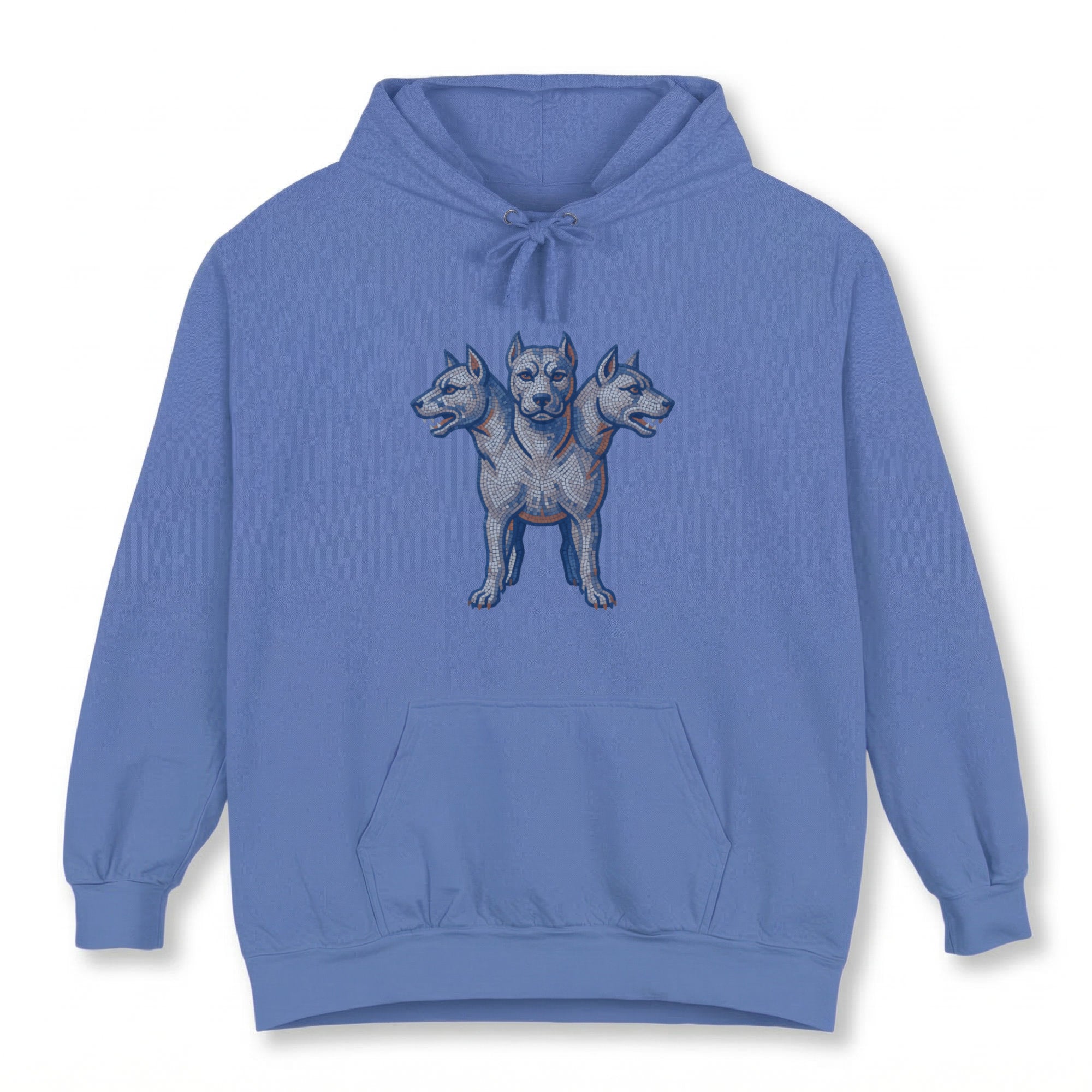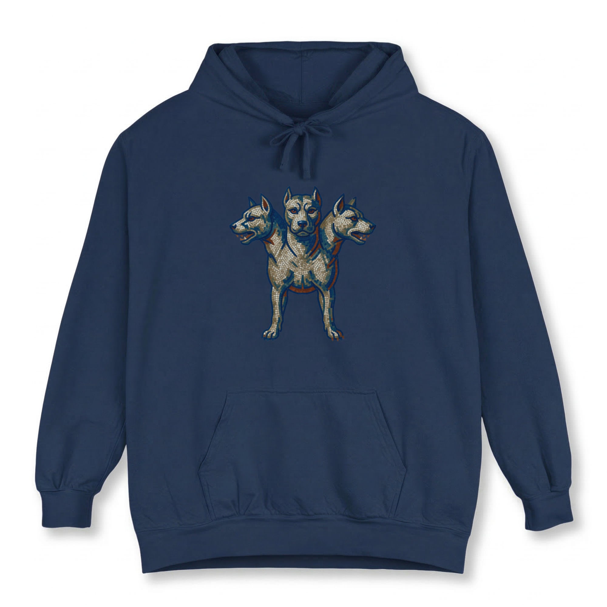 This hoodie features a meticulously detailed graphic of a three-headed dog, inspired by the mythical Cerberus, rendered in an intricate mosaic-like style with vibrant blue and orange accents. Cerberus, the legendary guardian of the Underworld, symbolizes powerful protection, unwavering loyalty, vigilance, and the mastery of thresholds. This unique graphic is perfect for those drawn to ancient mythology, strength, and symbolic guardianship. Its intricate details and bold imagery make it a compelling and conversation-starting piece for any wardrobe.