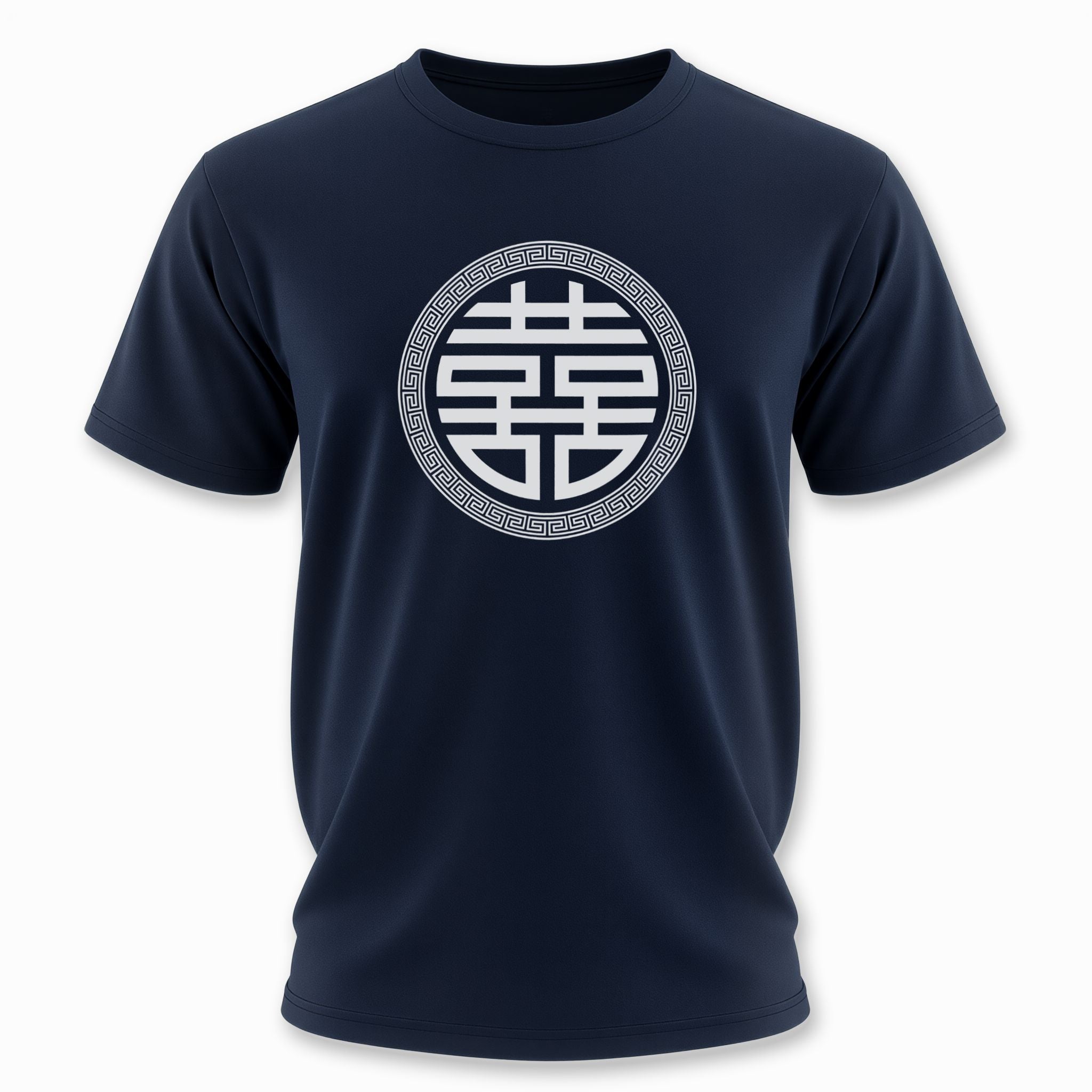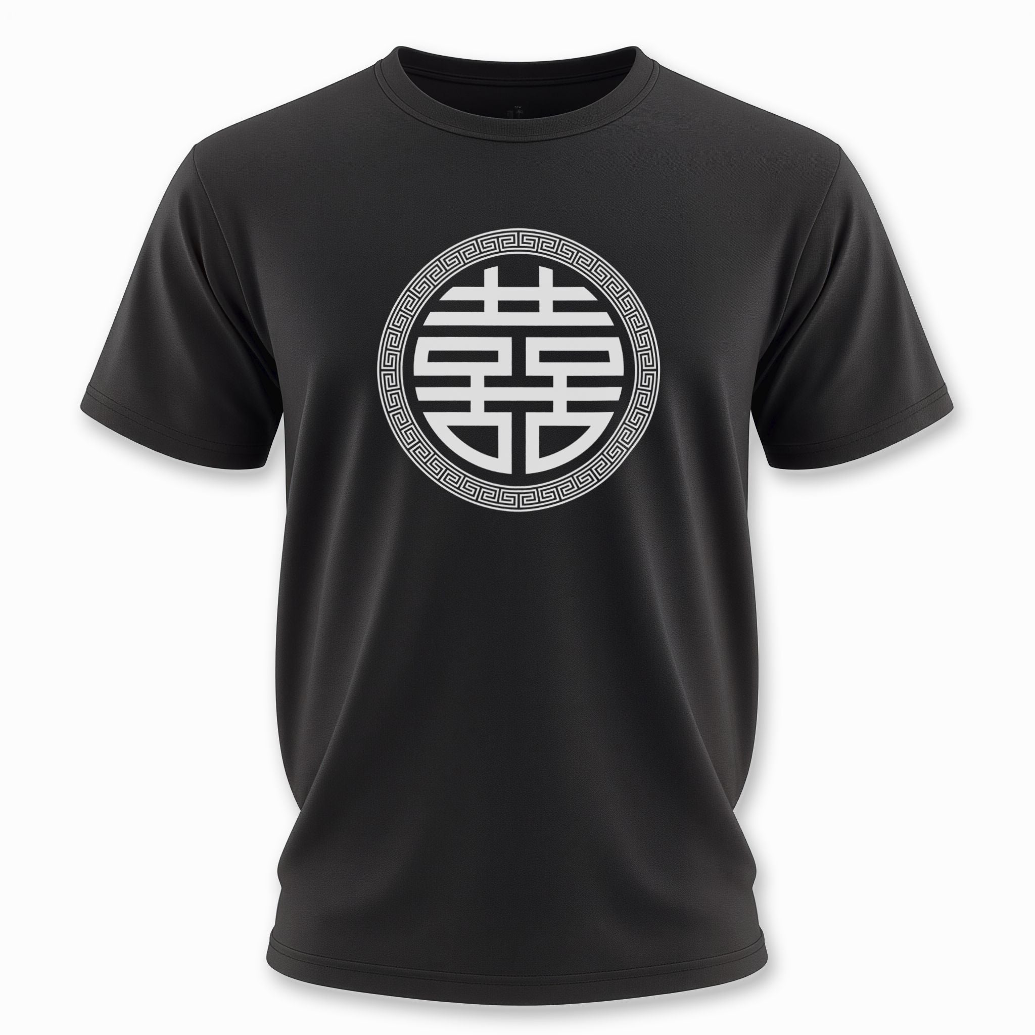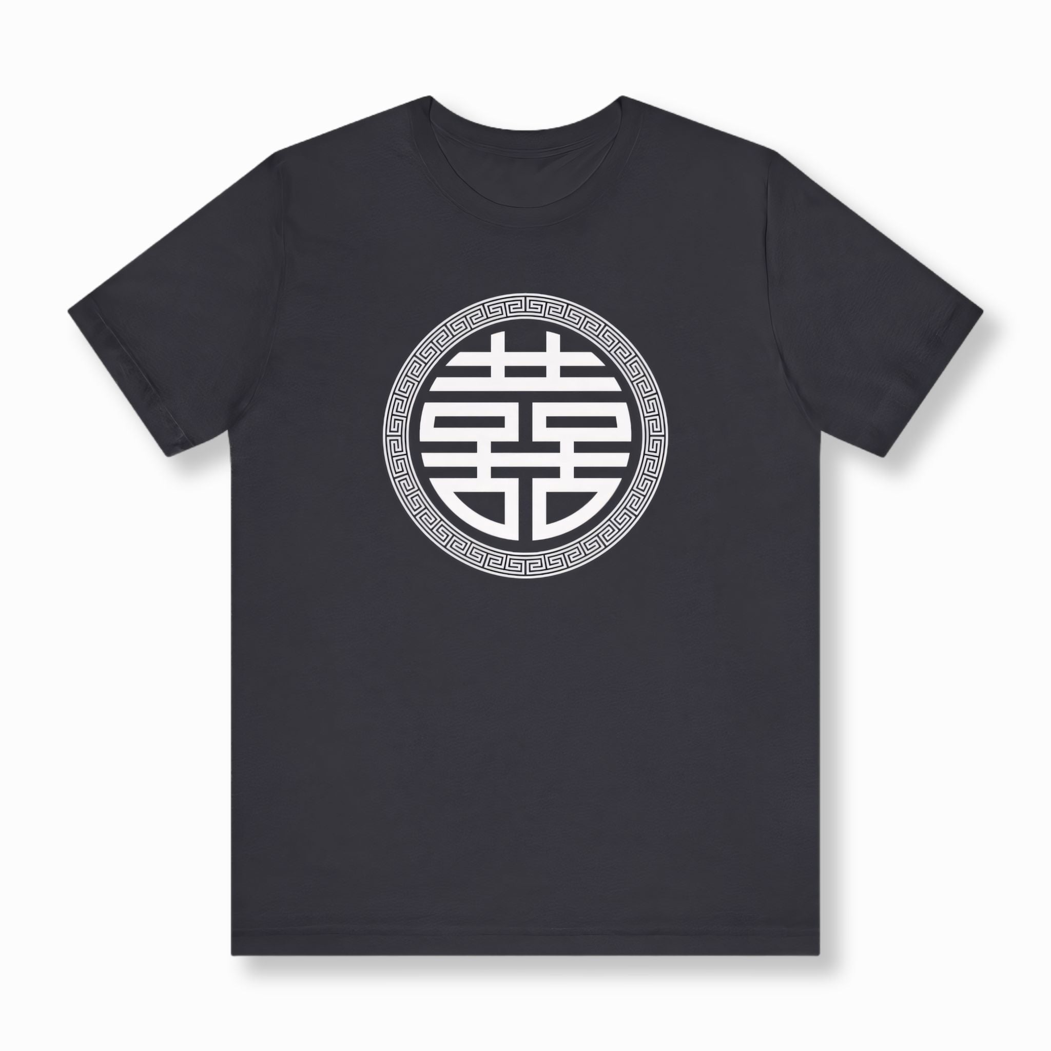 This t-shirt showcases a prominent white graphic of the beloved Chinese Double Happiness symbol (囍), elegantly encircled by a distinct geometric pattern, all set on a timeless black background. The '囍' (xǐ) character is a powerful and auspicious symbol in Chinese culture, traditionally representing marital bliss, abundant joy, and good fortune for couples, widely celebrated at weddings and festive occasions. This design is not only visually striking but also carries deep cultural significance, making it a meaningful and inspiring piece for any wardrobe.