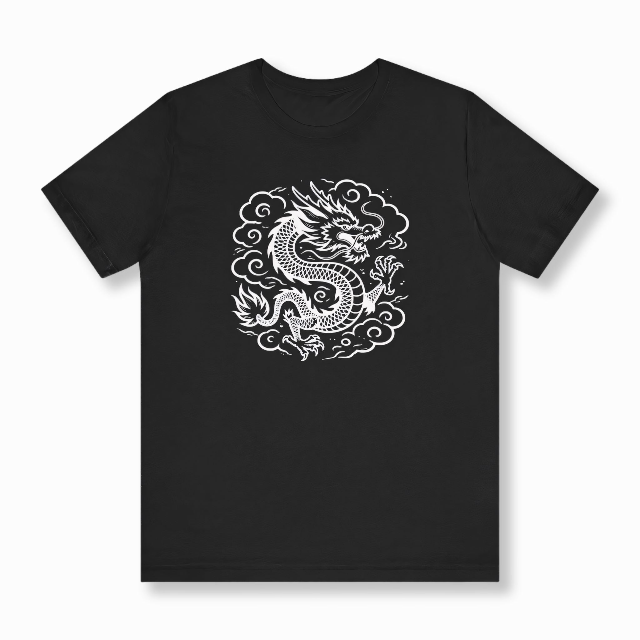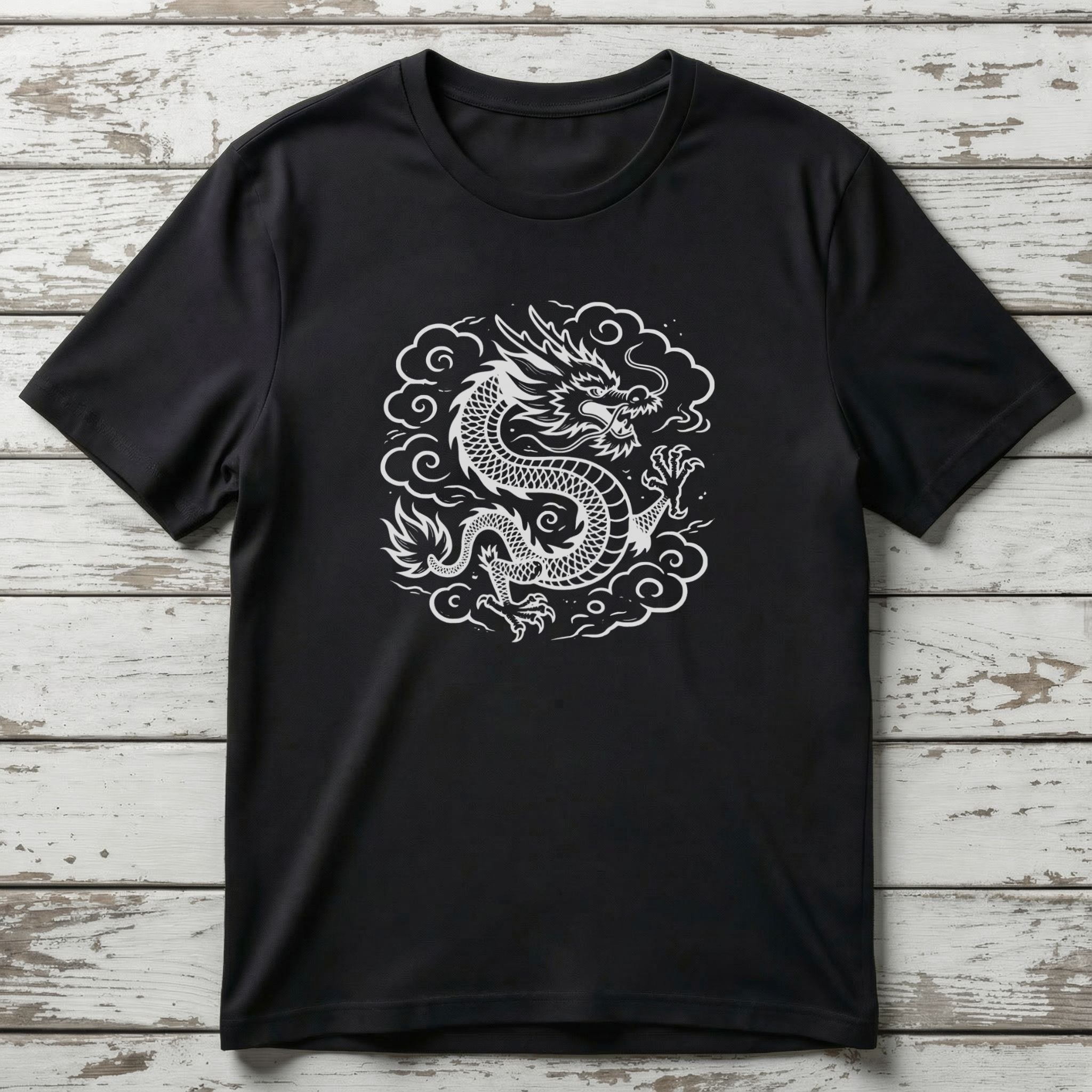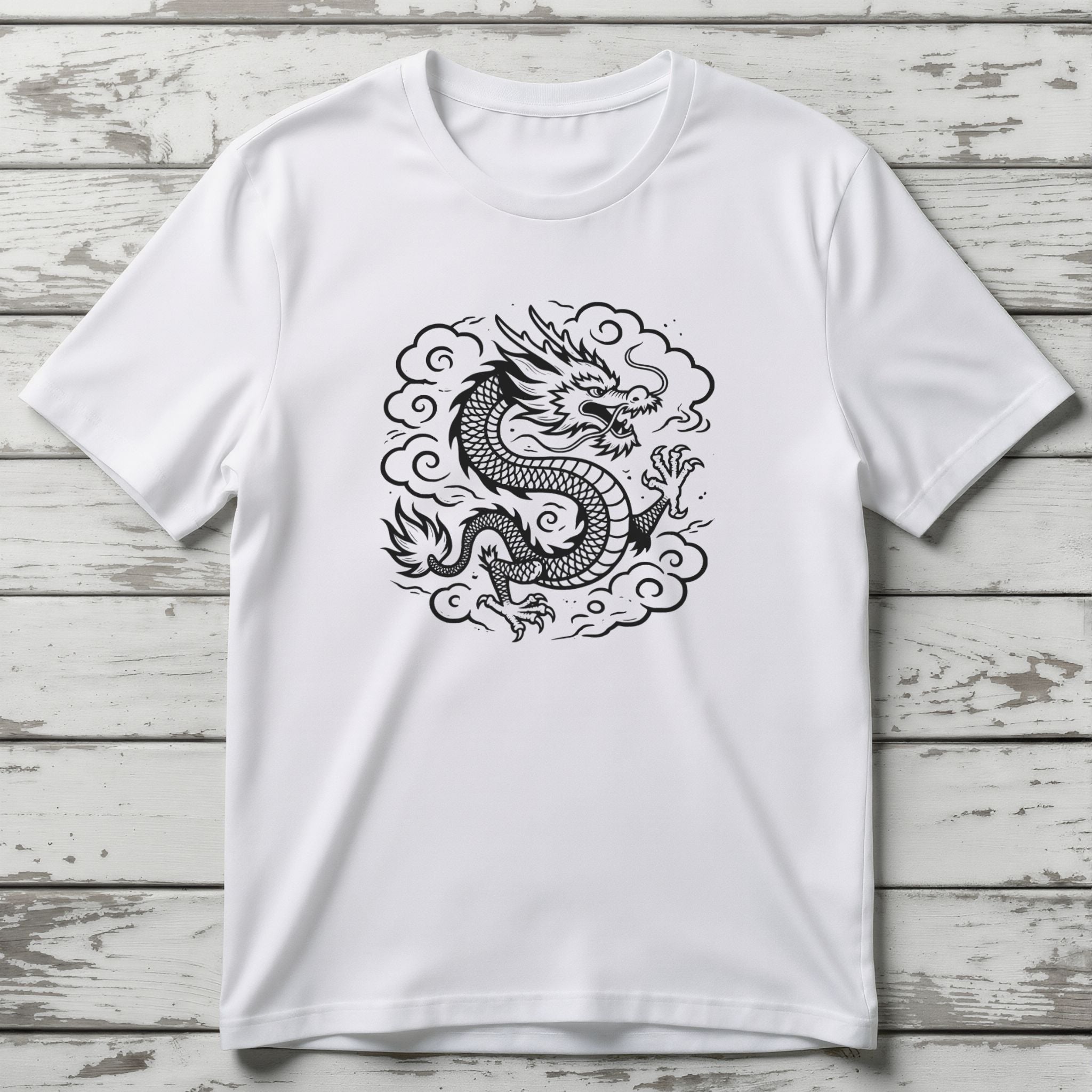 This captivating t-shirt features an intricately detailed white Chinese dragon, rendered in a striking graphic style, set amidst swirling clouds. The design showcases the dragon's majestic scales, fierce claws, and powerful presence, capturing the essence of this mythical creature. In Chinese culture, the dragon is a revered symbol of power, strength, wisdom, good fortune, and prosperity, often associated with control over natural elements and divine authority. This eye-catching graphic is perfect for those who appreciate rich cultural symbolism and powerful artistic expression, making a bold statement.