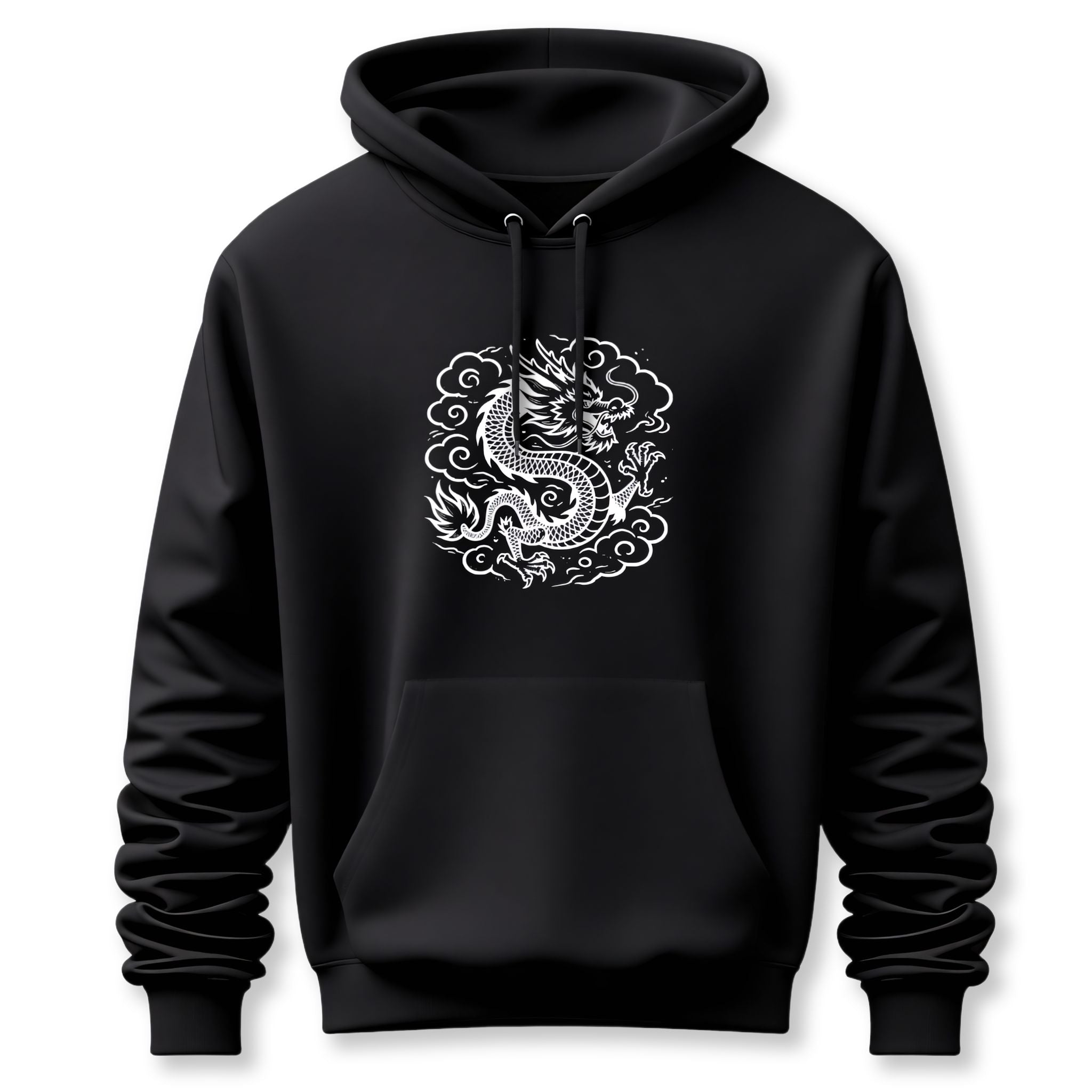This hoodie features a striking white outline design of a majestic coiled Chinese dragon, gracefully surrounded by swirling clouds. The Chinese dragon is a revered symbol in East Asian culture, embodying immense power, strength, wisdom, good fortune, and prosperity. It is often associated with control over natural elements like water and weather, signifying auspiciousness and divine authority. This intricate graphic is perfect for those who appreciate rich cultural symbolism and powerful mythological artistry. Its detailed artwork makes it a captivating and unique statement piece for any wardrobe.