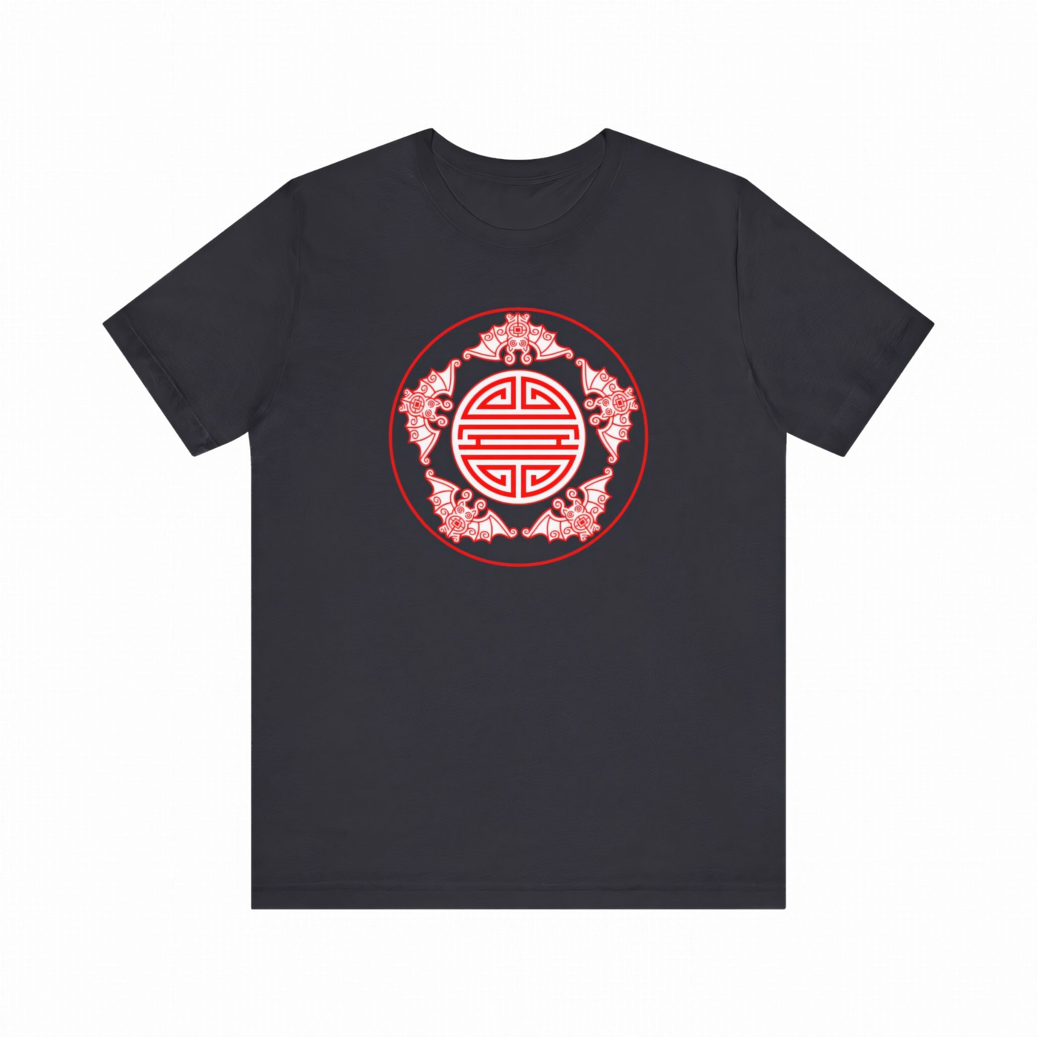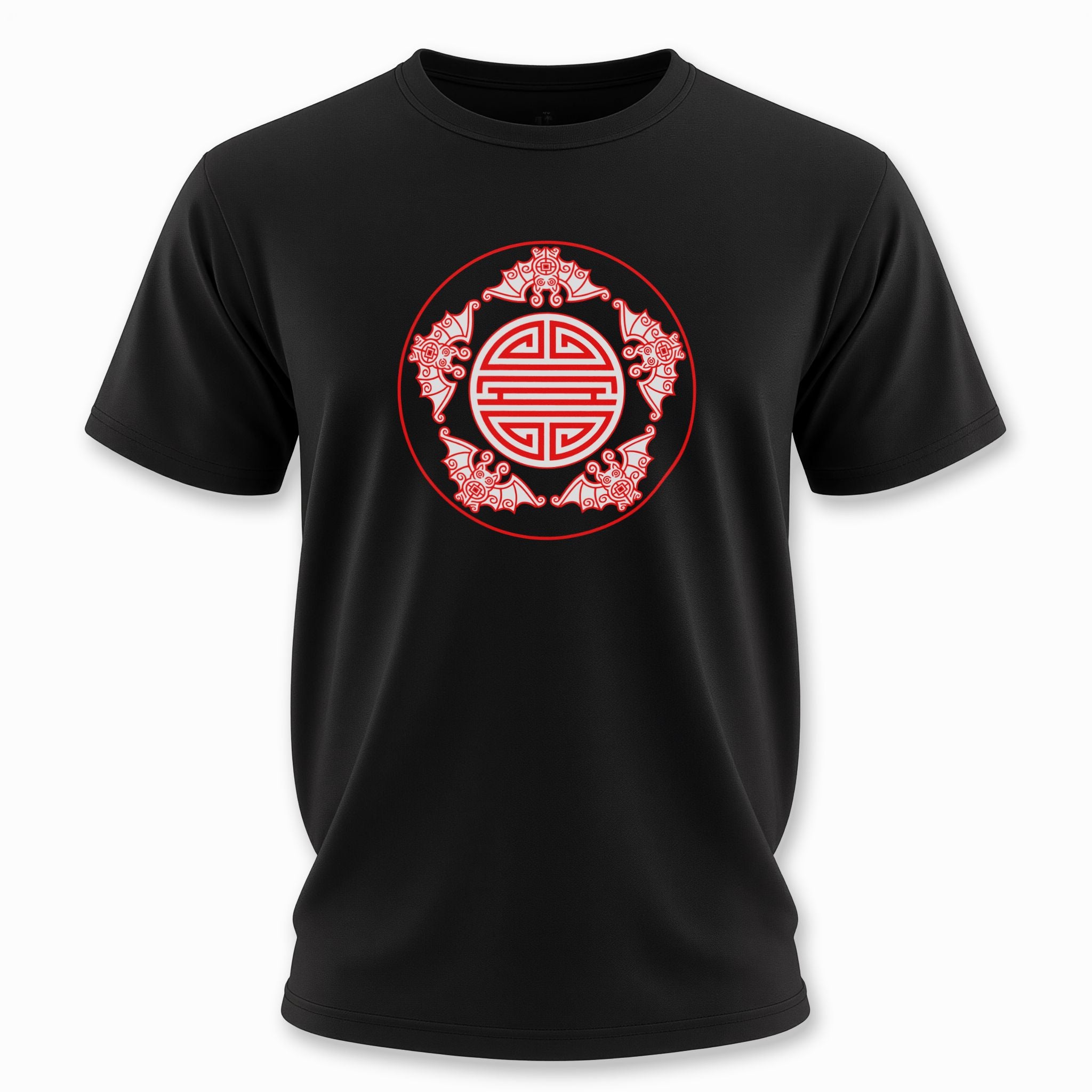 This t-shirt features a striking red and white graphic with a central traditional Chinese 'Shou' (Longevity) symbol, elegantly encircled by eight stylized bats. In Chinese culture, bats (蝠, fú) are powerful symbols of good fortune, as the word sounds similar to 'good fortune' (福, fú). The design draws inspiration from the revered 'Five Blessings' (五福临门, wǔ fú lín mén) – typically representing longevity, wealth, health, virtue, and a peaceful death. While stylistically featuring eight bats for balance and added prosperity symbolism, the essence of good fortune is beautifully captured, with the central 'Shou' symbol reinforcing wishes for a long and prosperous life. This unique graphic is perfect for those who appreciate rich cultural symbolism and desire to carry blessings of good fortune and longevity. Its intricate details and vibrant color make it an eye-catching and meaningful statement piece.