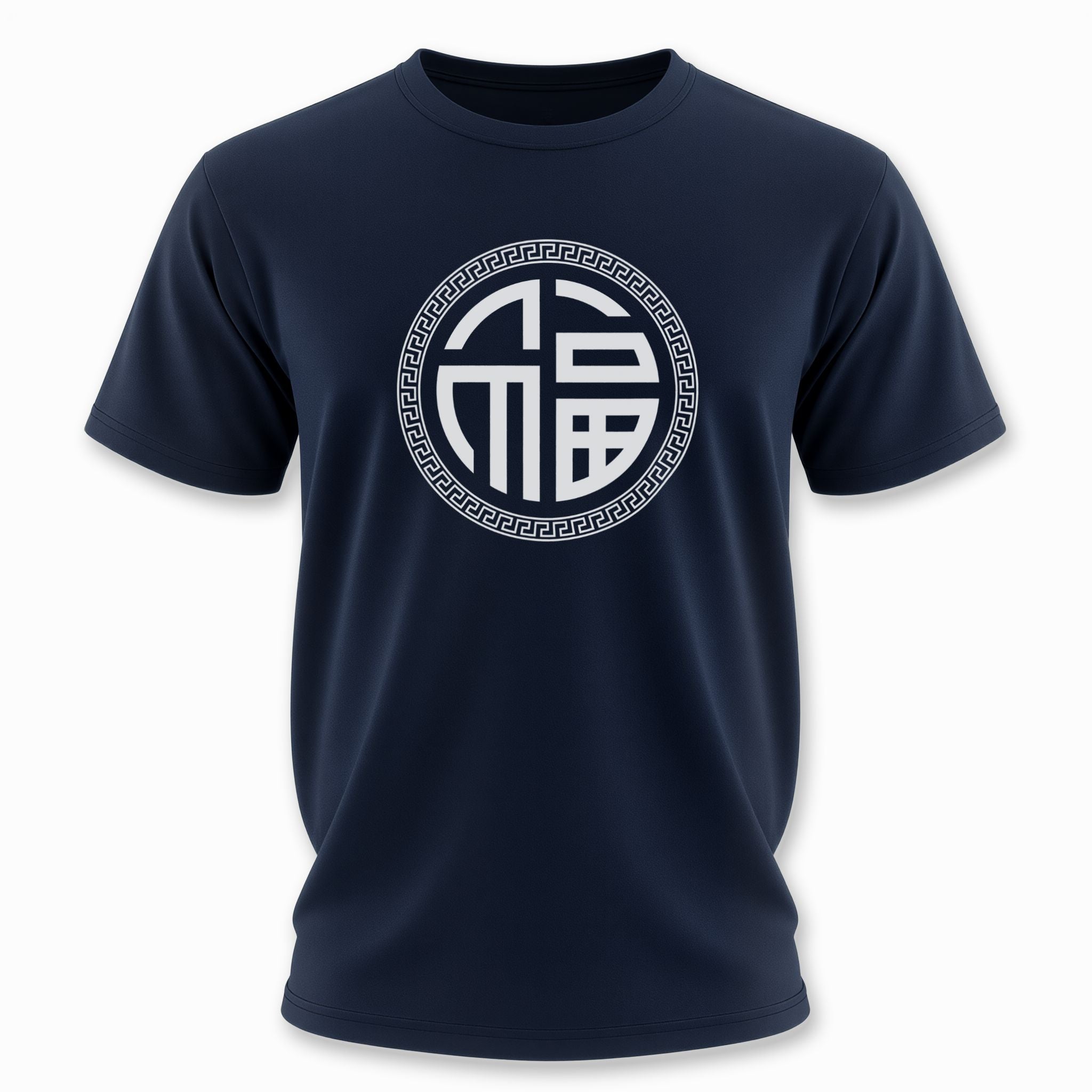 This t-shirt features a captivating white graphic of the traditional Chinese character 'Fu' (福) elegantly enclosed within a circular border, adorned with a classic Greek key pattern. The character 'Fu' is a powerful and beloved symbol in Chinese culture, representing good fortune, blessings, prosperity, and happiness. This design beautifully merges ancient cultural significance with a stylish, timeless aesthetic, making it a unique statement piece for those who appreciate cultural symbolism and positive energy.