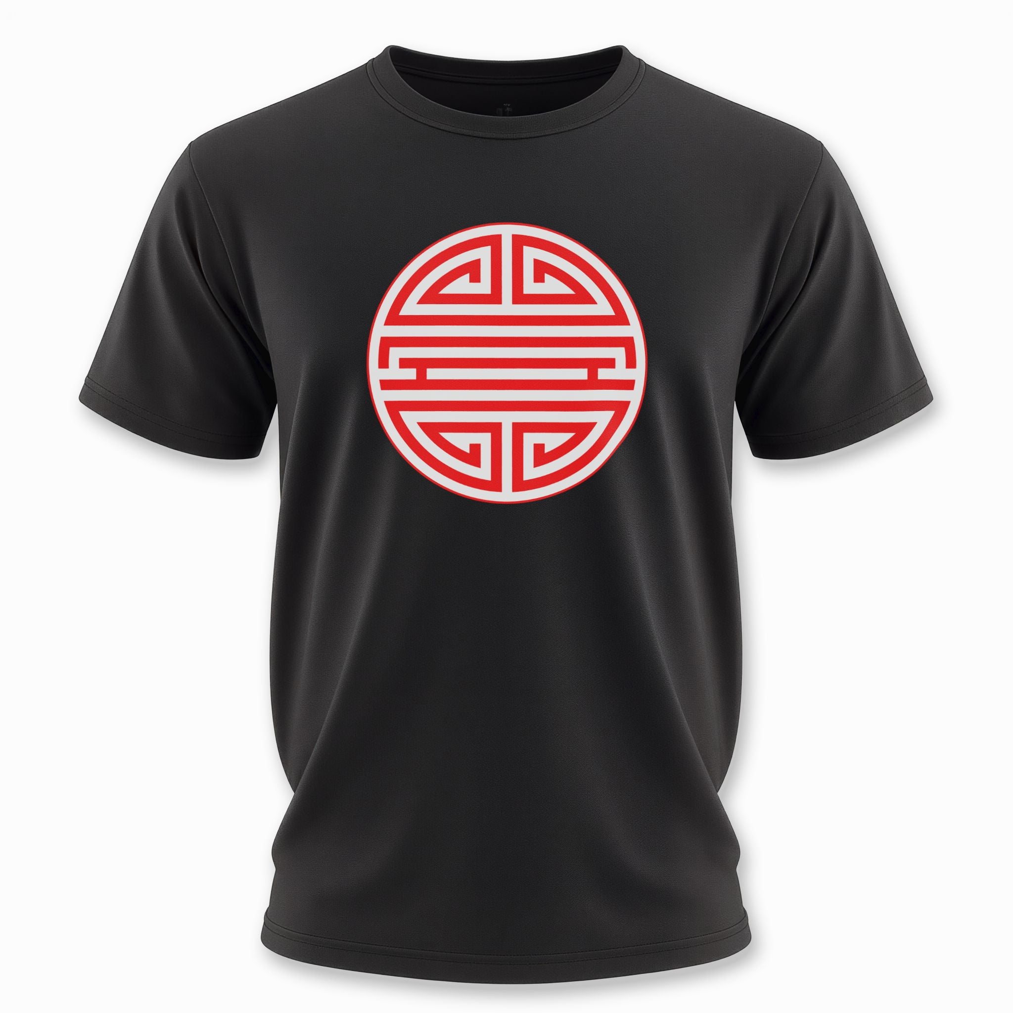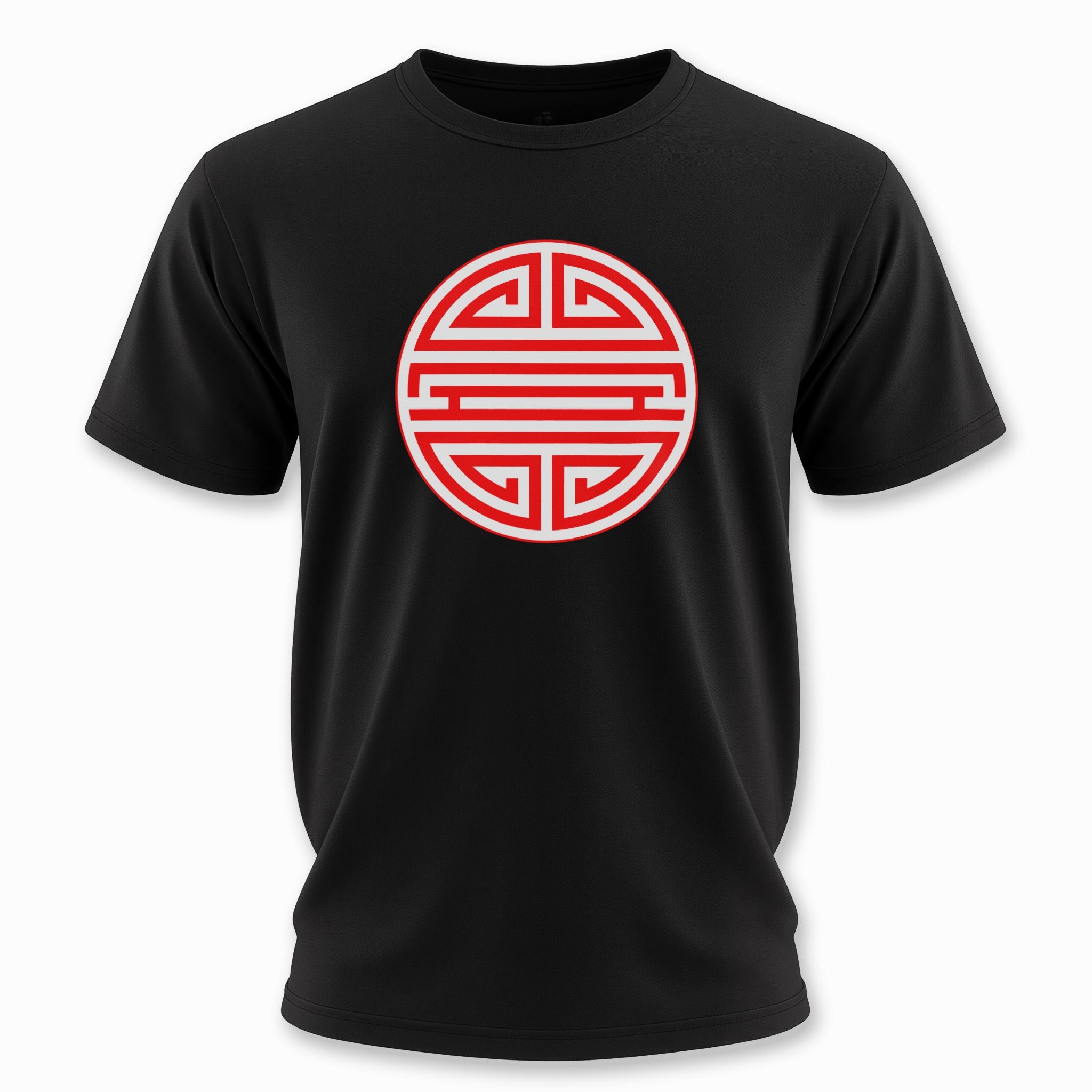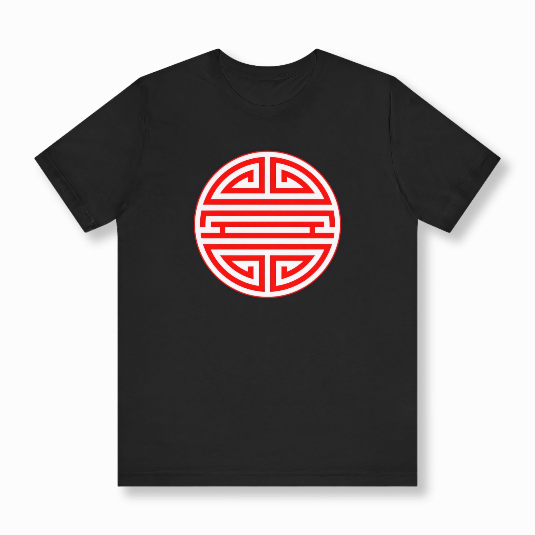 This t-shirt features a striking red and white circular emblem showcasing the iconic Chinese Shou (壽) symbol. Rendered with clean, graphic lines, the design is a bold and instantly recognizable representation of one of China's most cherished characters. The Shou symbol profoundly represents longevity, good health, and a long, prosperous life, often associated with blessings, wisdom, and well-being. This culturally rich graphic offers a timeless statement, perfect for those who appreciate meaningful art and auspicious symbolism, making it a standout piece that brings ancient wisdom and positive energy to any wardrobe.