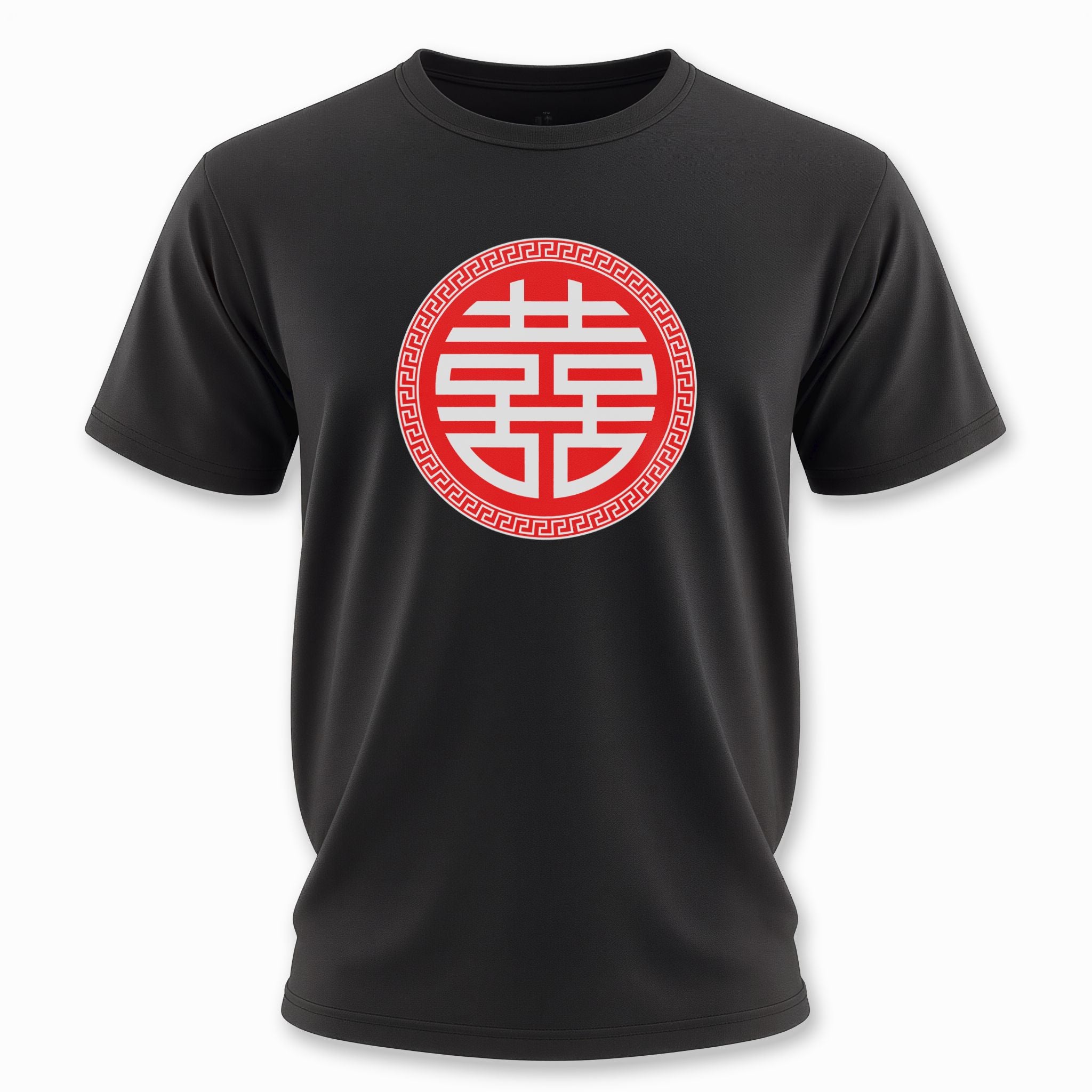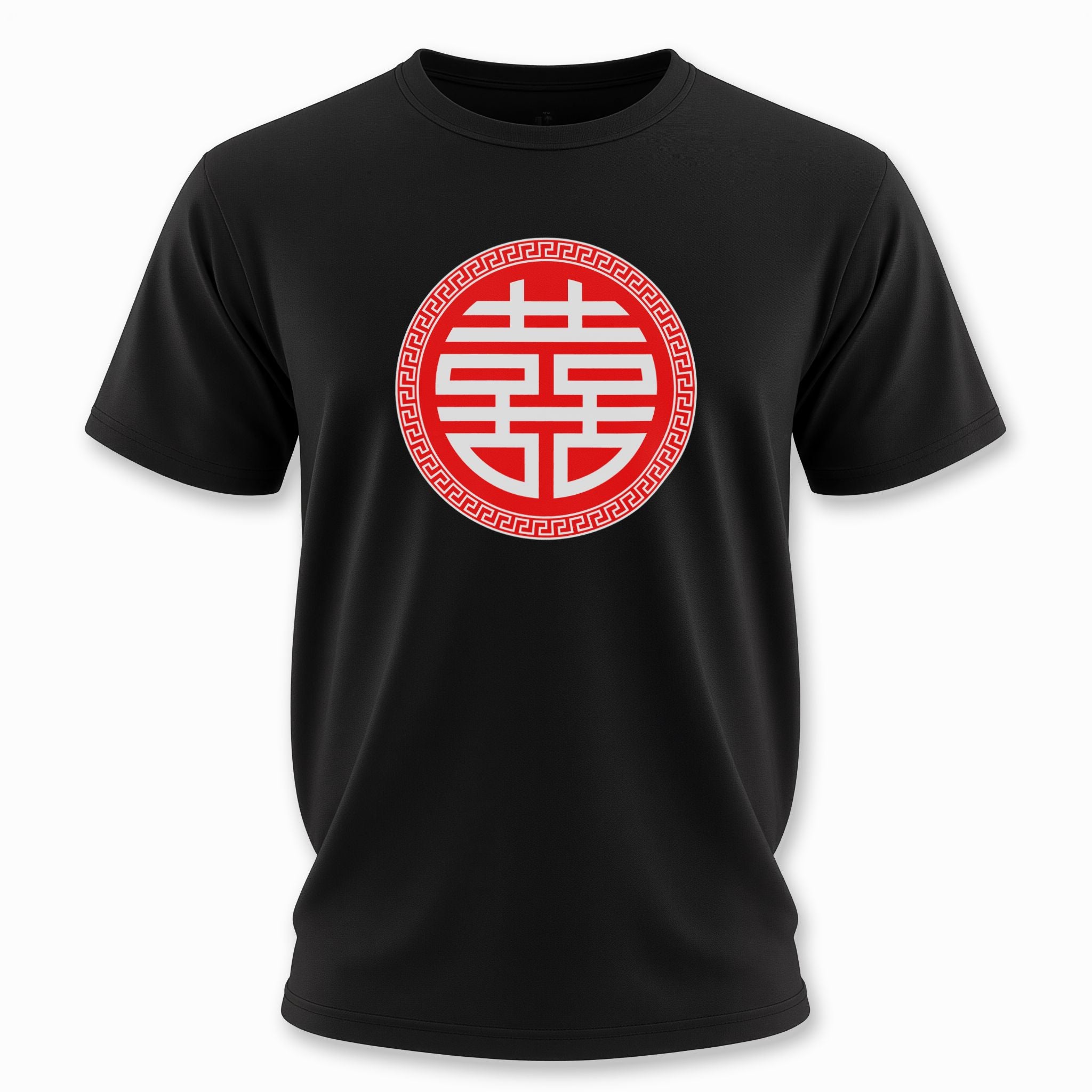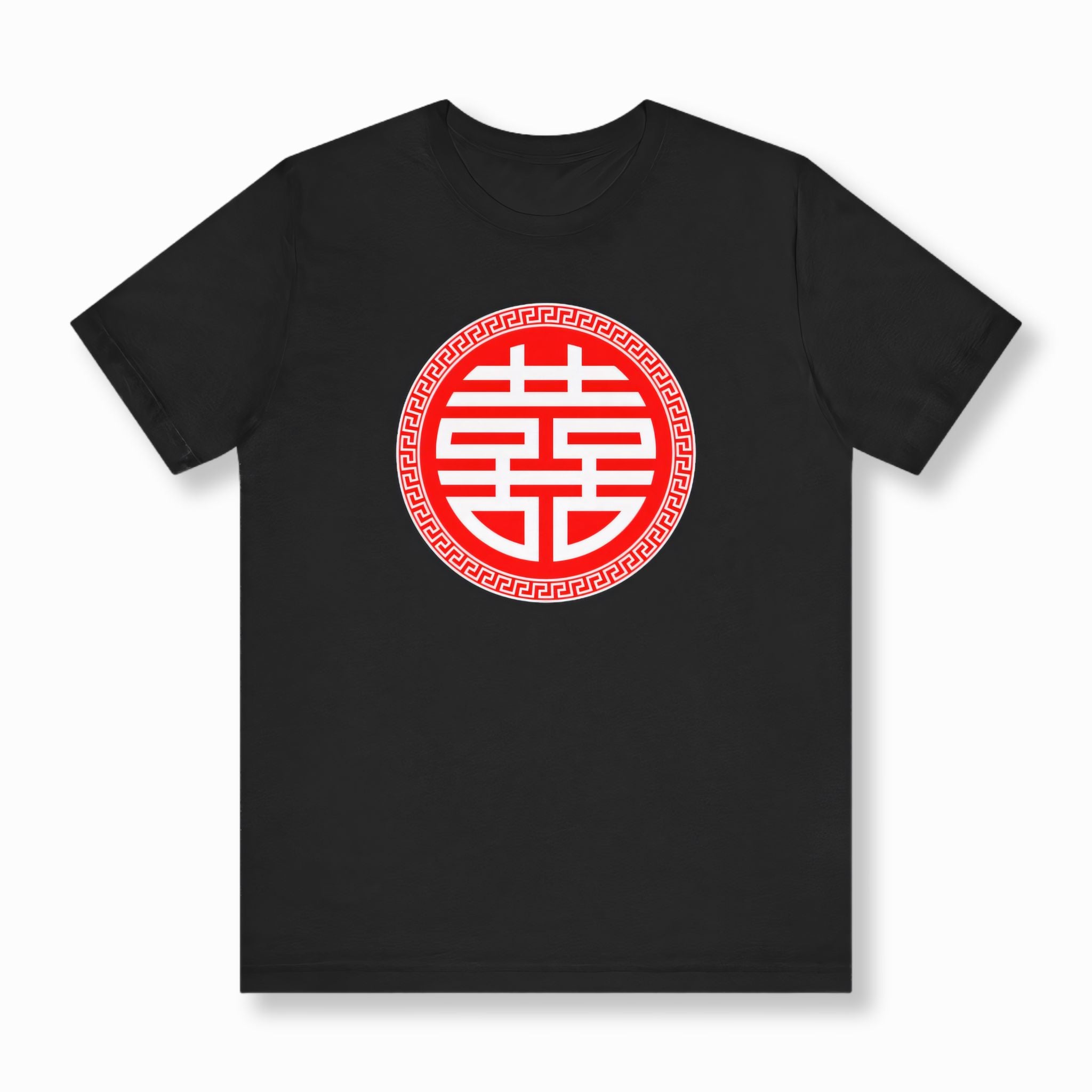This t-shirt features a striking red Chinese Double Happiness '囍' symbol, elegantly encircled by a white Greek key pattern, presented on a classic black background. The '囍' (Xi) symbol is a powerful and cherished emblem in Chinese culture, traditionally representing immense joy, good fortune, and enduring love, especially associated with happy marriages and new beginnings. It beautifully signifies the happiness shared by two individuals. This design is a heartfelt expression of cultural heritage and a universal wish for prosperity and harmony, making it a truly meaningful and eye-catching piece.