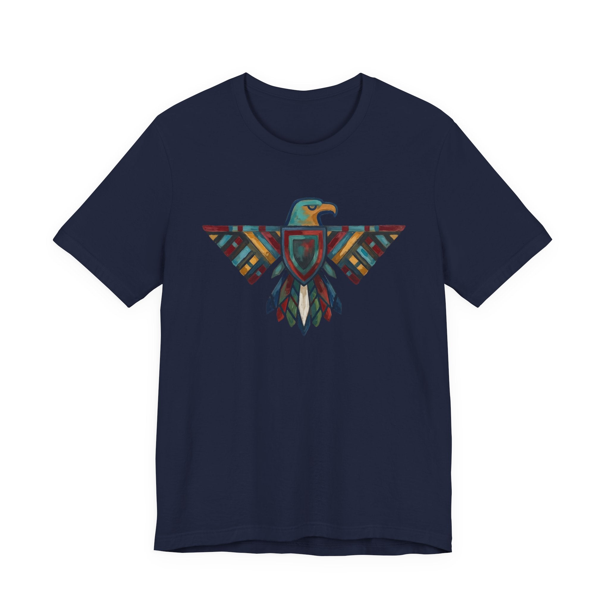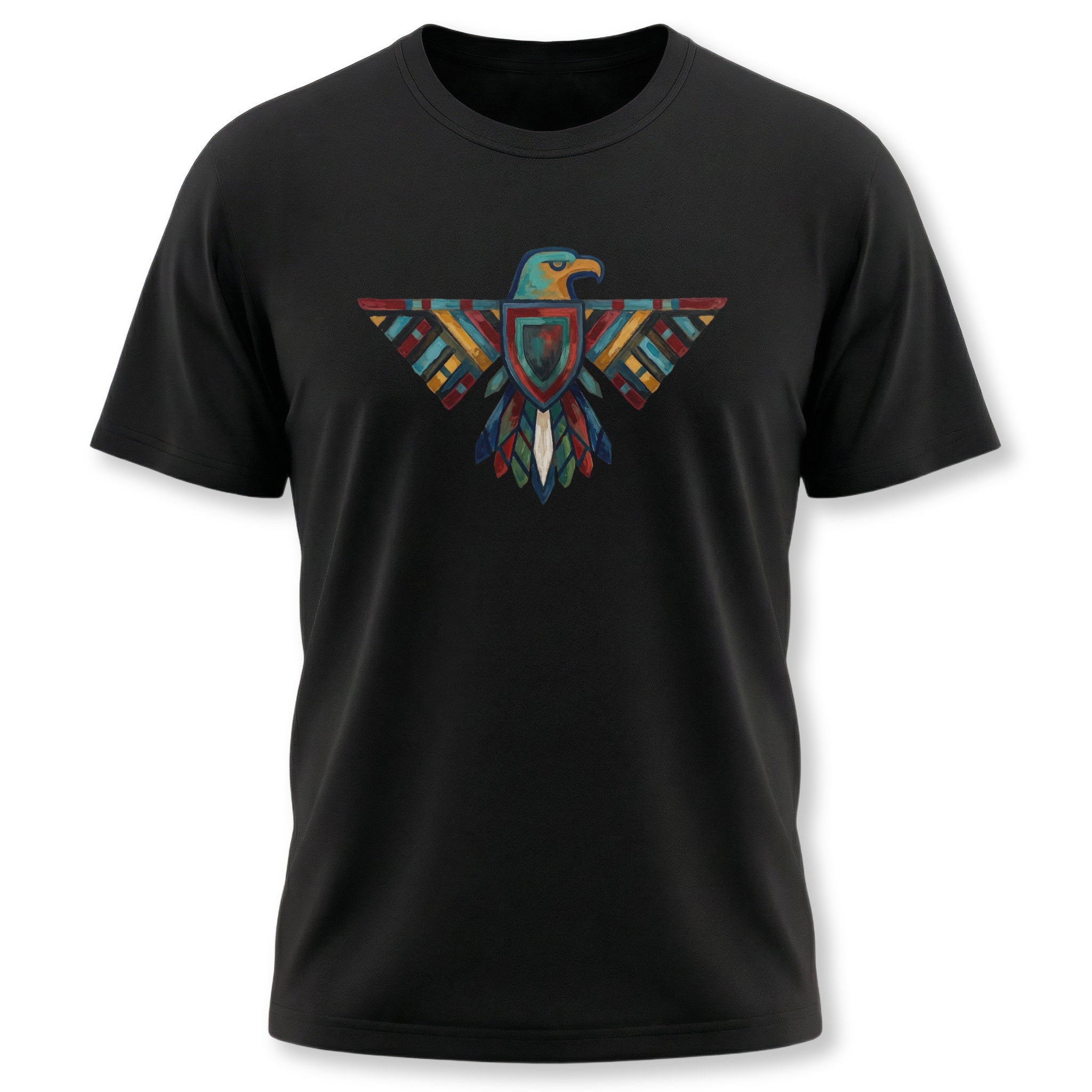 This t-shirt features a striking geometric design of a majestic thunderbird with outstretched wings, rendered in a vibrant mosaic style. The intricate patterns and earthy yet bold colors like teal, red, yellow, and deep blue evoke a sense of power and ancient symbolism. Inspired by Native American art, the thunderbird is a powerful spirit animal known to represent strength, protection, and spiritual transformation. This unique graphic is visually captivating and carries a profound cultural meaning, making it a standout piece for any wardrobe.