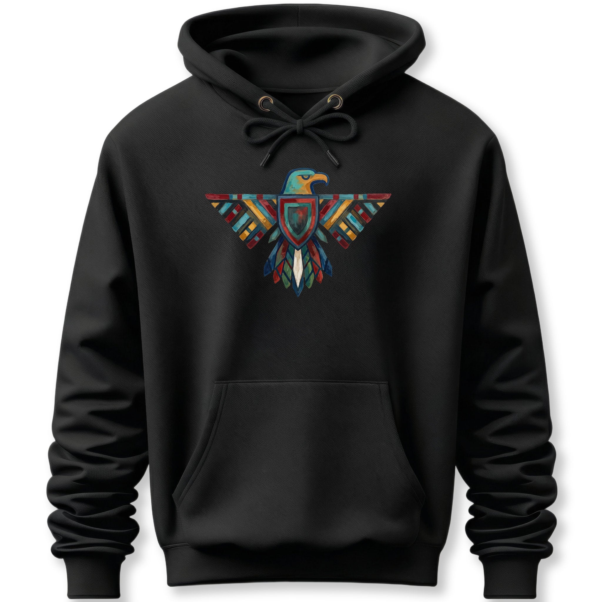 This hoodie showcases a stunning, stylized Thunderbird graphic, rendered in a captivating mosaic of vibrant, earthy tones. Inspired by the revered mythical creature in indigenous cultures, this design embodies power, protection, and the spirit of renewal. The intricate geometric patterns and rich color palette create a unique artistic statement, perfect for those who appreciate cultural depth and eye-catching graphic appeal.