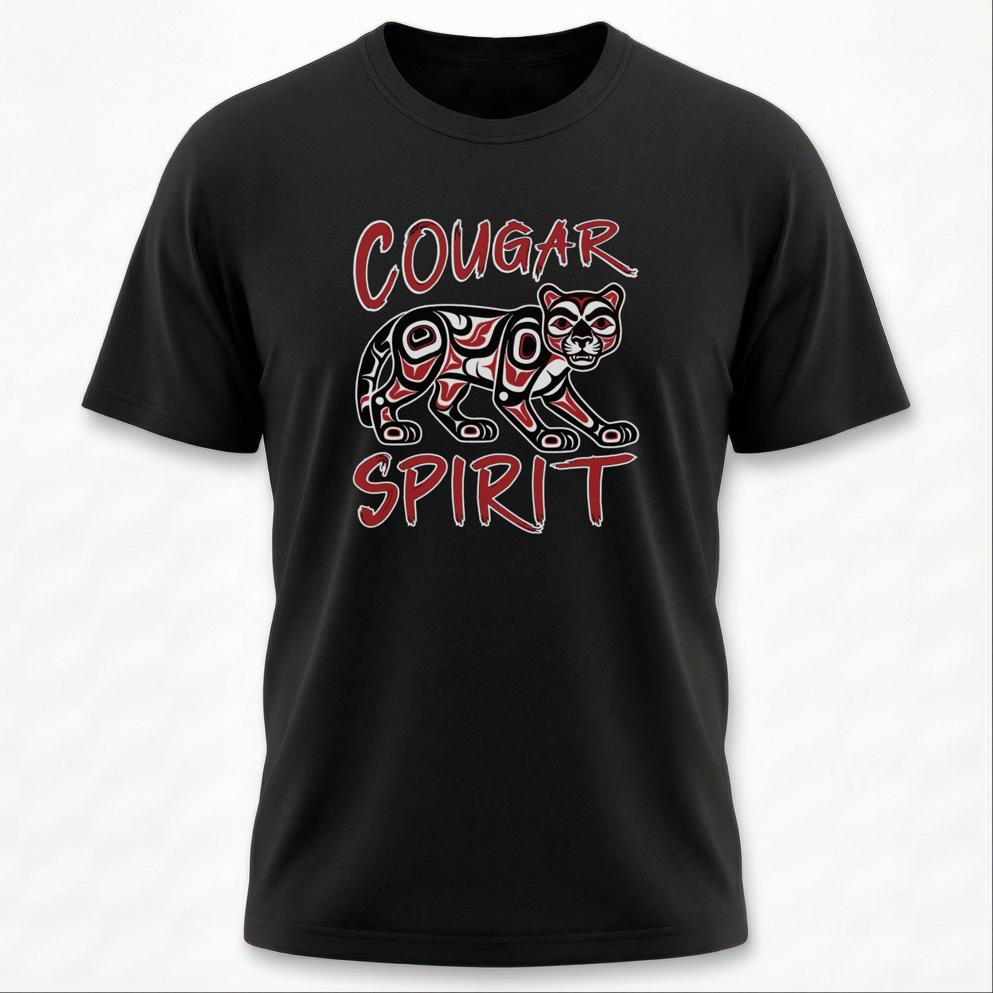 This t-shirt features a powerful graphic of a cougar, stylized with the intricate details of Pacific Northwest formline art. Rendered in classic black, white, and red, the design incorporates traditional ovoid and U-shapes, framing the words "COUGAR SPIRIT." The cougar, also known as a mountain lion, is a revered animal in many cultures, symbolizing strength, leadership, intuition, and a deep connection to the wild. This design evokes the animal's powerful essence and spiritual guidance. It's a unique blend of natural power and rich artistic heritage, perfect for those who appreciate meaningful and visually striking apparel that tells a story.