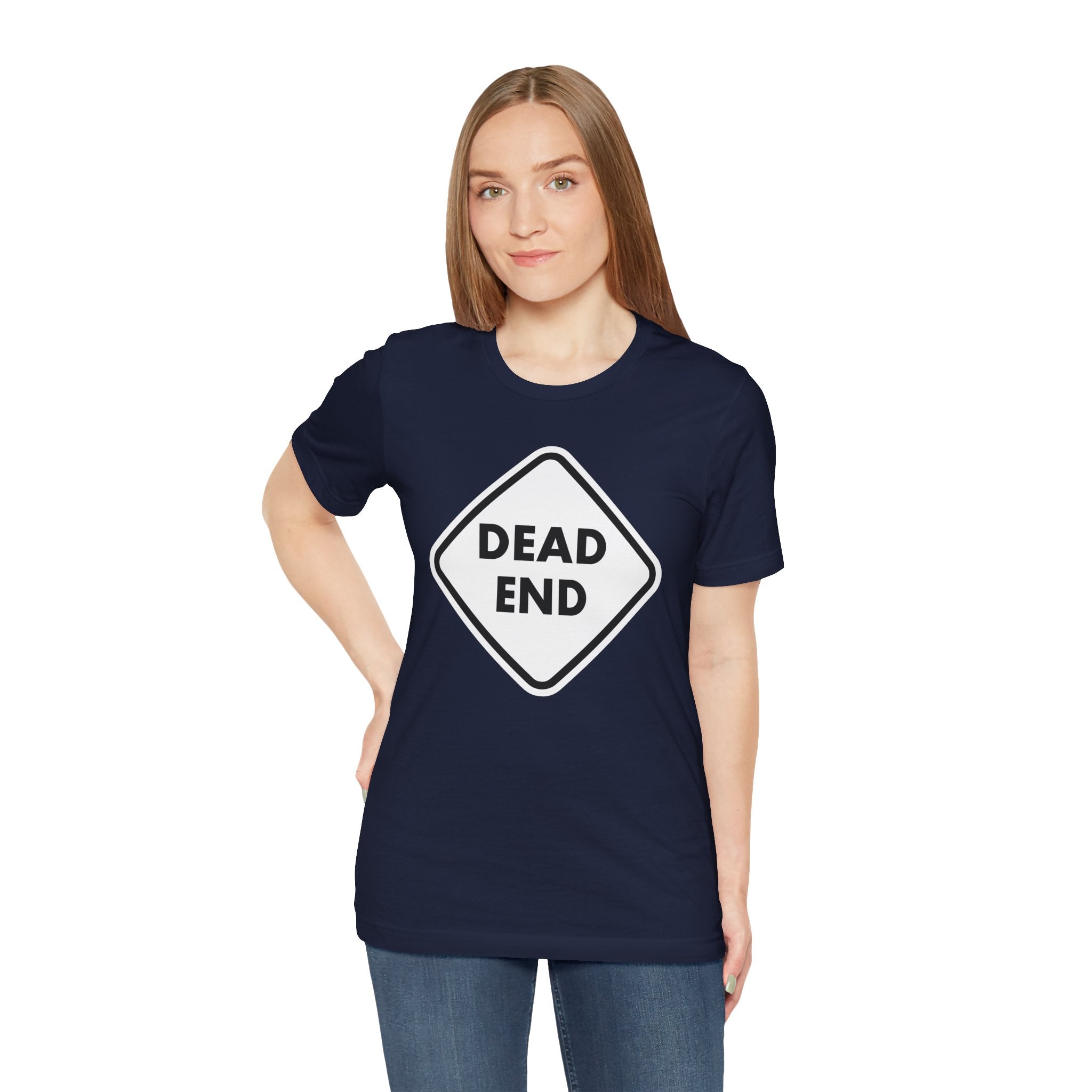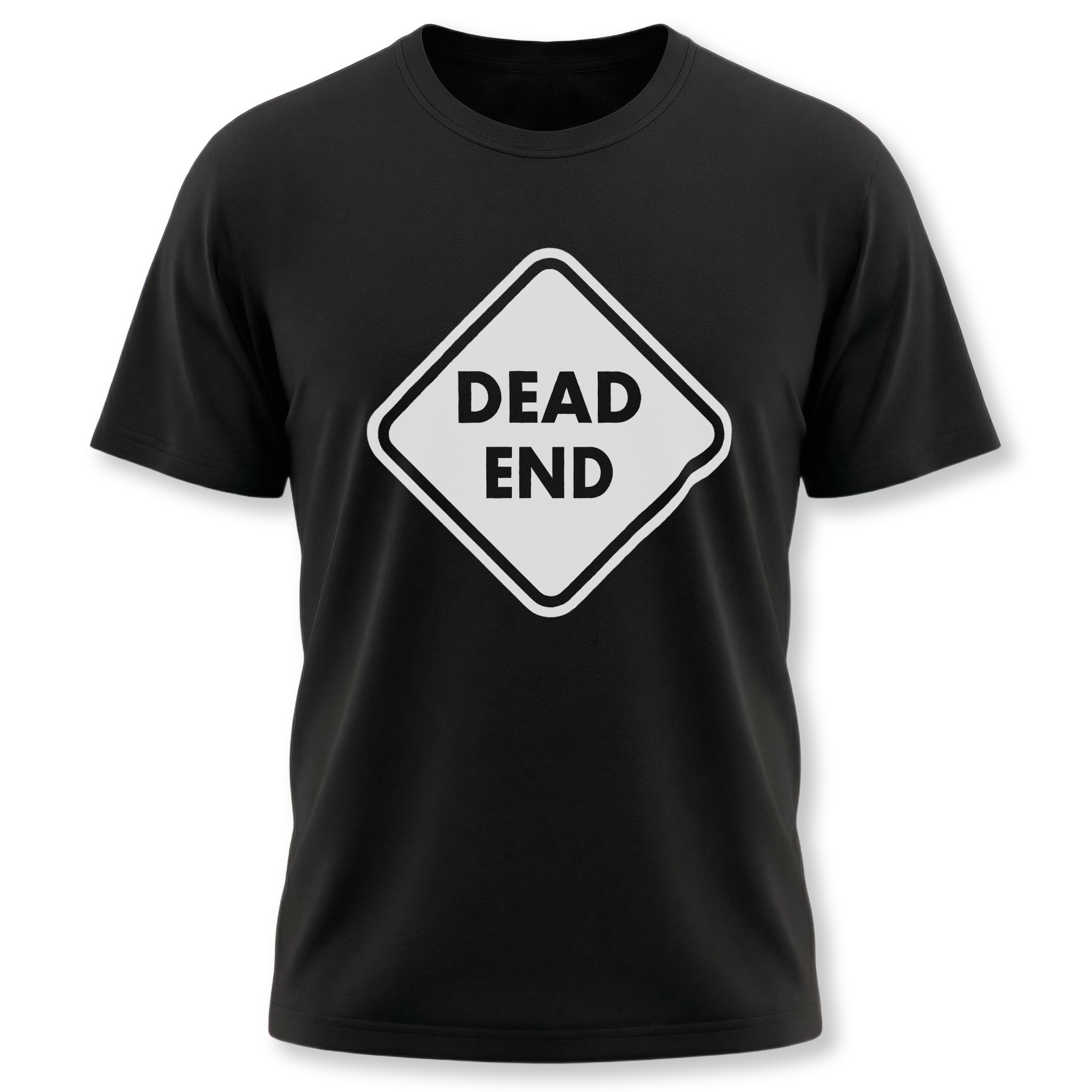 This t-shirt features a bold graphic of a classic diamond-shaped "DEAD END" road sign, rendered in crisp white with striking black lettering. This iconic imagery, often a warning of a path without further progress, can be interpreted in a multitude of ways – from a humorous commentary on frustrating situations or a rebellious stance against limitations, to a philosophical nod to life's unexpected turns. It's a straightforward yet profound statement piece. The design is direct and eye-catching, making it a unique conversation starter for those who appreciate wit and unconventional expression.