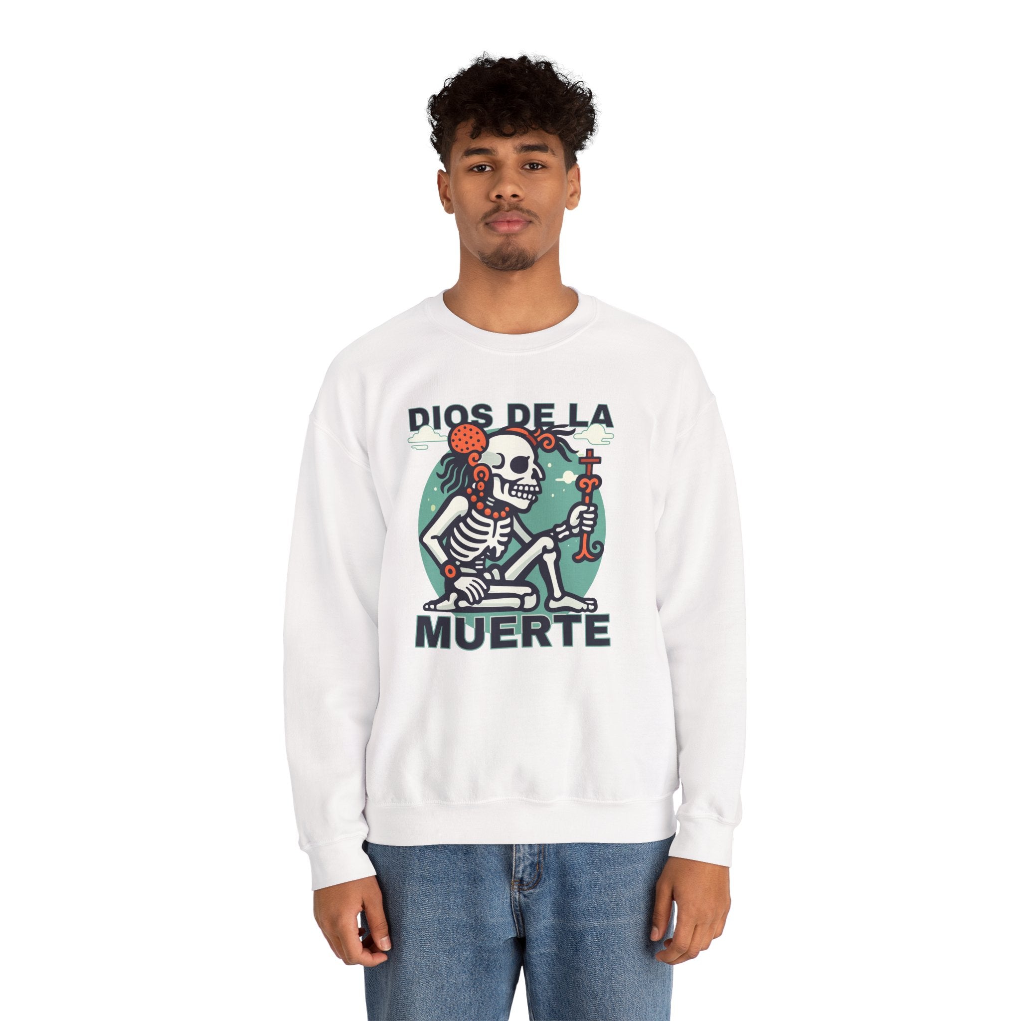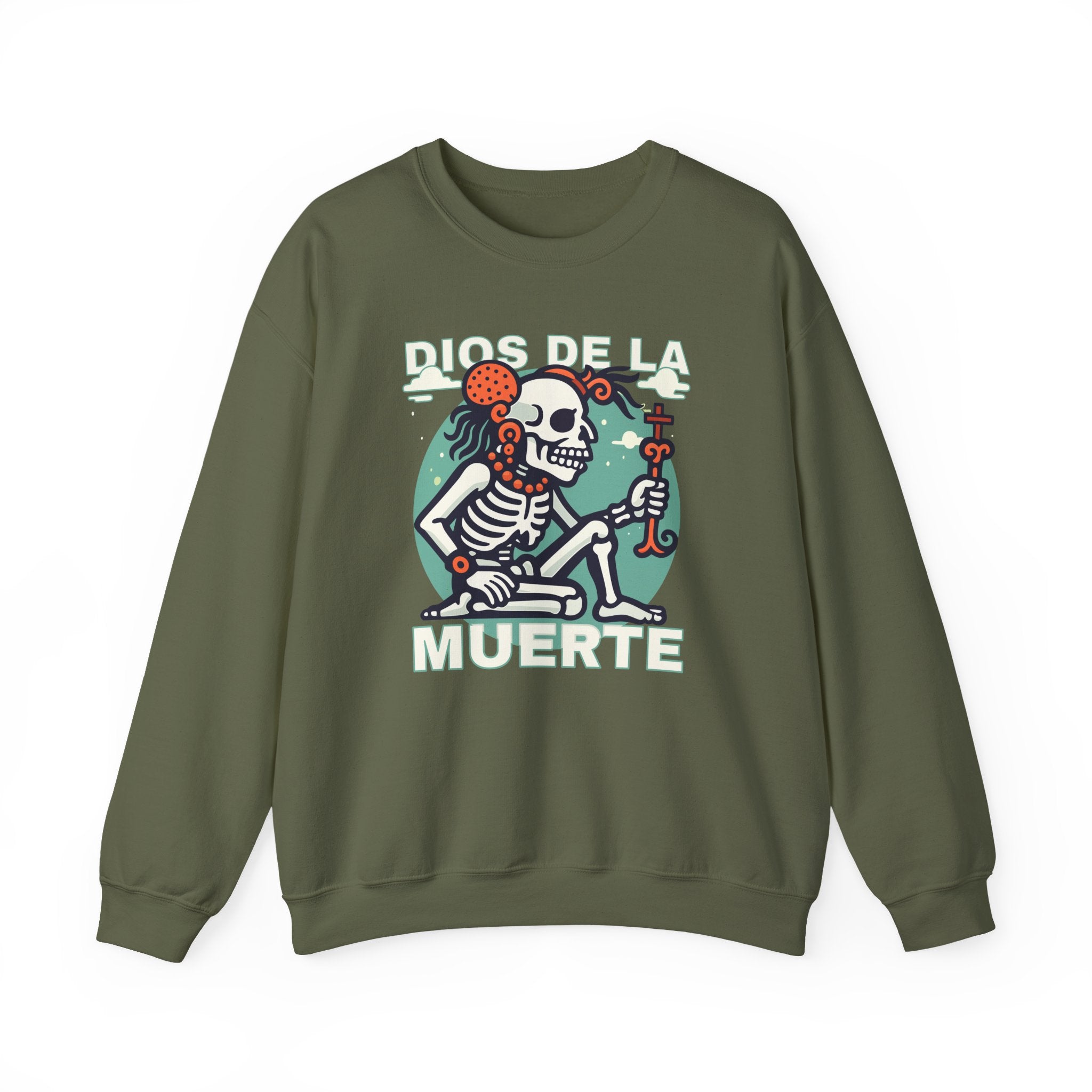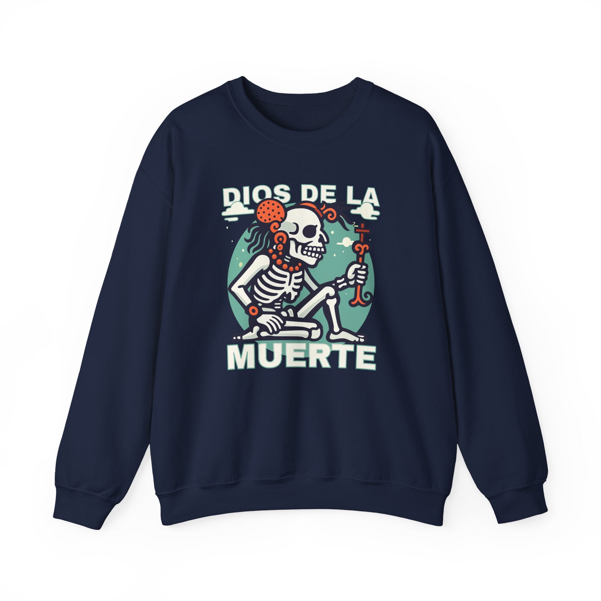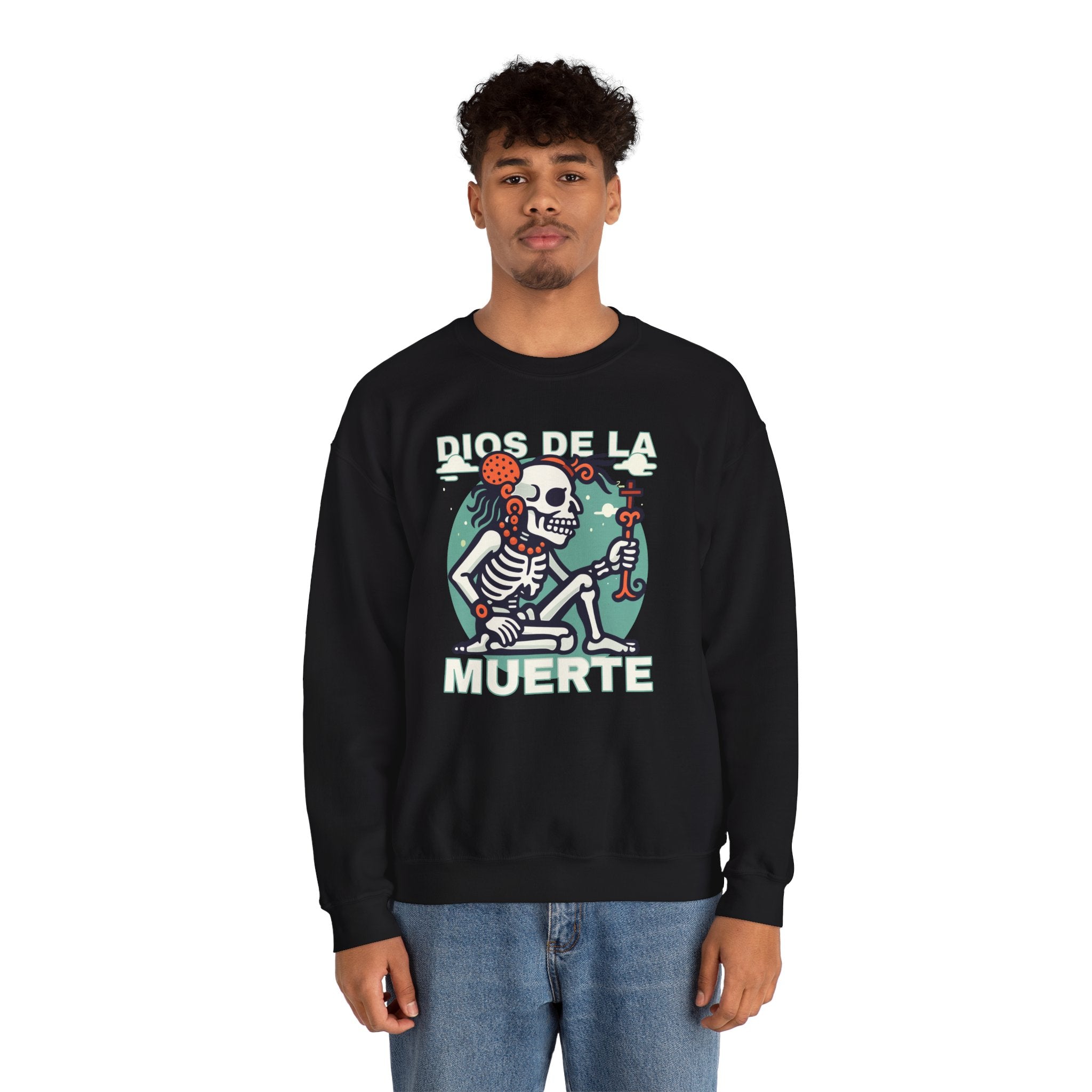 This sweatshirt features a captivating graphic of the "Dios de la Muerte," or God of Death, depicted as a stylized skeleton figure. Adorned with a striking traditional headpiece and a symbolic staff, this design reimagines the deity as a figure of ancient wisdom and cultural reverence rather than fear. It evokes the rich heritage of Mesoamerican mythologies, where death is an essential, often celebrated, aspect of existence. The unique artistic style and profound symbolism make this a captivating and eye-catching statement piece for anyone who appreciates cultural depth and distinctive graphic apparel.