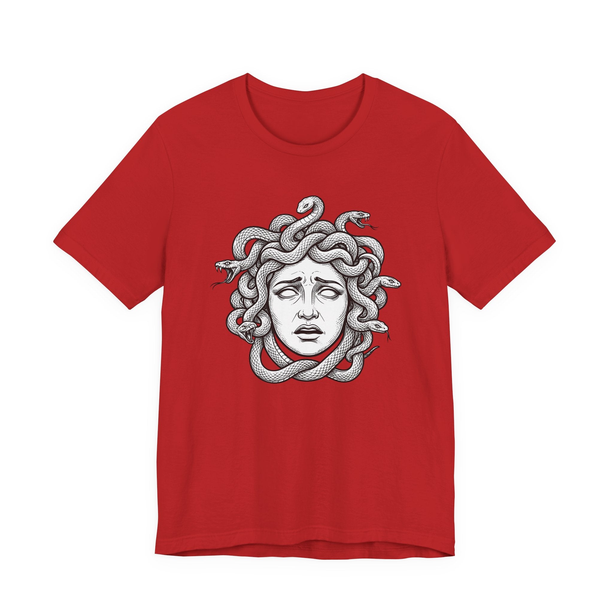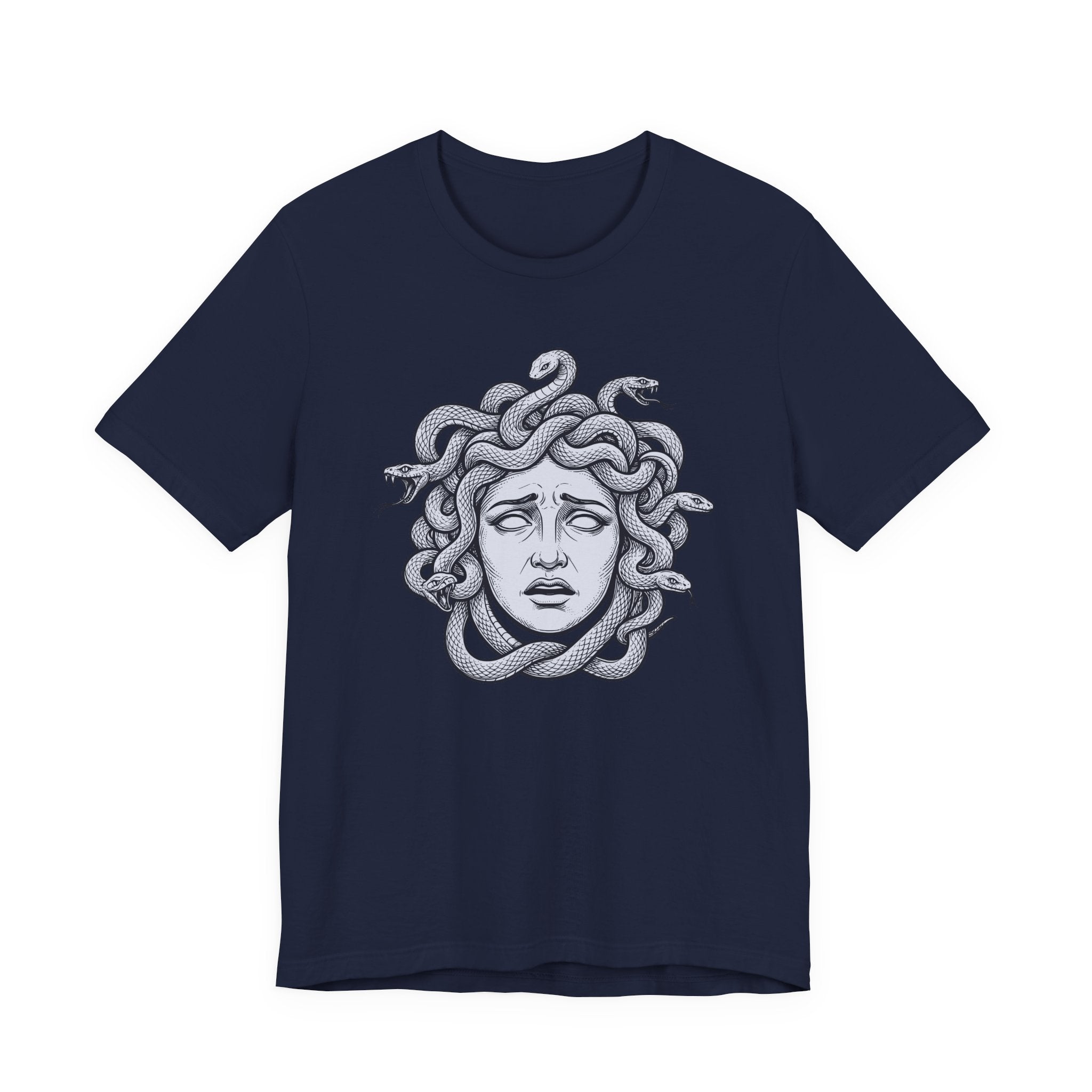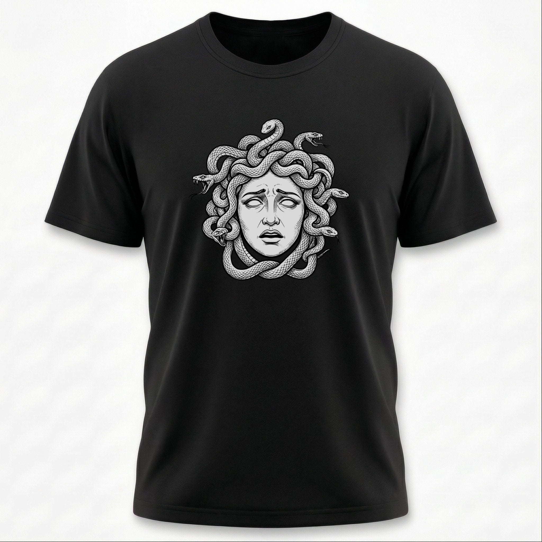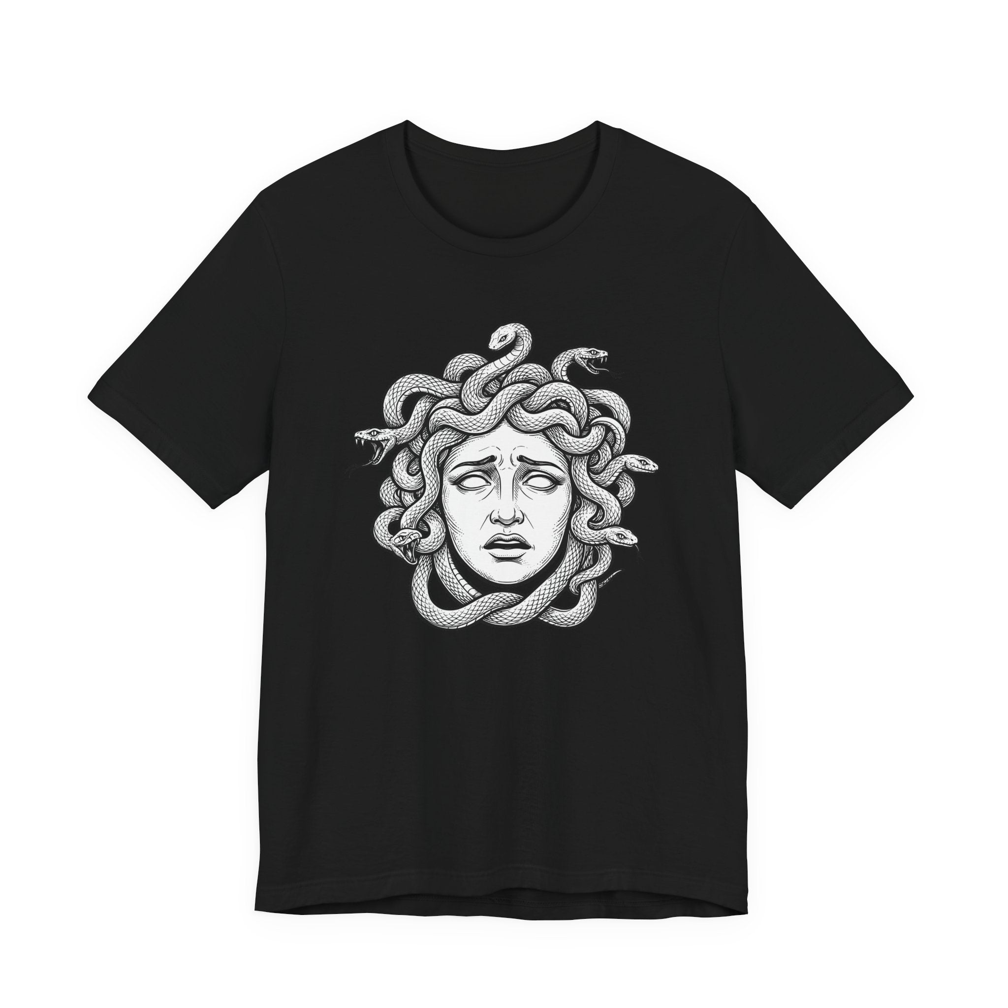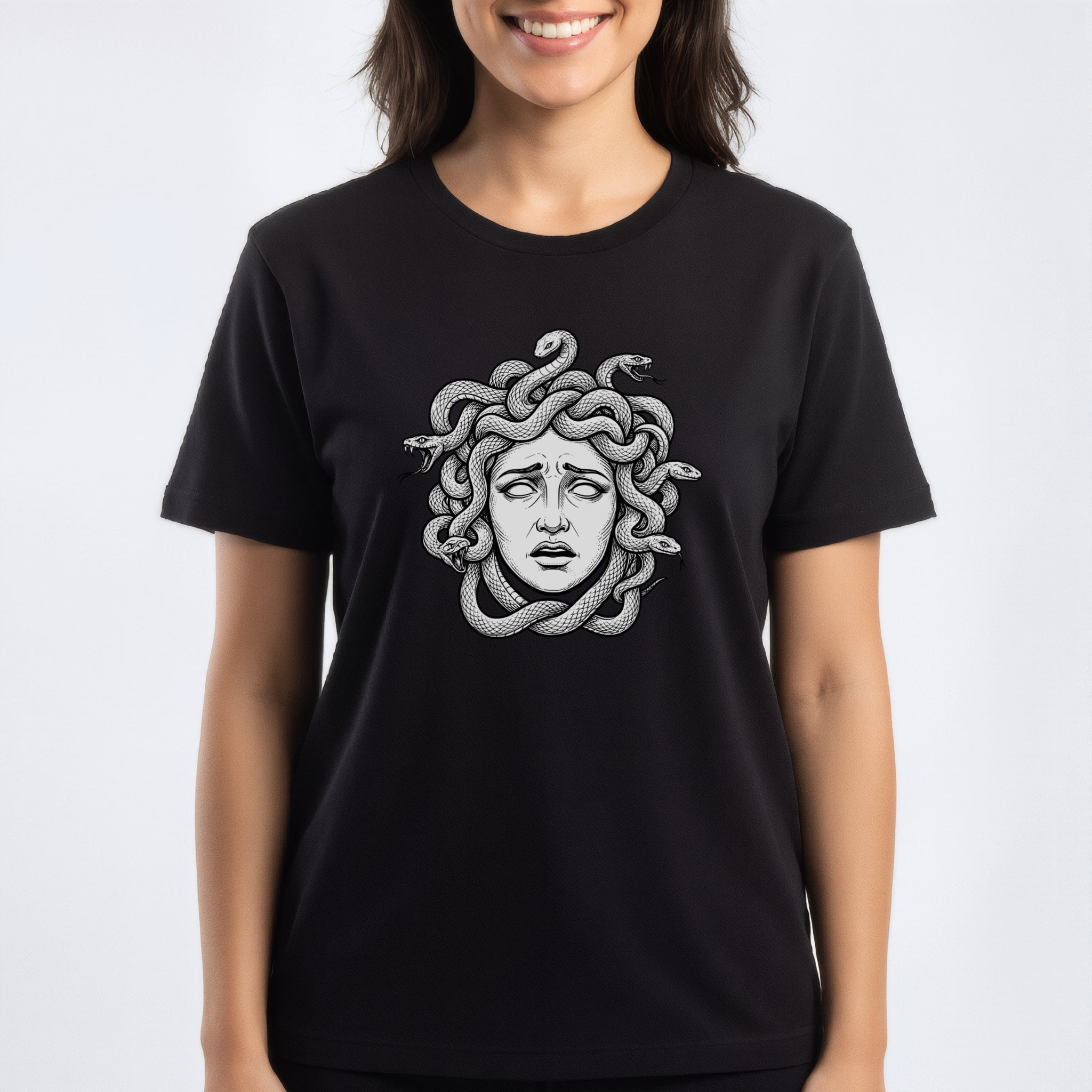 This t-shirt features a striking illustration of Medusa, the iconic figure from Greek mythology, rendered in a captivating white-on-black style. Her face exhibits an intricate and melancholic expression, framed by a crown of meticulously detailed, intertwined snakes that form her hair, each adding to the depth and drama of the artwork. Medusa is a powerful and multifaceted symbol, representing protection, transformation, and often, the tragic complexity of beauty intertwined with terror. This unique graphic offers a thought-provoking artistic interpretation of a classic myth, making it a bold and captivating statement piece for those who appreciate ancient stories and intricate, expressive design.