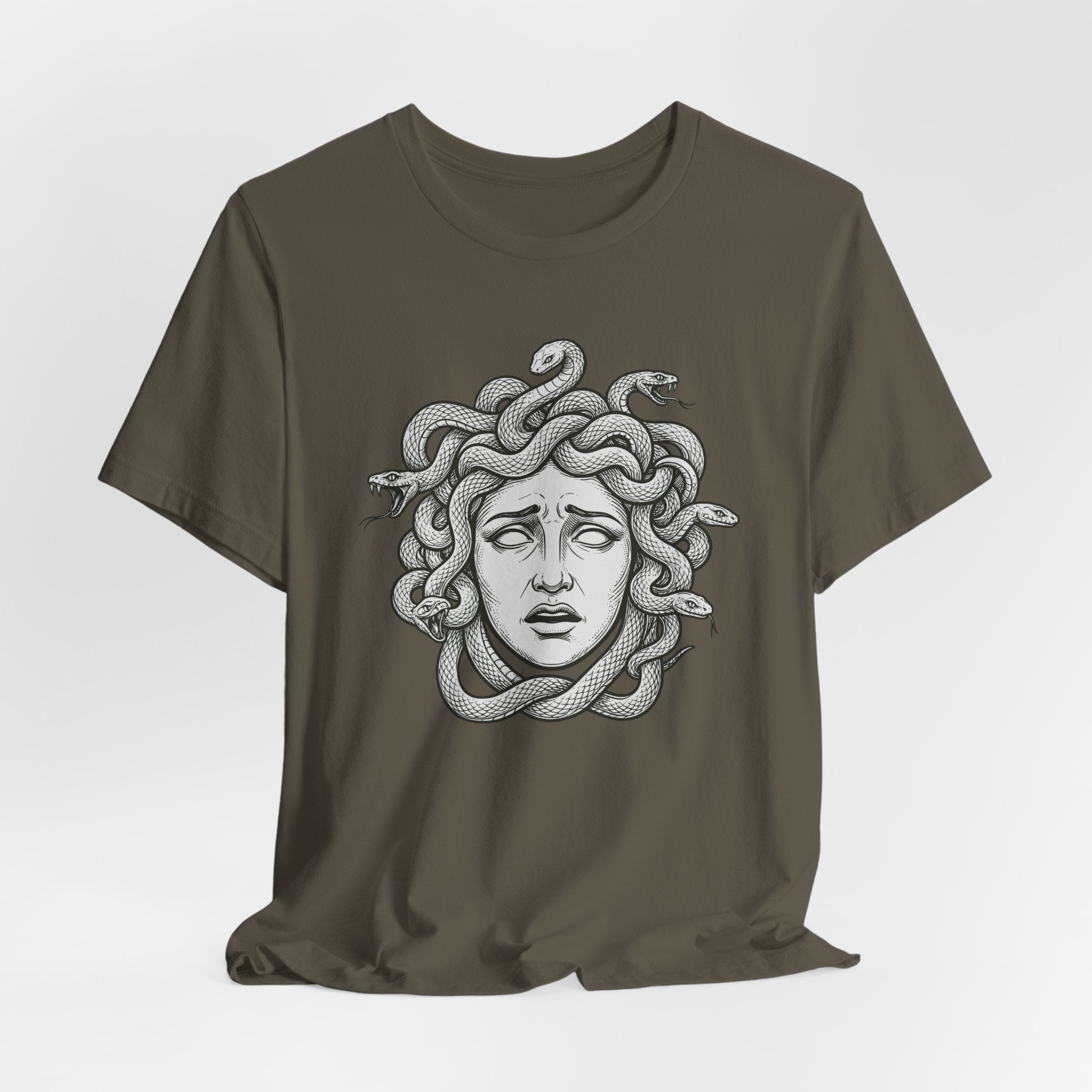 Pair this t-shirt with dark jeans or cargo pants for an edgy, mysterious look, or layer it under an open jacket to let the intricate design command attention. This versatile piece allows you to express your unique style and appreciation for powerful mythological narratives. Embrace the enigmatic and symbolic allure of Medusa with this stylish and deeply meaningful t-shirt.