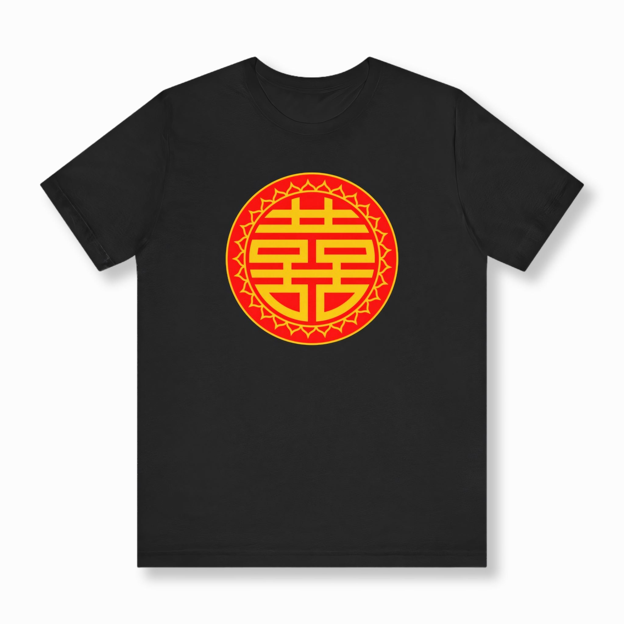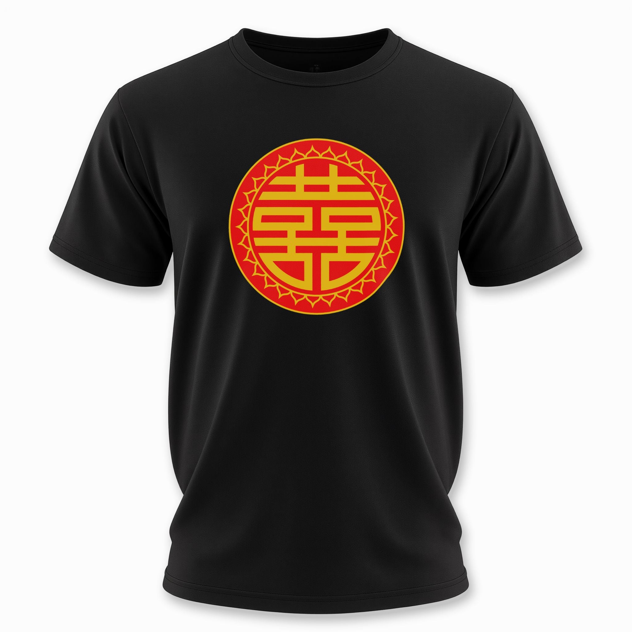 This t-shirt features a vibrant red and yellow circular emblem, showcasing the traditional Chinese 'Double Happiness' (囍) character. This iconic symbol, often seen at weddings and festive celebrations, is encircled by an auspicious red border, reflecting traditional Chinese artistry. The 囍 (xǐ) symbol is a powerful representation of marital bliss, good fortune, and enduring happiness, signifying joy shared between two people. It's a wish for double the joy and prosperity in life and love. This design is visually striking with its rich colors and classic style, carrying deep cultural significance, making it a unique statement piece for those who appreciate cultural heritage and positive symbolism.