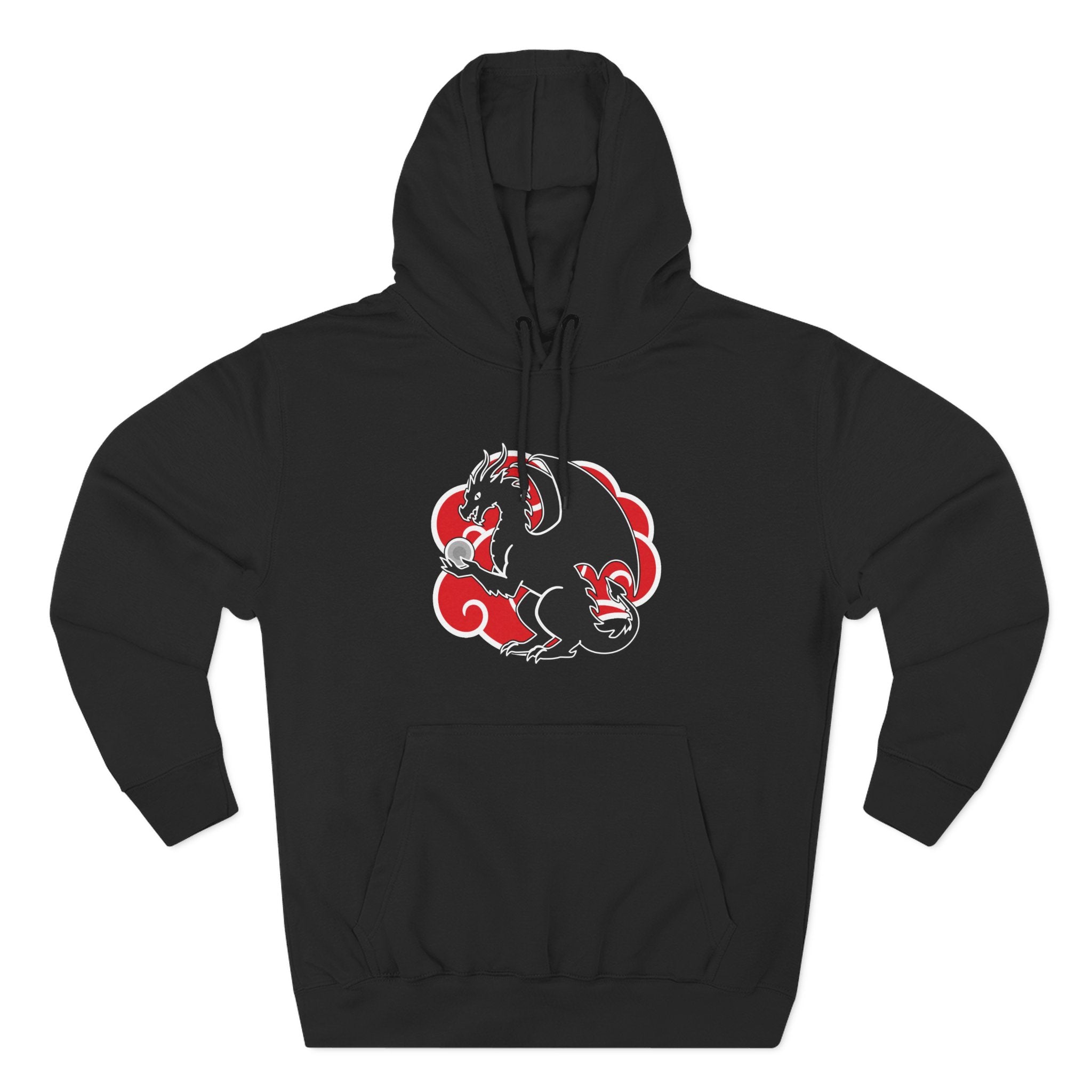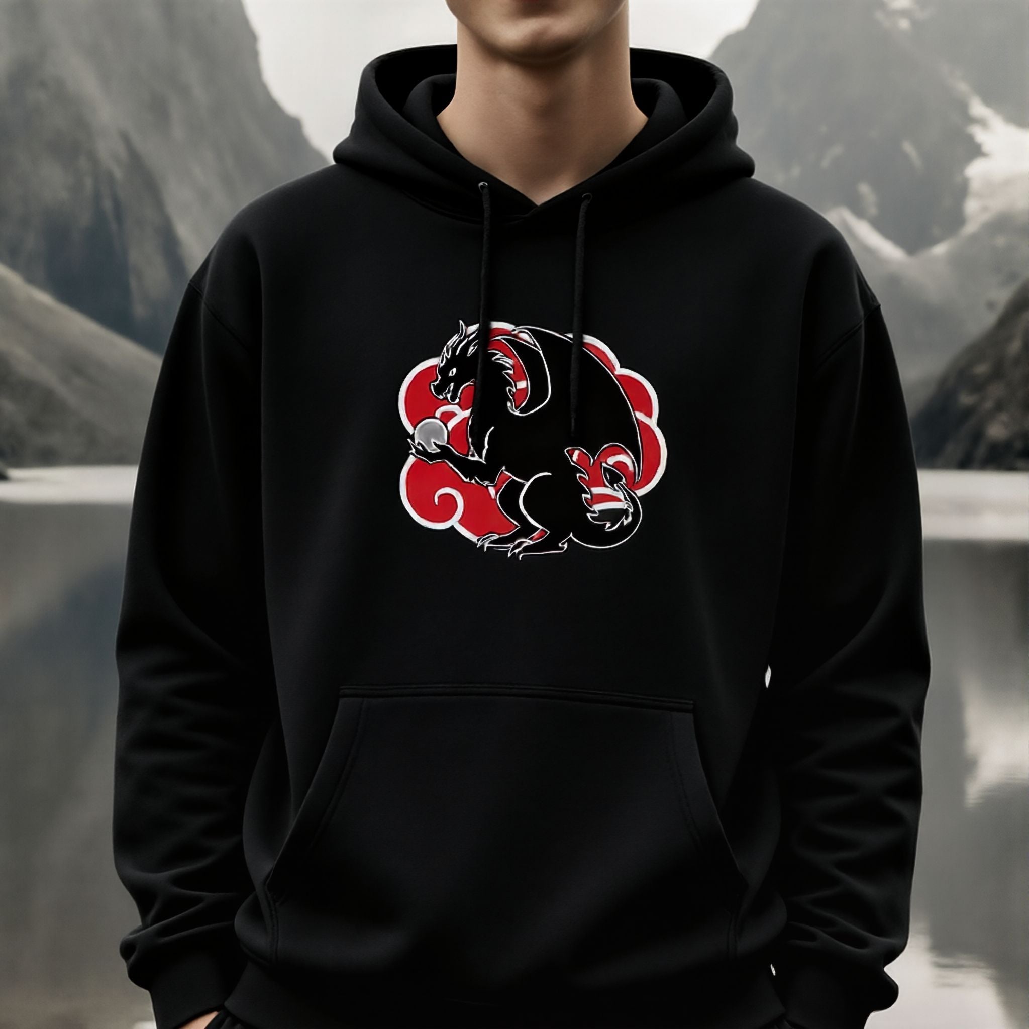 This hoodie features a majestic black dragon, intricately detailed and clutching a shimmering silver orb, all set against a vibrant, iconic red cloud with a clean white outline. In East Asian cultures, dragons are revered as powerful symbols of strength, wisdom, prosperity, and good fortune, often associated with the 'wisdom pearl' the dragon holds. The distinctive red cloud is a globally recognized symbol from modern pop culture, evoking themes of ambition, individuality, and a formidable presence. This graphic masterfully fuses ancient mythology with contemporary iconic imagery, creating a truly unique and compelling statement piece.