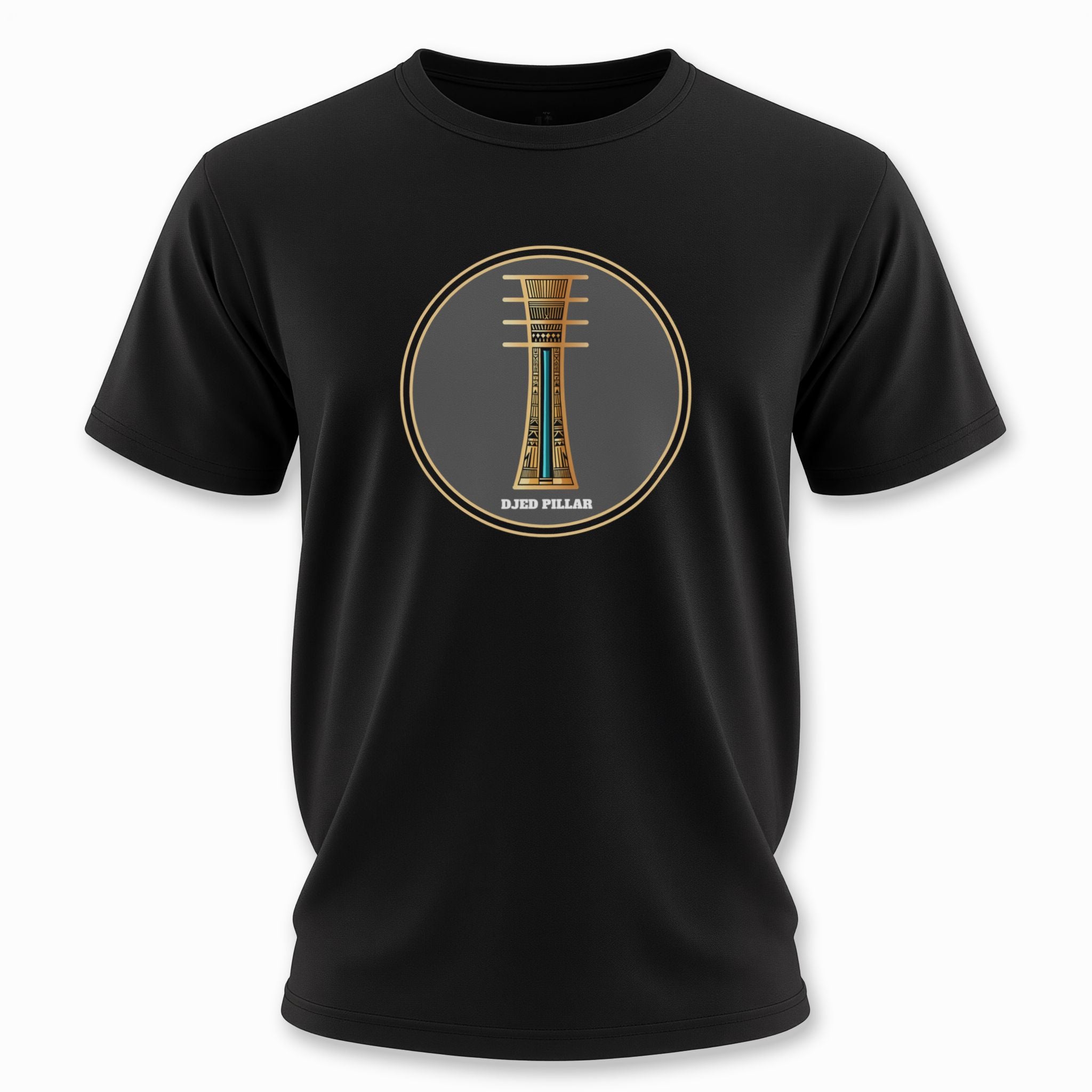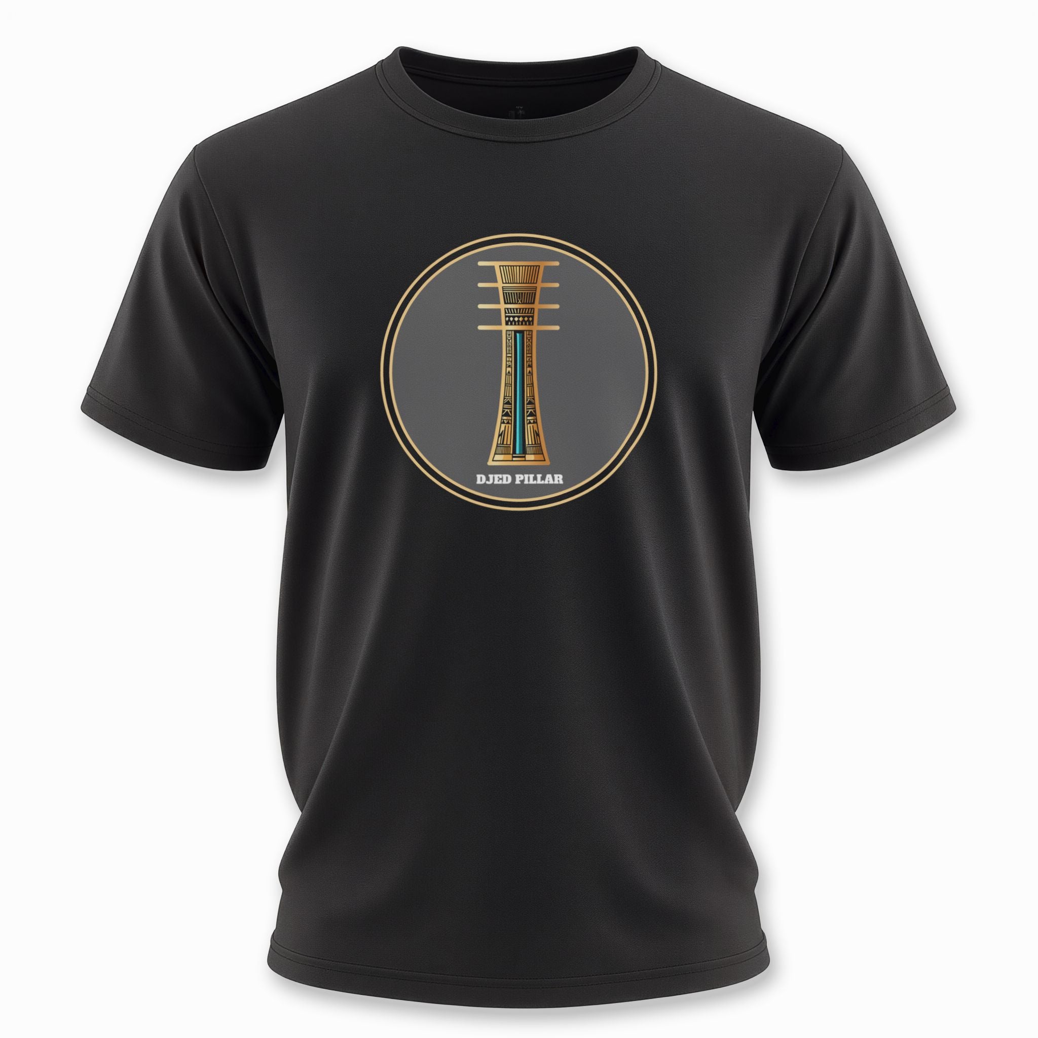 This t-shirt features an intricate, stylized graphic of the Djed pillar, a prominent symbol in ancient Egyptian culture, rendered in gold with teal accent colors on a black tee. The design is characterized by its geometric precision and hieroglyphic-like detailing. This unique graphic is perfect for those who appreciate art, symbolism, and the ancient Egyptian aesthetic. The design is bold and eye-catching, making it a standout piece for any wardrobe.
