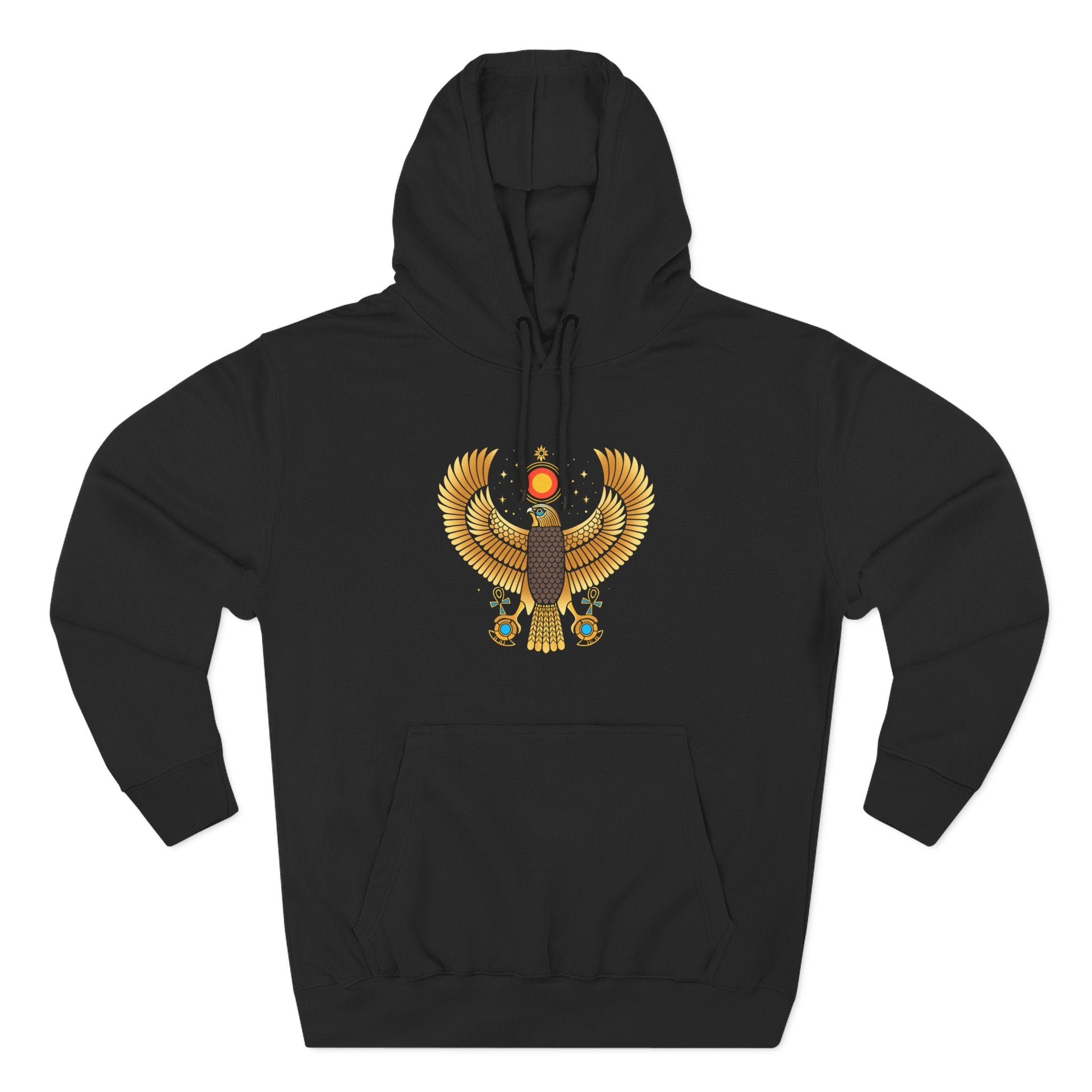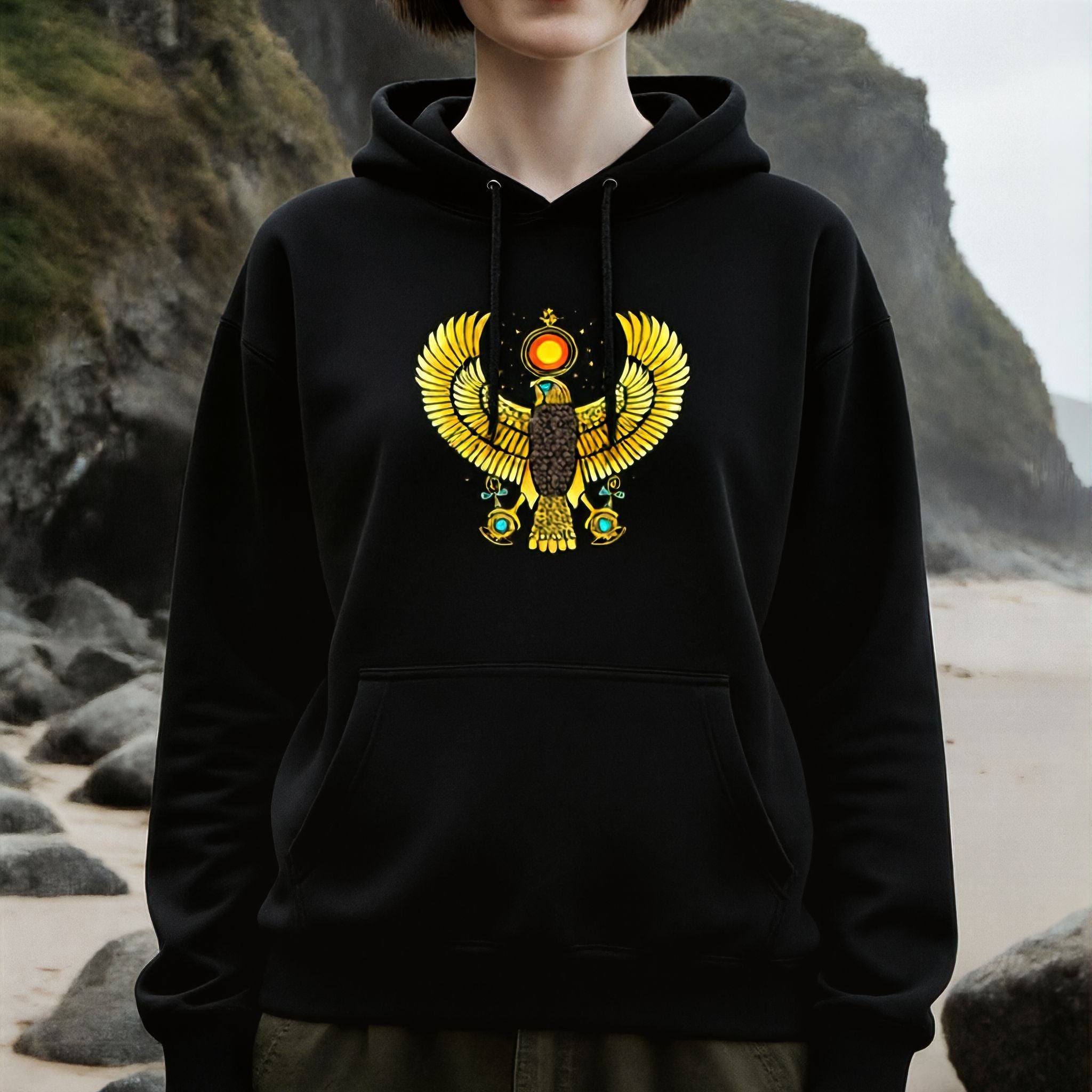 This hoodie features a majestic golden falcon with outstretched wings, adorned with the iconic sun disk and uraeus cobra, symbolizing the ancient Egyptian god Ra. Below, two ankh symbols cradle scarab beetles, set against a celestial backdrop of stars. Ra, the ancient sun god, represents creation, divine power, and the life-giving energy of the sun. The ankh signifies eternal life, and the scarab beetle embodies rebirth and transformation. Together, these elements evoke themes of ancient wisdom, cosmic power, and everlasting vitality. The intricate details and vibrant golden hues make this design truly captivating, a powerful statement piece for those drawn to ancient mythology and spiritual strength.