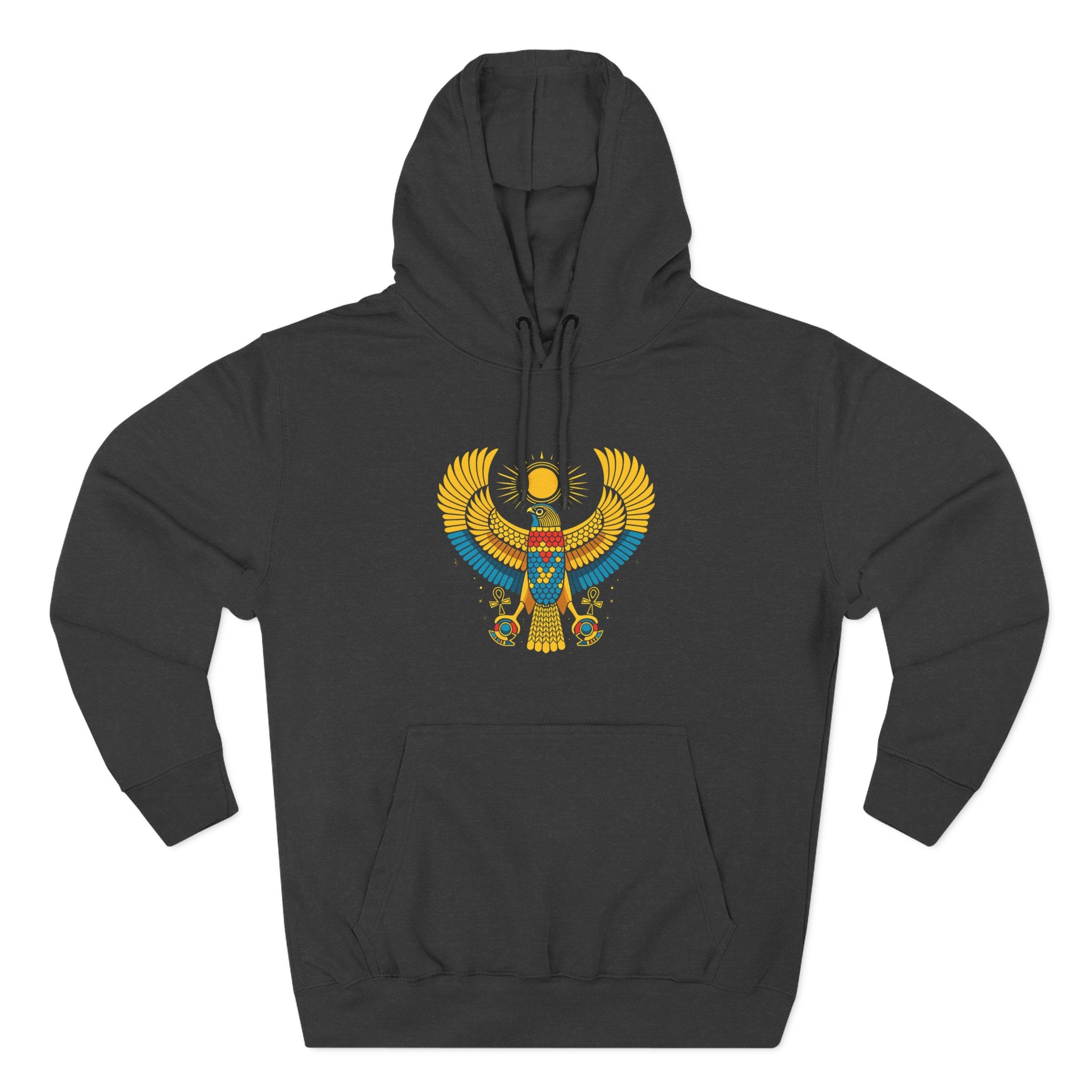 This hoodie showcases a majestic depiction of the ancient Egyptian sun god Ra, envisioned as a powerful falcon with outstretched wings. Crowned with the radiant sun disk and flanked by intricate details including ankh symbols, this vibrant design embodies divine power, creation, and the life-giving energy of the sun. Its rich colors and meticulous artistry make it a striking tribute to Egyptian mythology, perfect for those who appreciate history, spirituality, and bold artistic expression. A true conversation starter and a unique addition to any collection.