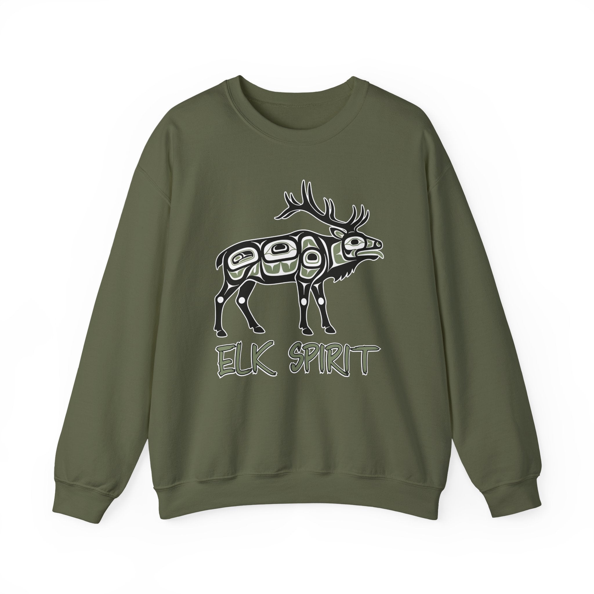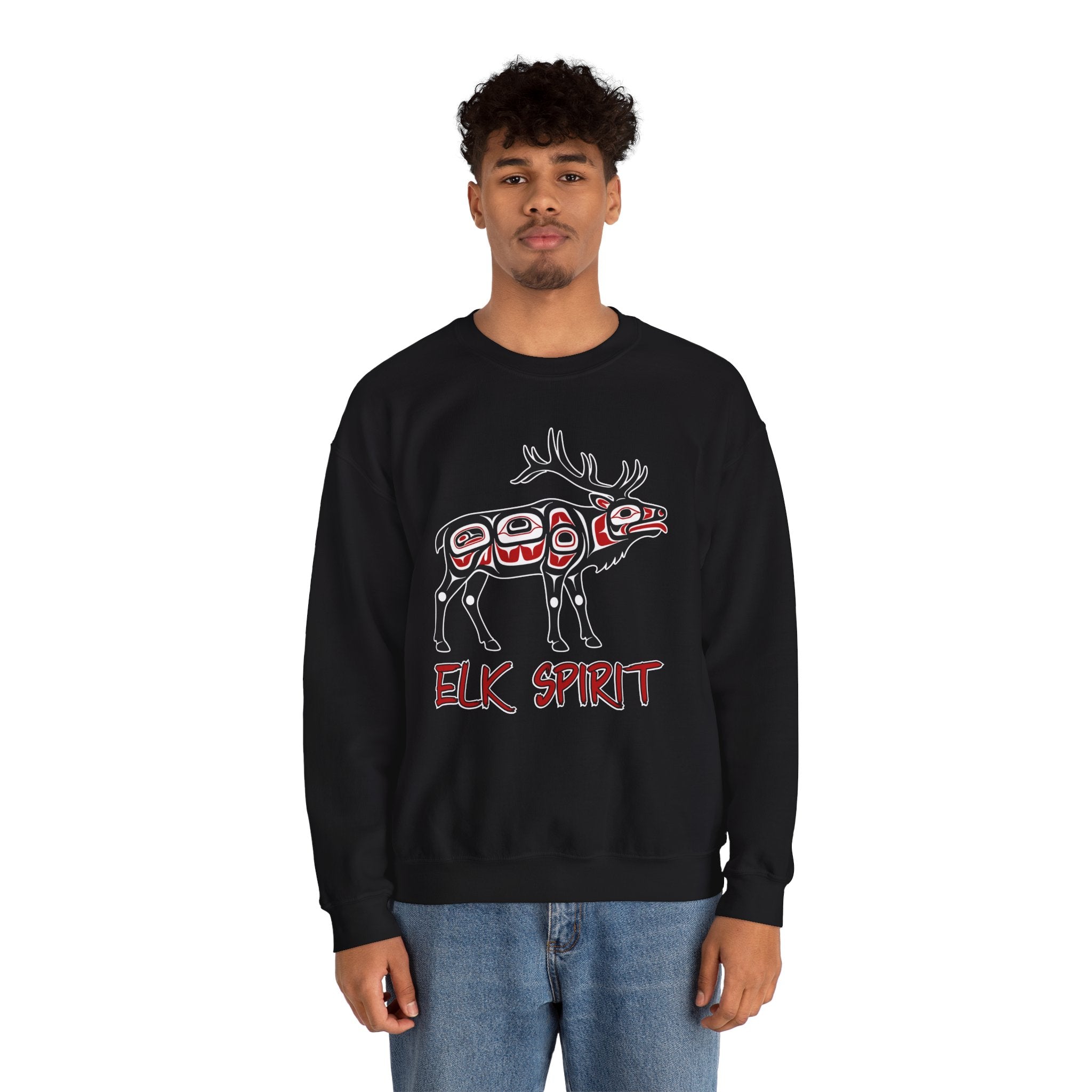 This sweatshirt features a powerful depiction of an elk in the distinctive Northwest Coast Native American (Haida/Tlingit) art style, characterized by its bold white formline outlines and vibrant red internal details. The design, accompanied by the text "ELK SPIRIT," embodies the essence of strength, nobility, endurance, and a deep connection to the wilderness. This intricate graphic is a celebration of indigenous artistry and the profound symbolism of the elk, making it a unique and visually captivating statement piece for any wardrobe.