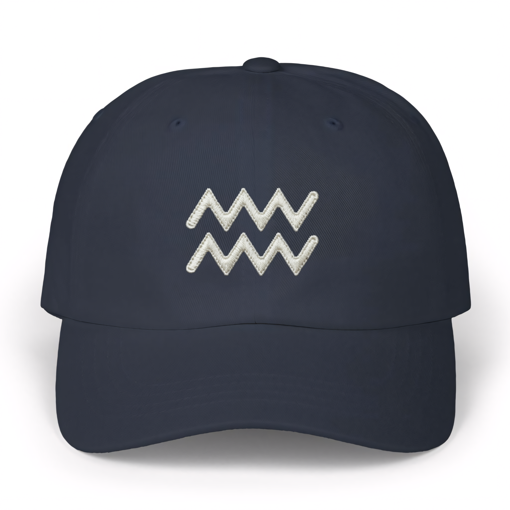 This hat features the distinct Aquarius zodiac symbol, intricately embroidered in crisp white on a classic dad cap. The two wavy lines, emblematic of the Water Bearer, symbolize knowledge, innovation, and the free flow of progressive ideas. It embodies the core essence of the Aquarius sign: independent, intellectual, and humanitarian. This design is a minimalist yet powerful statement piece, perfect for those who proudly identify with their zodiac sign or appreciate celestial symbolism.