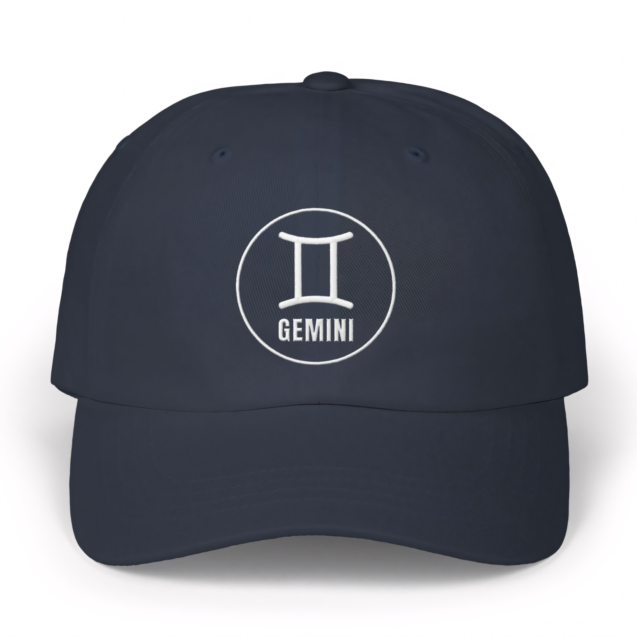 This hat features a crisp, white embroidered outline of the iconic Gemini zodiac symbol, elegantly encased within a clean circle, with "GEMINI" neatly stitched below. Set against a classic dad cap, this design subtly yet powerfully represents the astrological sign. The Gemini symbol, often depicted as twins, embodies duality, intellect, versatility, and communication, reflecting the curious and expressive nature of those born under this air sign. This minimalist yet impactful design is perfect for Geminis proud to showcase their astrological identity, making it a stylish and meaningful accessory for any wardrobe.
