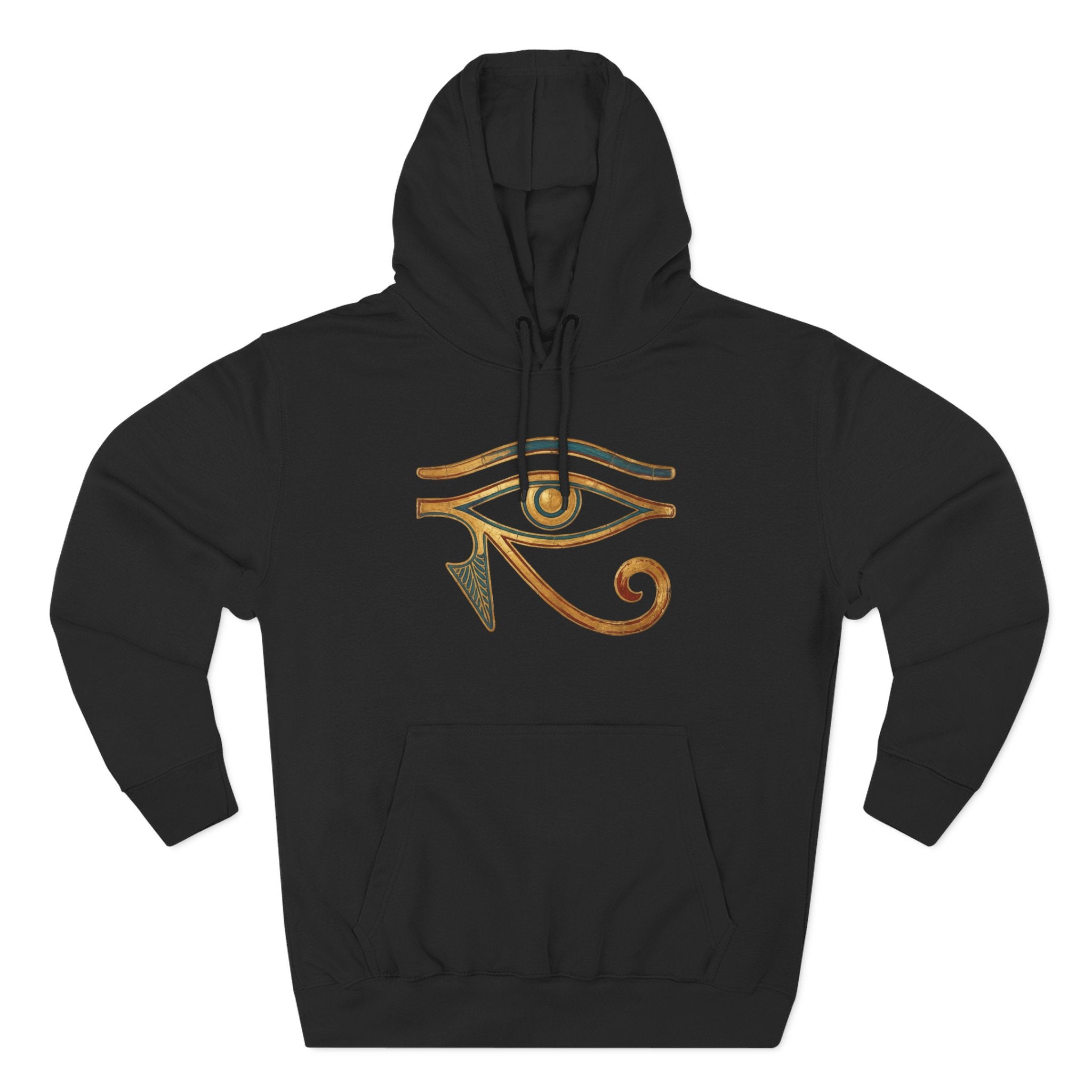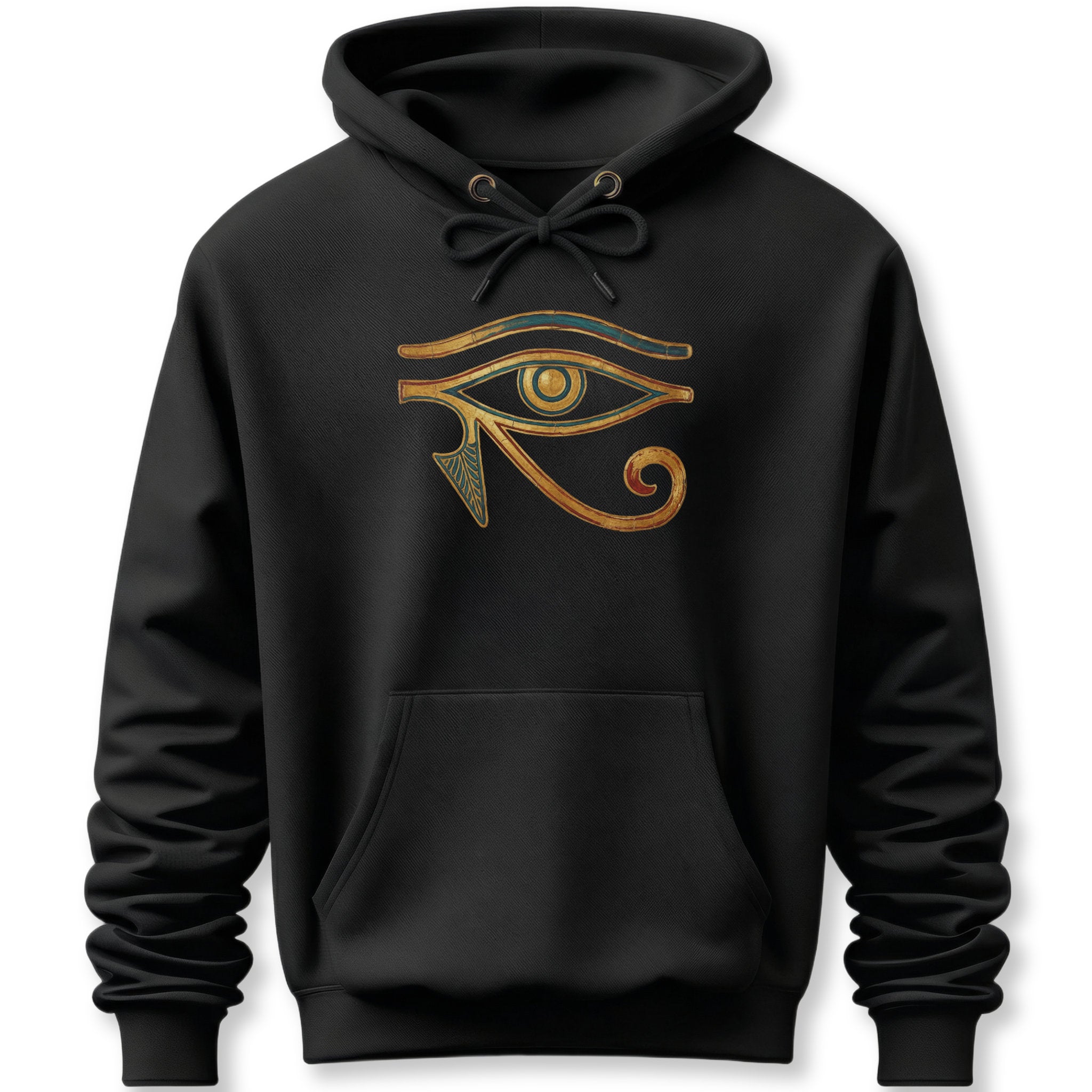 This hoodie features a stunning depiction of the ancient Egyptian Eye of Horus, rendered with an intricate, aged metallic texture in warm gold and bronze tones, highlighted by subtle teal accents. The Eye of Horus, also known as Wadjet or Ujat, is a powerful protective symbol from ancient Egypt, representing good health, restoration, and royal power. Its rich historical significance and detailed artistry make it a striking and meaningful design, perfect for those who appreciate ancient cultures, profound symbolism, and unique artwork. This exceptional piece is sure to be a conversation starter and a standout addition to any wardrobe.