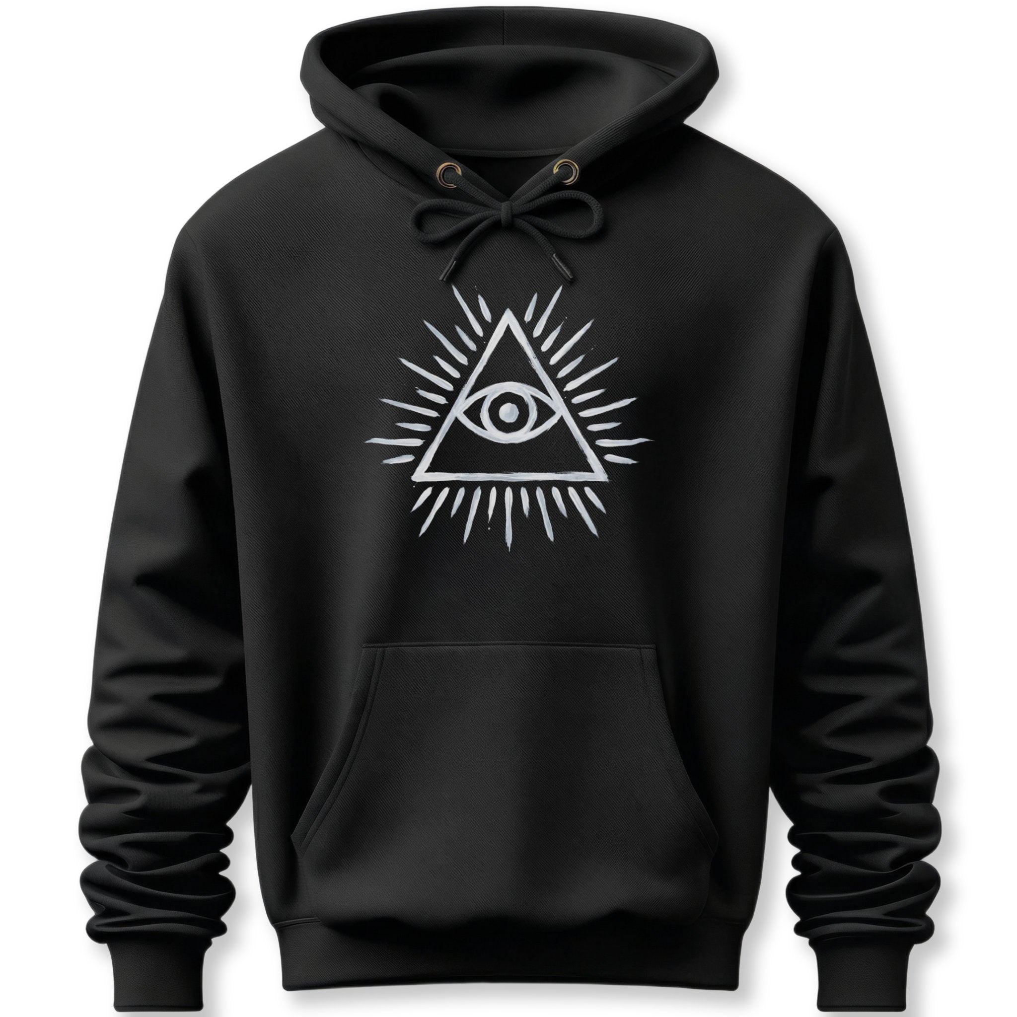 This hoodie features a striking white graphic of the Eye of Providence, encased within a radiant triangle. The iconic symbol, often referred to as the All-Seeing Eye, represents divine watchfulness, spiritual enlightenment, wisdom, and cosmic consciousness. It suggests a higher power or awareness overseeing humanity, offering protection and insight. This unique graphic is perfect for those drawn to ancient symbols, mysticism, and deeper spiritual meanings. The design is bold and thought-provoking, making it a standout piece that sparks curiosity and conversation.