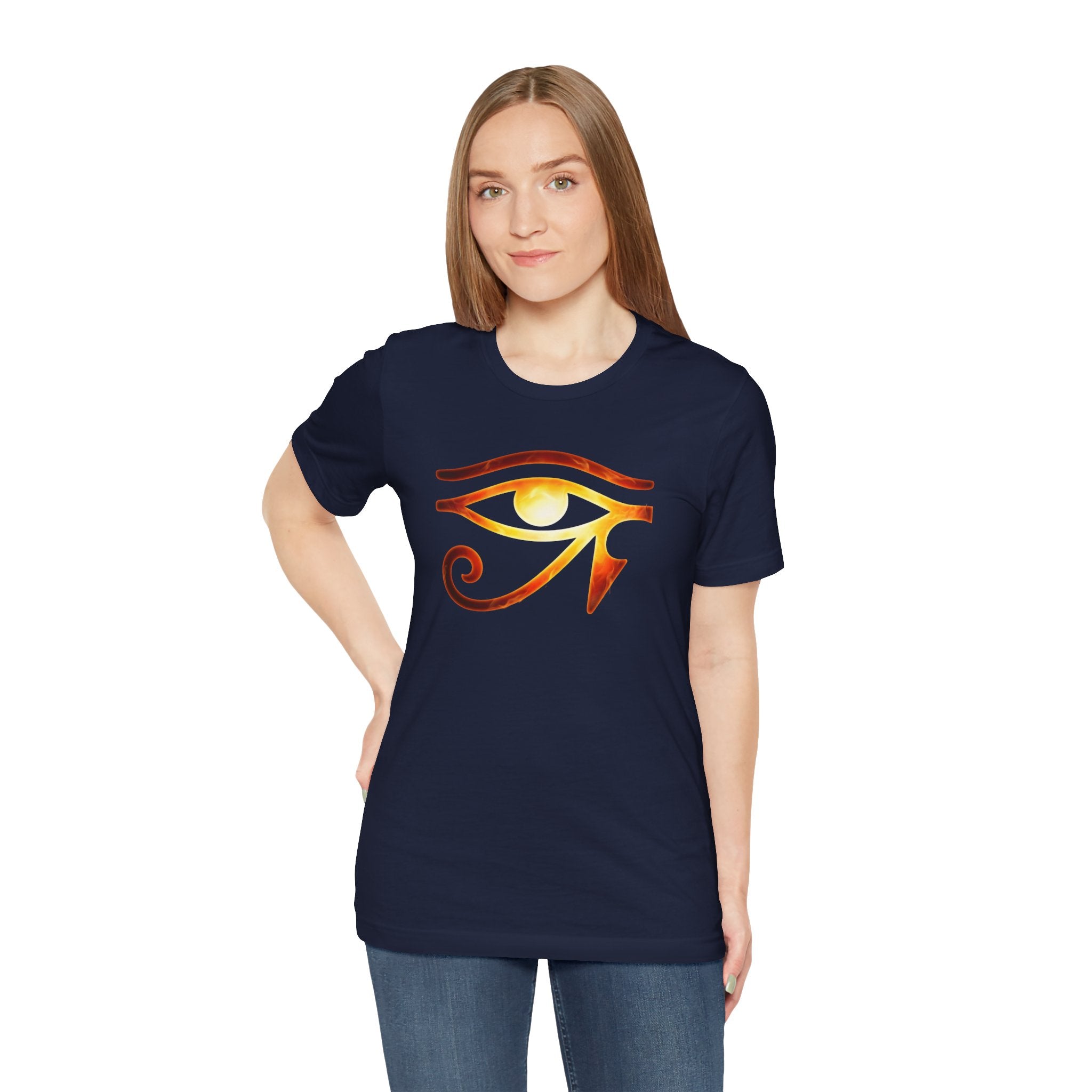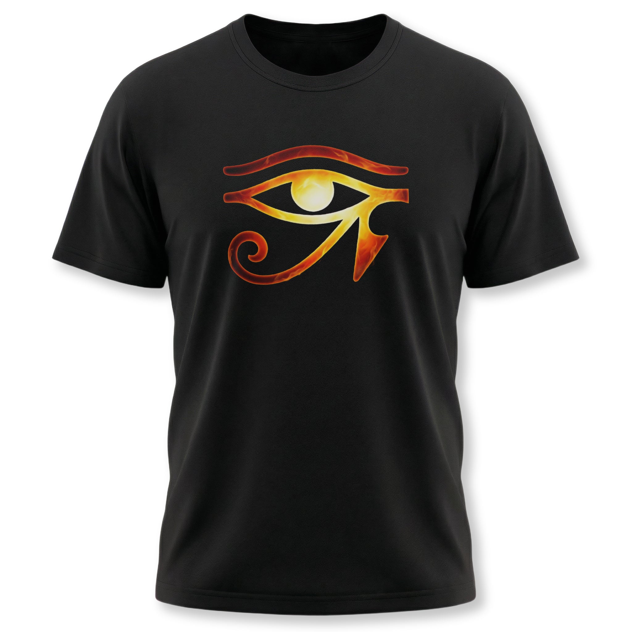 This t-shirt features a vibrant depiction of the Eye of Ra, glowing with fiery orange and yellow hues, giving it an energetic and powerful aura. The Eye of Ra is an ancient Egyptian symbol representing divine power, protection, and the radiant energy of the sun god Ra. This striking graphic makes a bold and mystical statement, perfect for those who appreciate ancient symbolism and captivating designs.