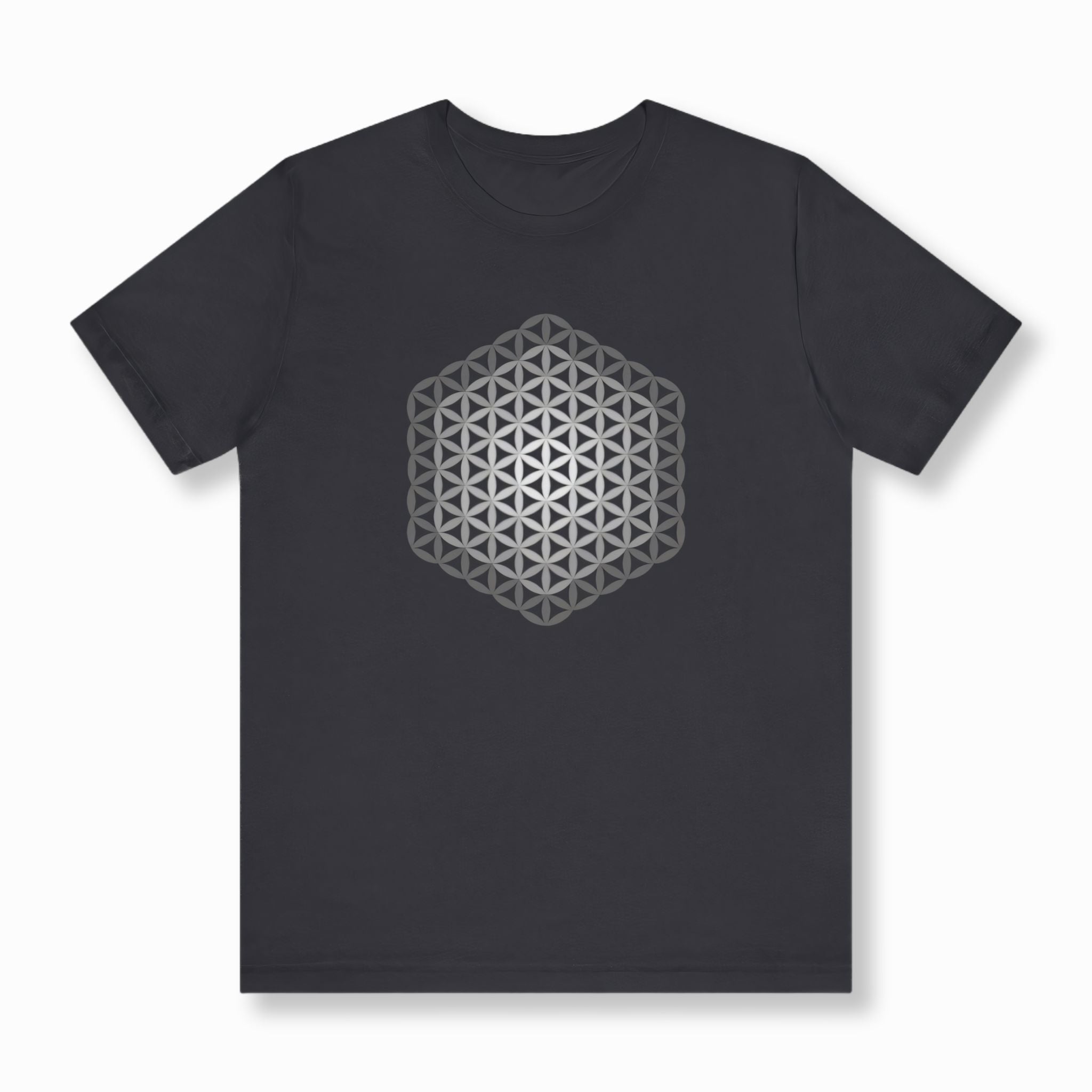 This t-shirt features an intricate and mesmerizing hexagonal design of the Flower of Life in a stunning metallic grey gradient, beautifully contrasting against the dark fabric. The Flower of Life is a profound symbol of sacred geometry, representing the fundamental patterns of creation, interconnectedness, and the blueprint of the universe. It is believed to contain all patterns of existence within its harmonious form. Its intricate details and balanced structure make it more than just a design; it's a statement of cosmic connection and spiritual understanding. This unique graphic is perfect for those who appreciate deep symbolism, geometric art, and a visual representation of universal harmony, making it a standout piece for any wardrobe.