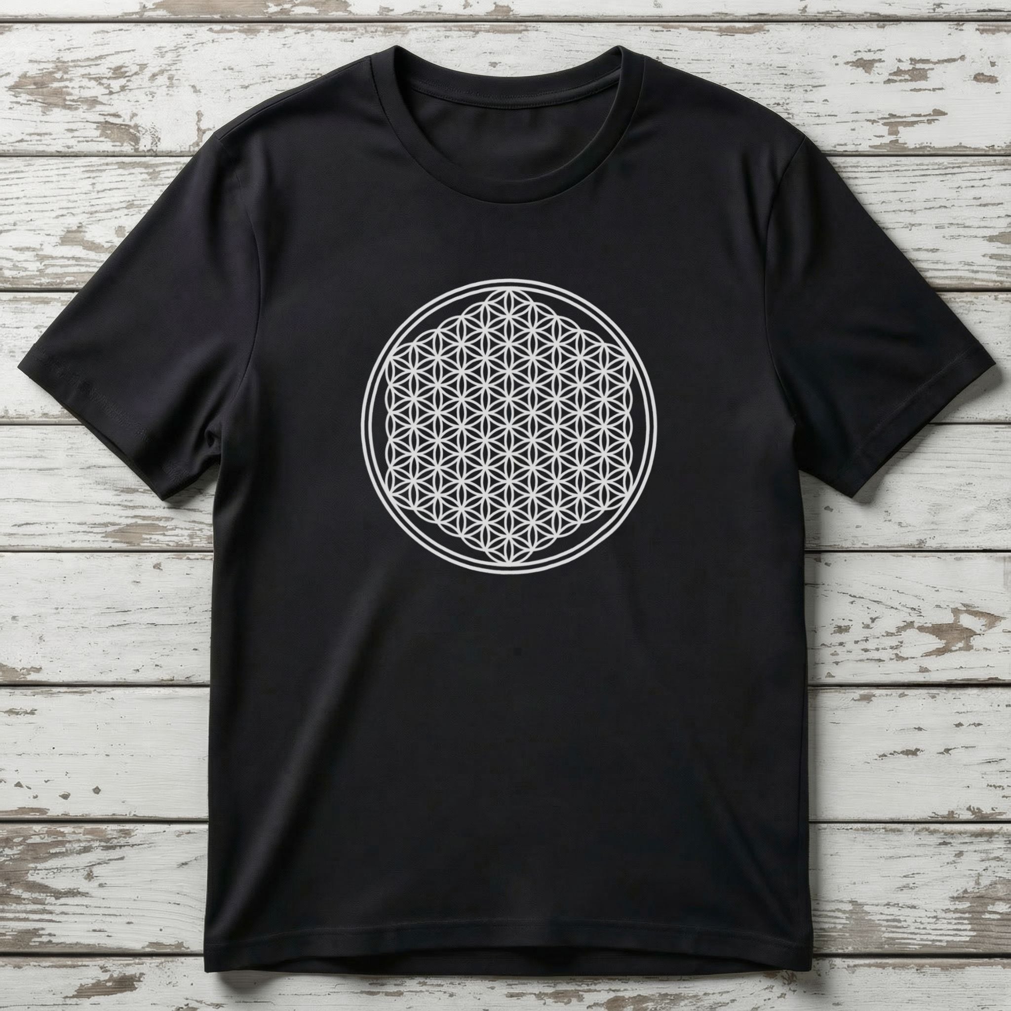 This t-shirt features a striking white outline of the intricate Flower of Life symbol, perfectly centered within a double circle on a classic black background. The Flower of Life is an ancient sacred geometry symbol, representing the interconnectedness of all life in the universe. It embodies creation, cosmic unity, and contains fundamental patterns for existence. This powerful and visually captivating design offers a profound statement, making it a unique and meaningful addition to any wardrobe.