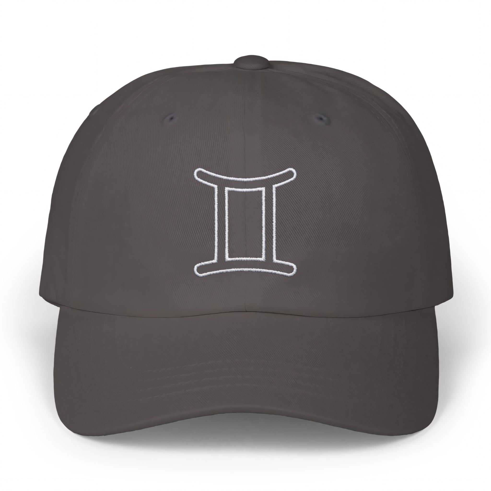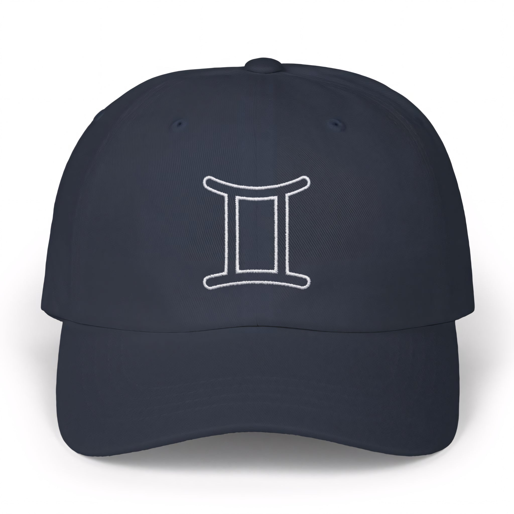 This hat features a crisp, white outline embroidery of the iconic Gemini astrological symbol. The Gemini symbol, often depicted as Roman numerals II or linked twins, represents the duality, intellect, and communicative nature of those born under this air sign (May 21 - June 20). It embodies versatility, curiosity, and a vibrant social spirit. This minimalist yet powerful design is perfect for proud Geminis or anyone who appreciates celestial symbolism, making it a subtle yet strong statement piece for any wardrobe.