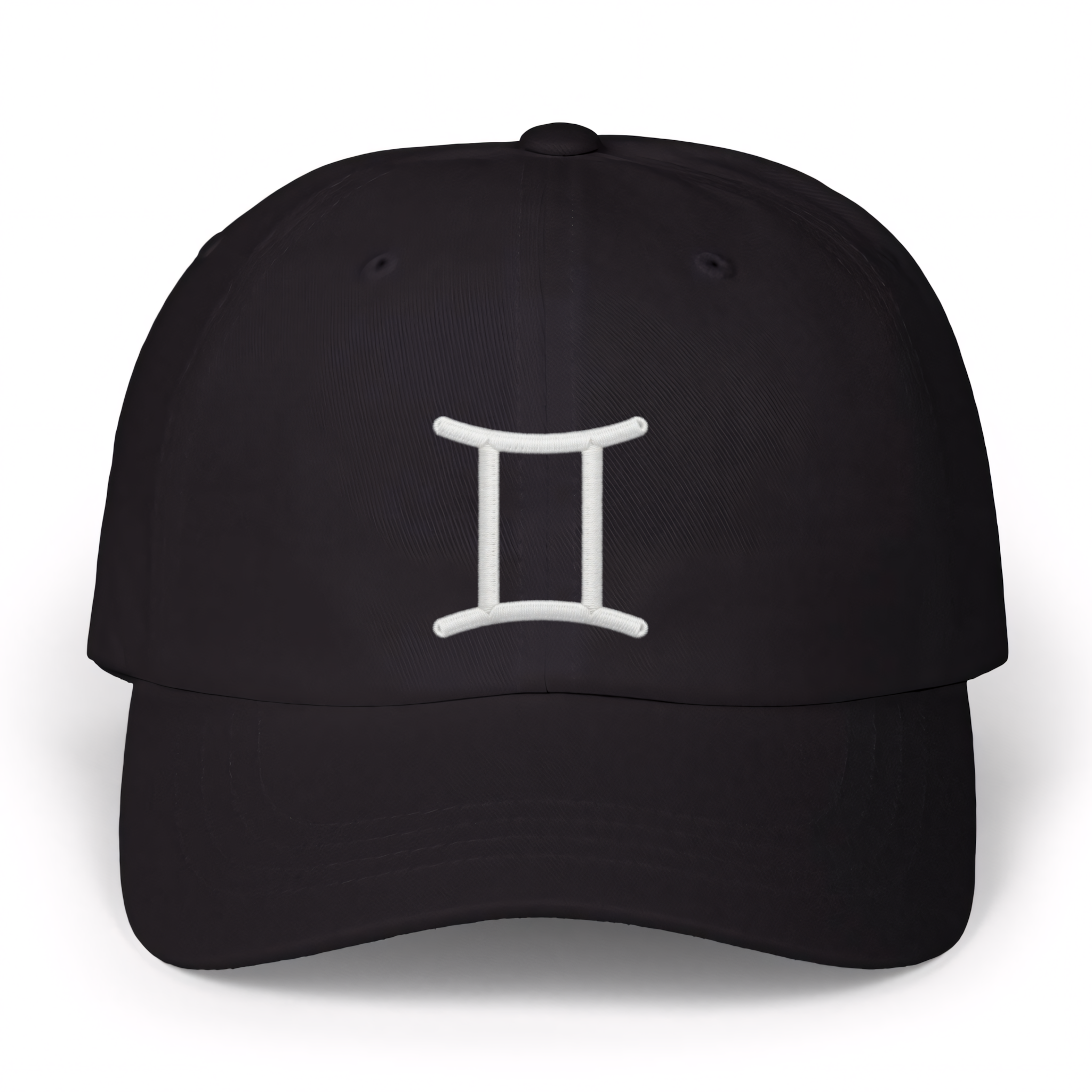 This hat features a sleek, white embroidered design of the Gemini zodiac symbol against a classic backdrop. The iconic symbol, resembling the Roman numeral II, elegantly represents "The Twins" and the inherent duality of the Gemini personality. It's a minimalist yet powerful graphic, perfect for those born under this witty air sign or anyone who appreciates celestial and astrological symbolism. The design is clean and recognizable, making it a subtle yet meaningful statement piece for any wardrobe.