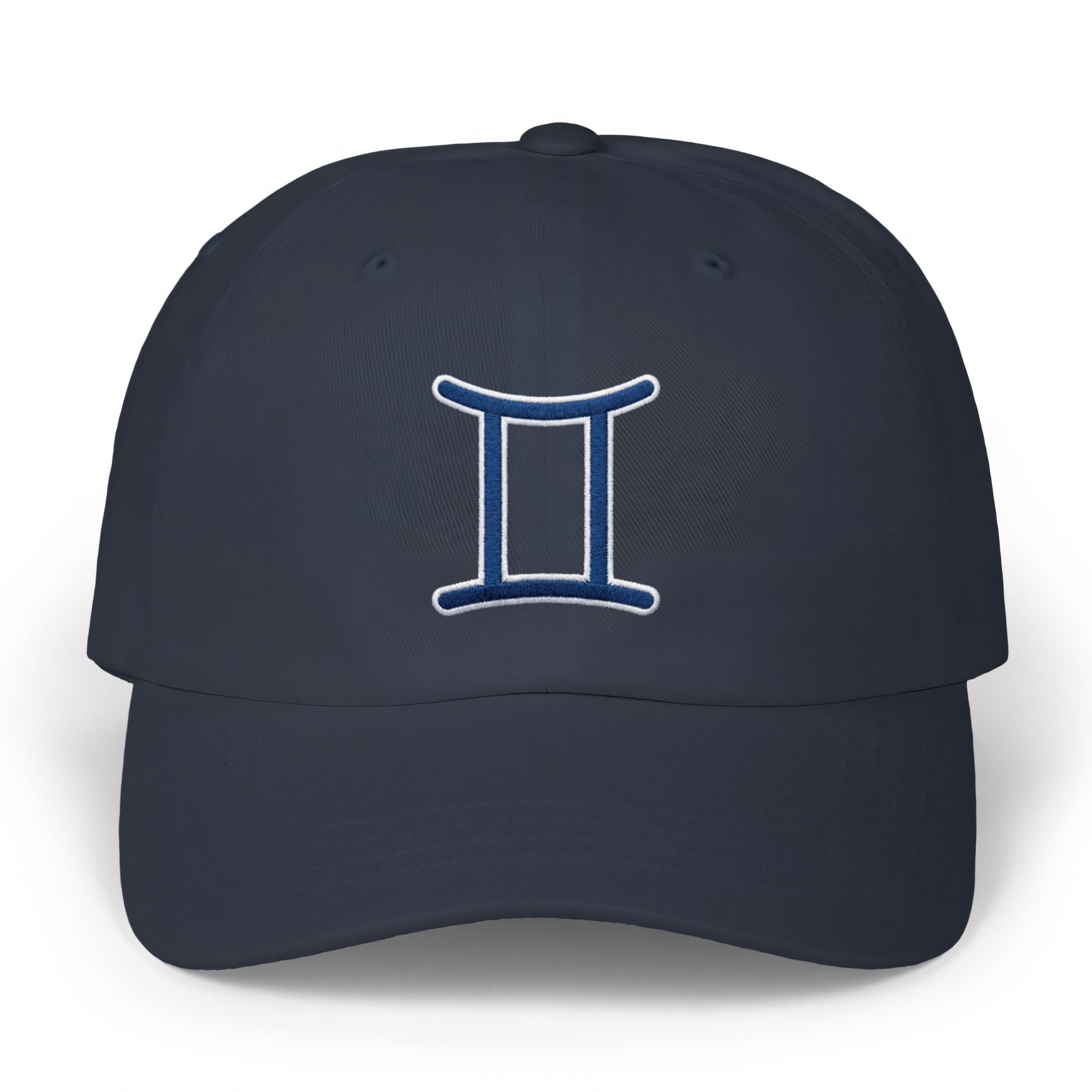 This hat features the iconic Gemini zodiac symbol, elegantly embroidered in a striking blue with a crisp white outline. The Gemini symbol, often representing twins, embodies duality, communication, curiosity, and adaptability. It's perfect for those born under this air sign (May 21 - June 20) or anyone who resonates with its dynamic and expressive energy. This design offers a chic and subtle way to showcase your astrological identity, making it a unique and personal accessory.