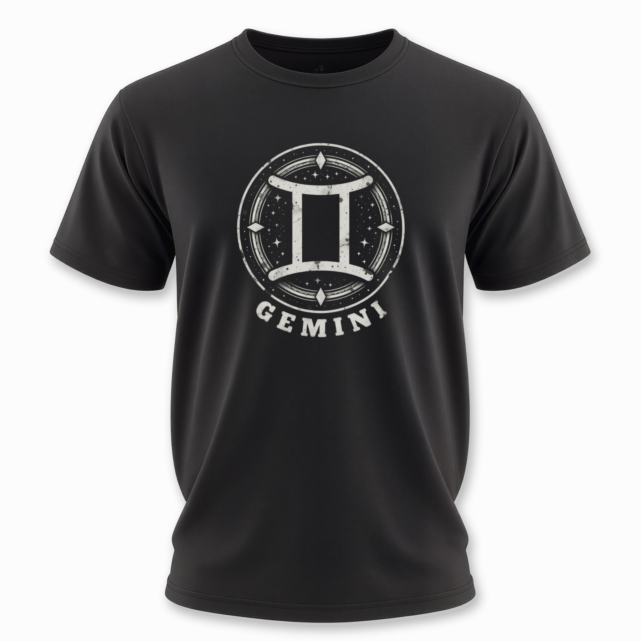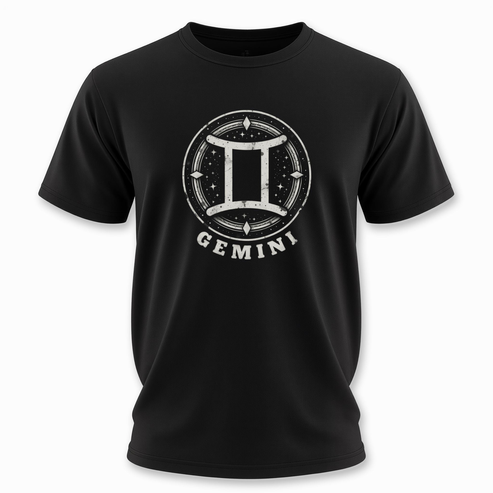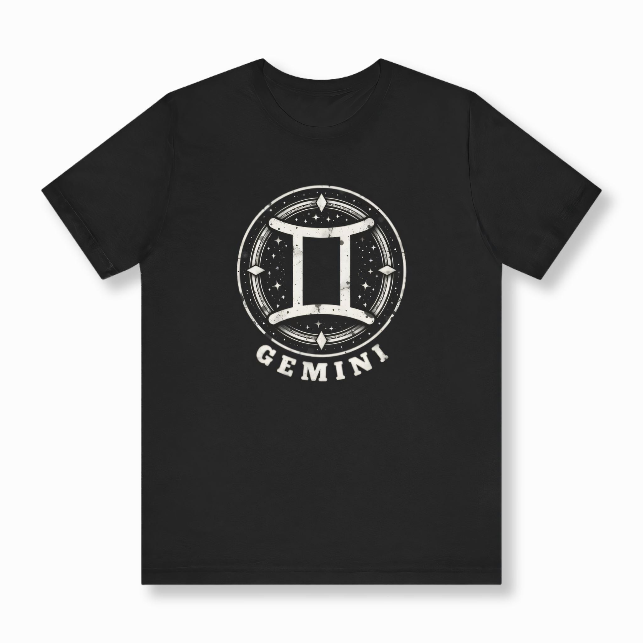This t-shirt features a striking white Gemini zodiac symbol encircled by a vintage-inspired design, complete with celestial accents and the word "GEMINI" emblazoned below. The Gemini symbol, representing twins, embodies duality, communication, and adaptability. This unique graphic is perfect for those who resonate with astrological symbolism and appreciate eye-catching designs. Its intricate details make it a conversation starter, a standout piece for any wardrobe.