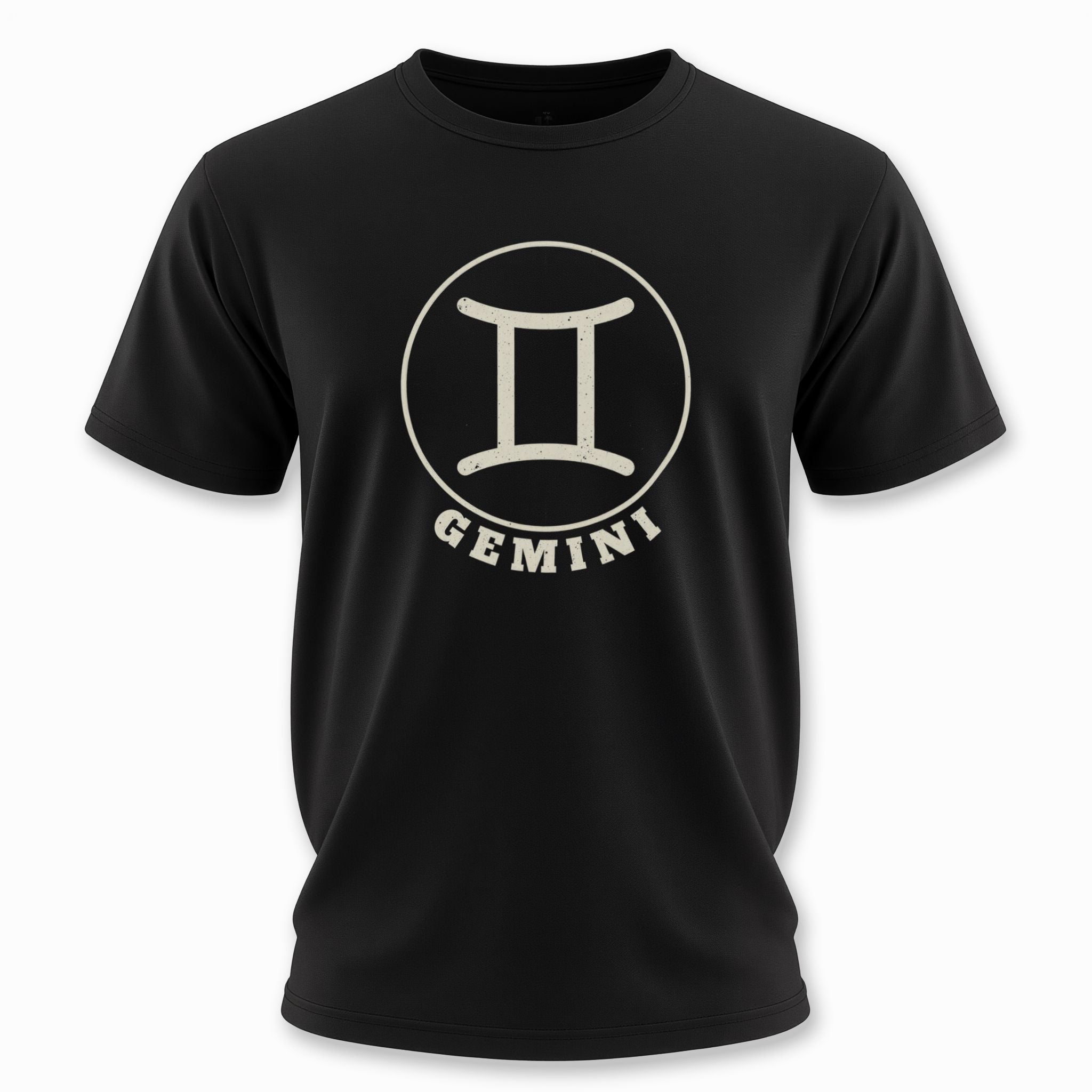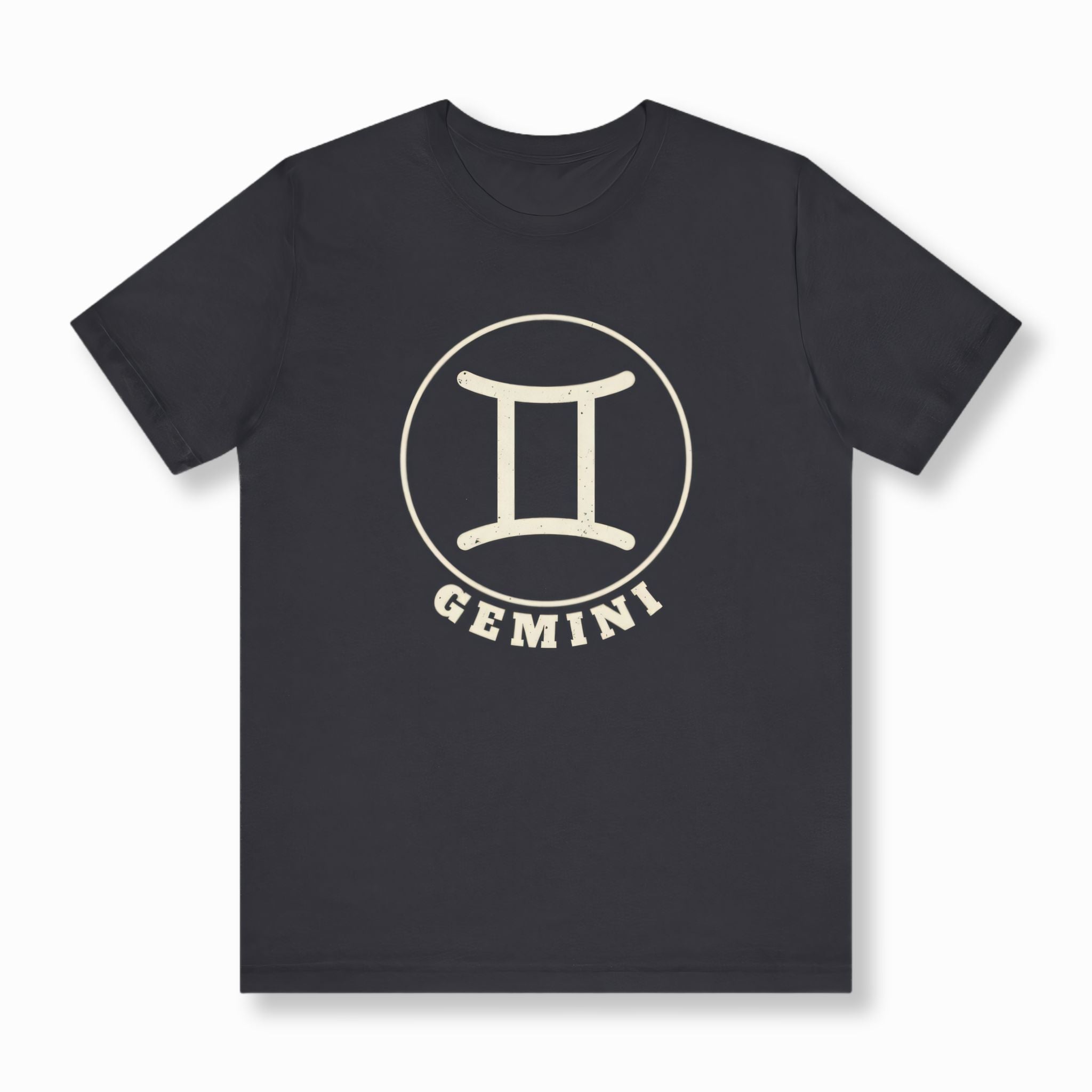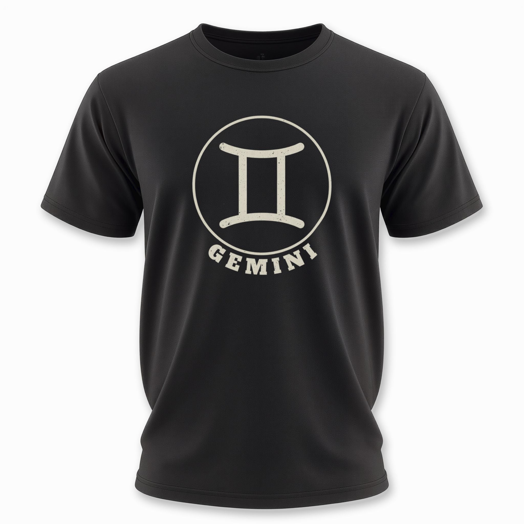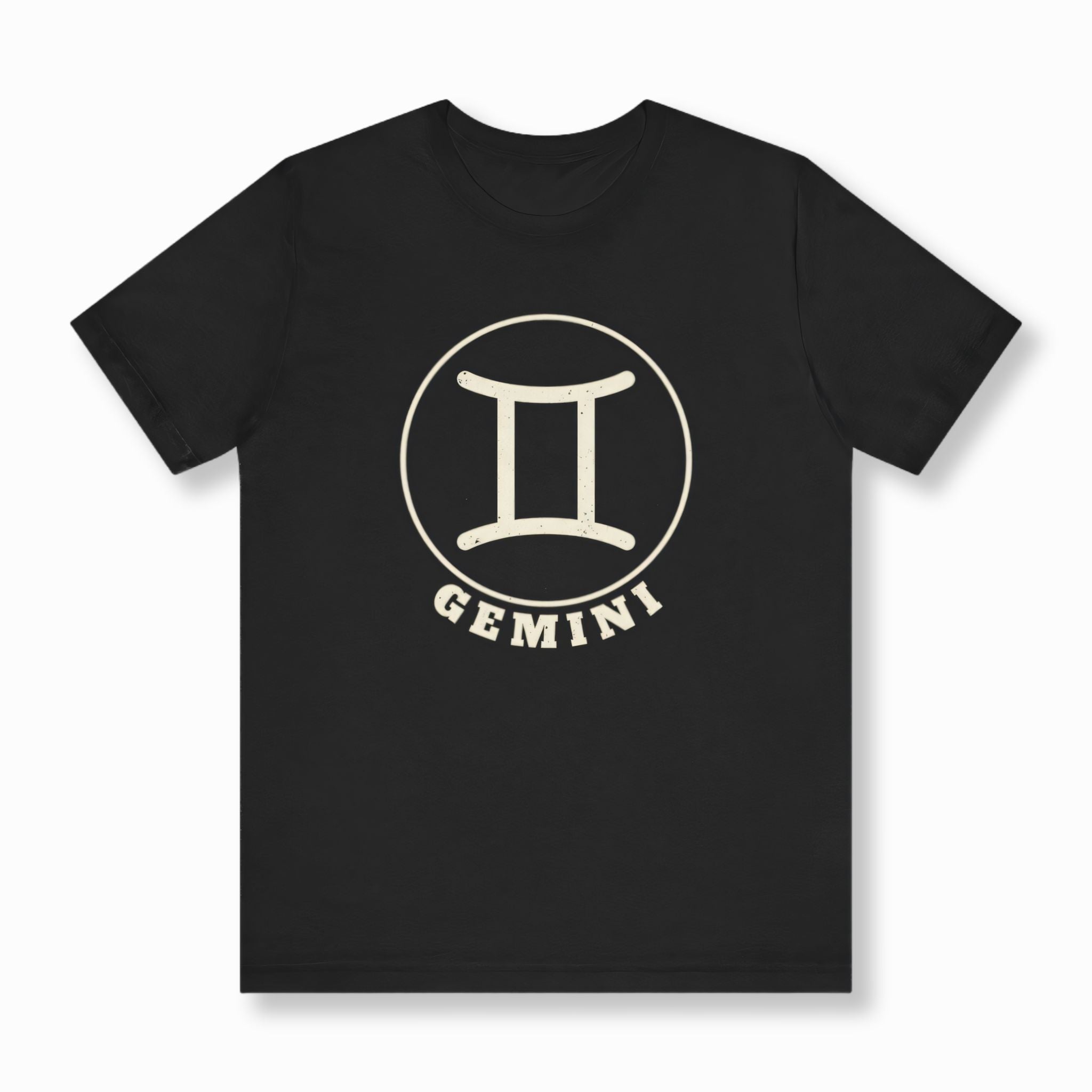 This t-shirt features a clean, minimalist design of the Gemini zodiac symbol encircled by a ring, with the word "GEMINI" displayed beneath in a vintage-style font. The design exudes a classic, understated aesthetic, perfect for astrology enthusiasts and those born under the sign of the twins. The Gemini symbol represents duality, communication, and intellectual curiosity, making it a bold yet subtle statement piece.